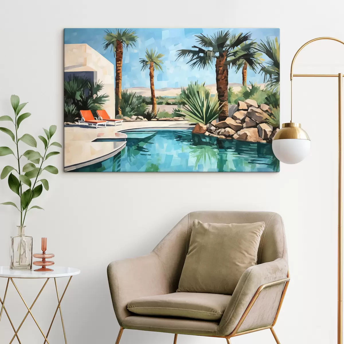 Picture Palm trees near the hotel with a swimming pool near the rocks, blue, green, red color Nr s40748