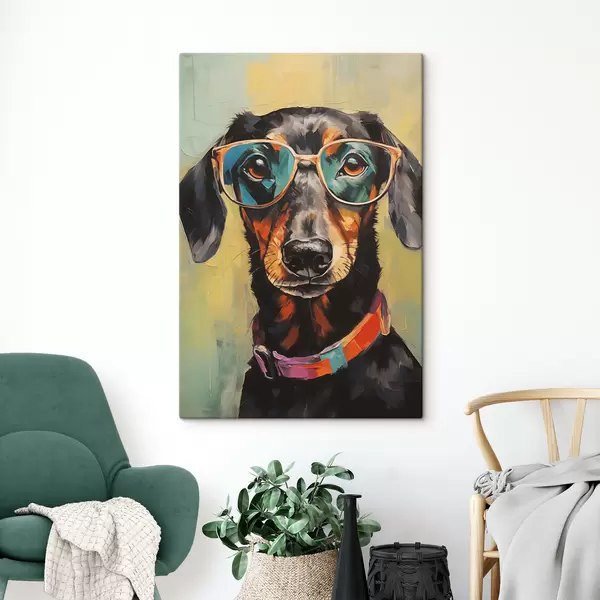 Picture Portrait of a black dachshund with glasses Nr s40803