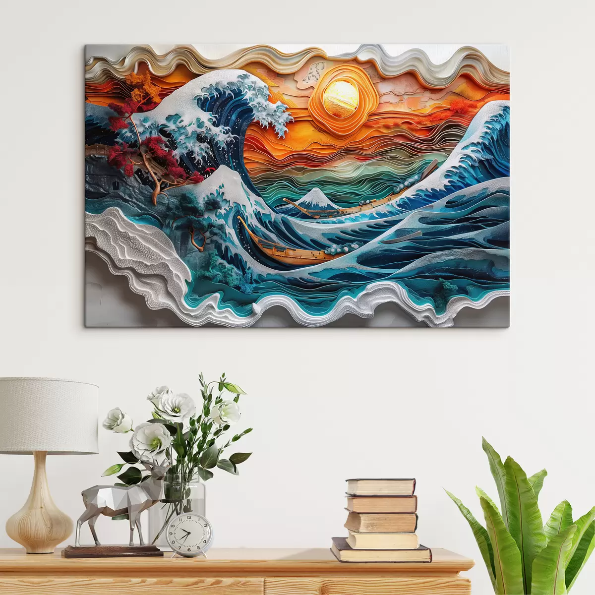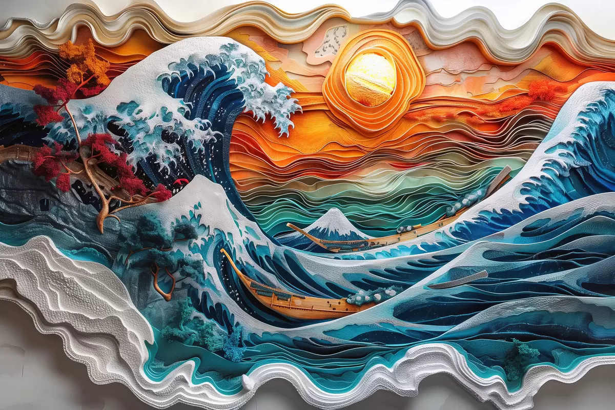 Picture Bas-relief imitation: a raging ocean with boats and the sun Nr s40976