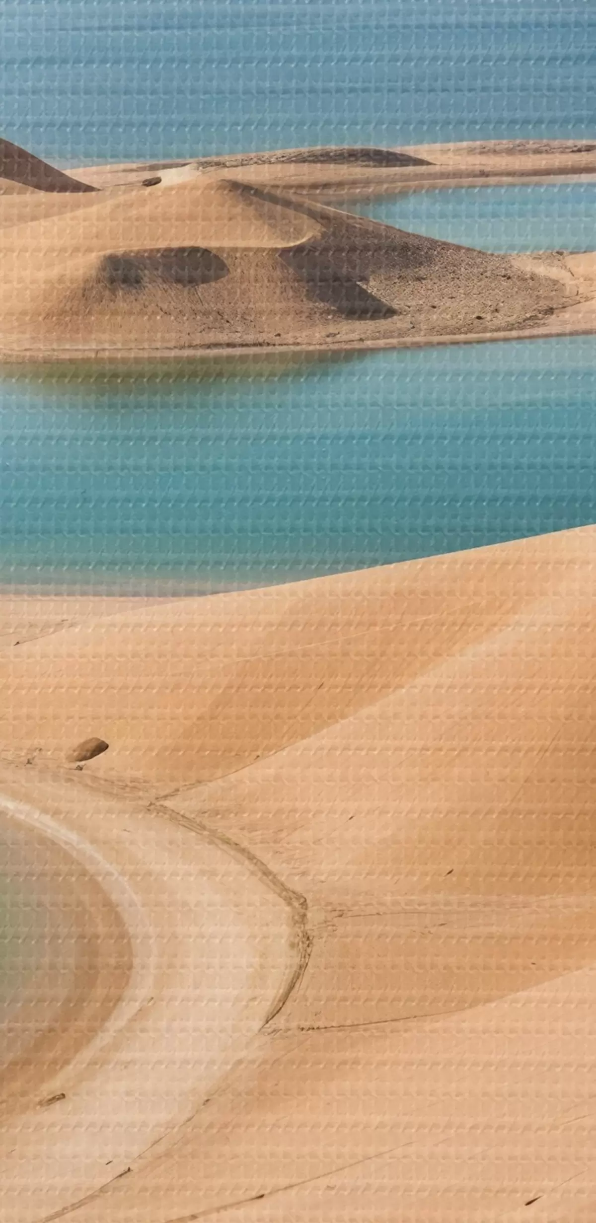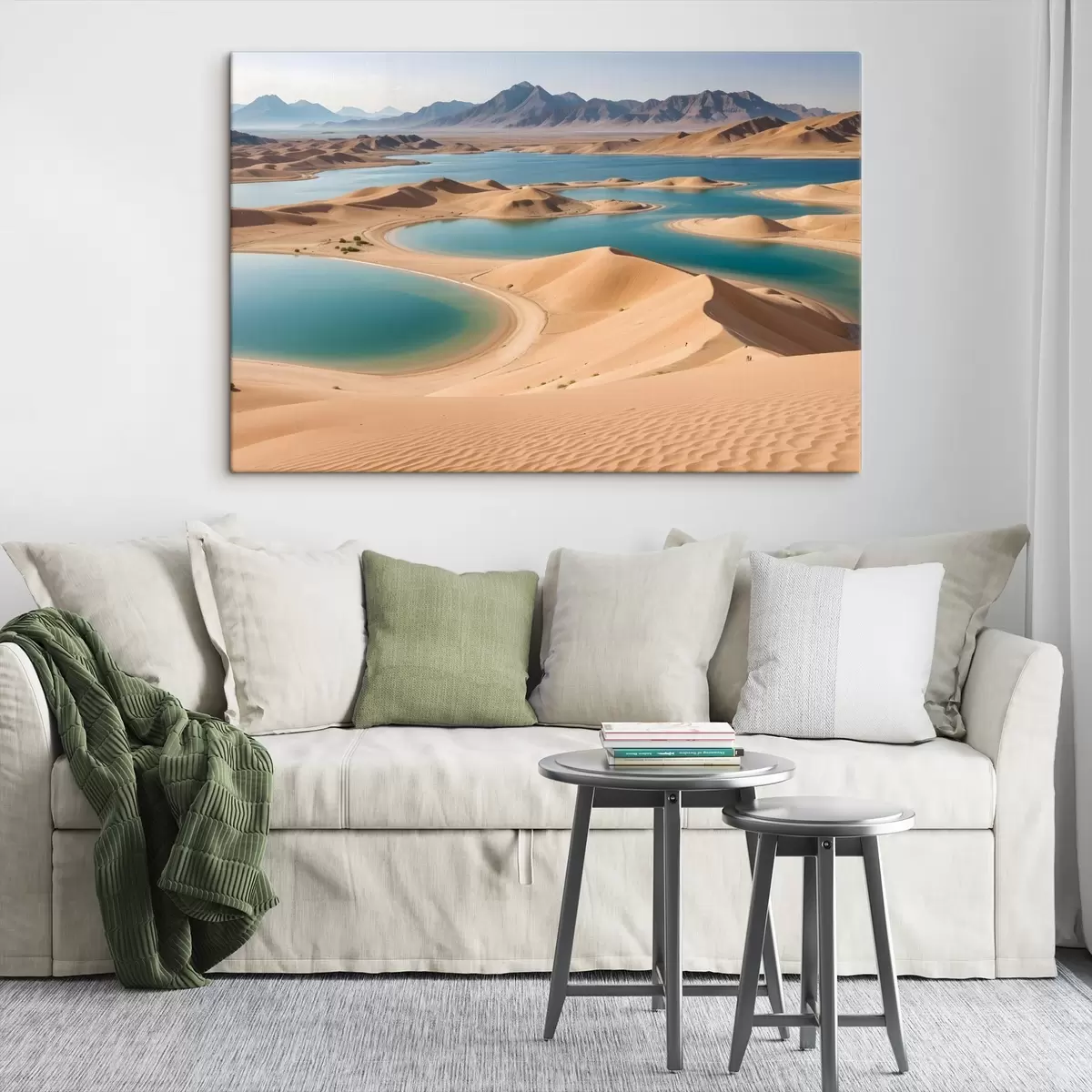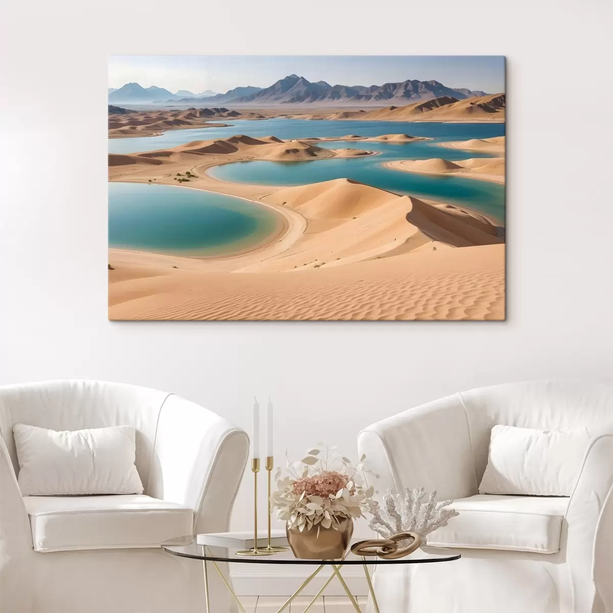 Picture A vast desert landscape with rolling sand dunes and turquoise lakes, surrounded by rugged mountains Nr s41087