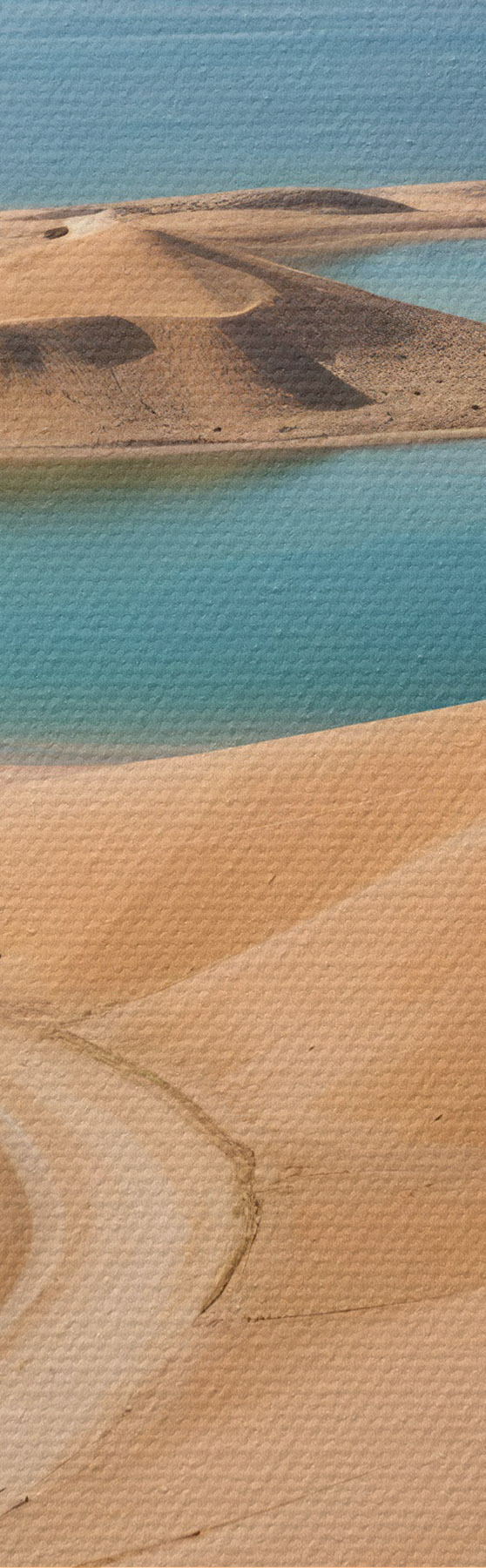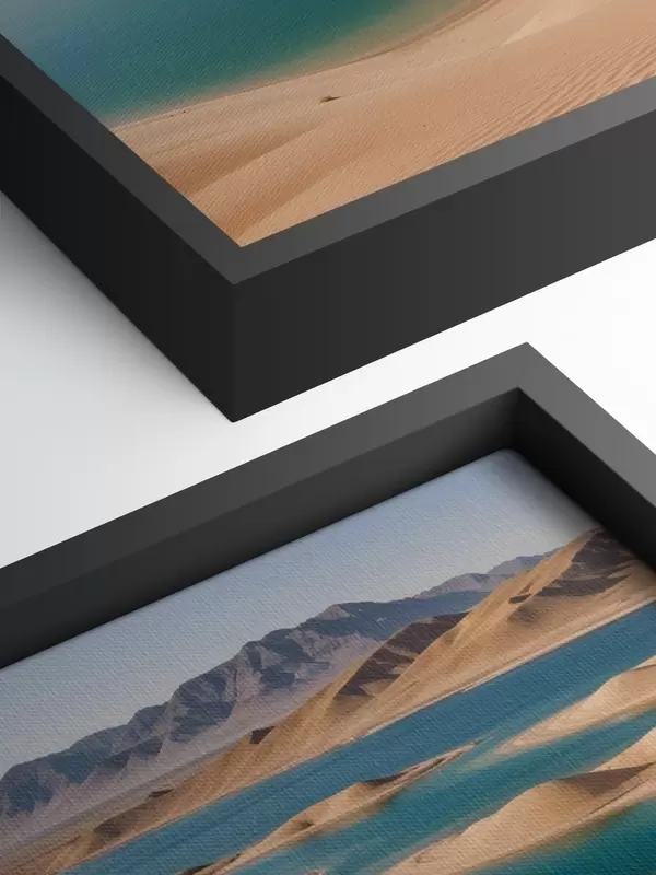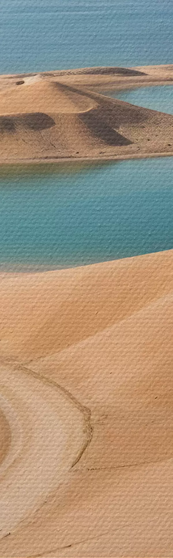Picture A vast desert landscape with rolling sand dunes and turquoise lakes, surrounded by rugged mountains Nr s41087