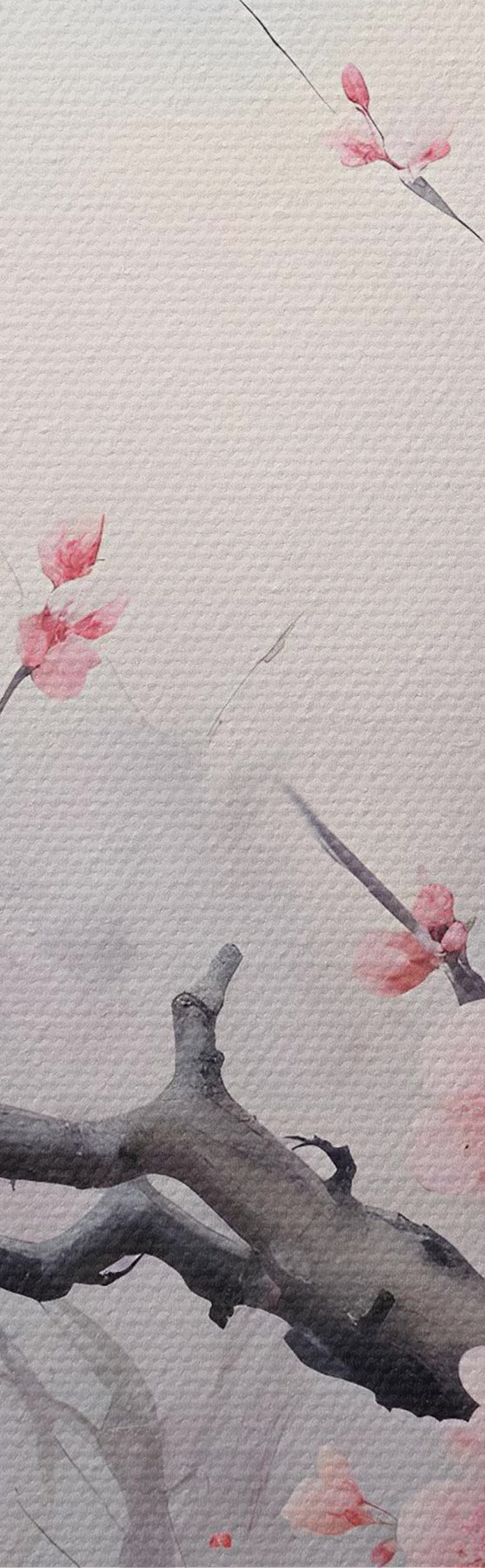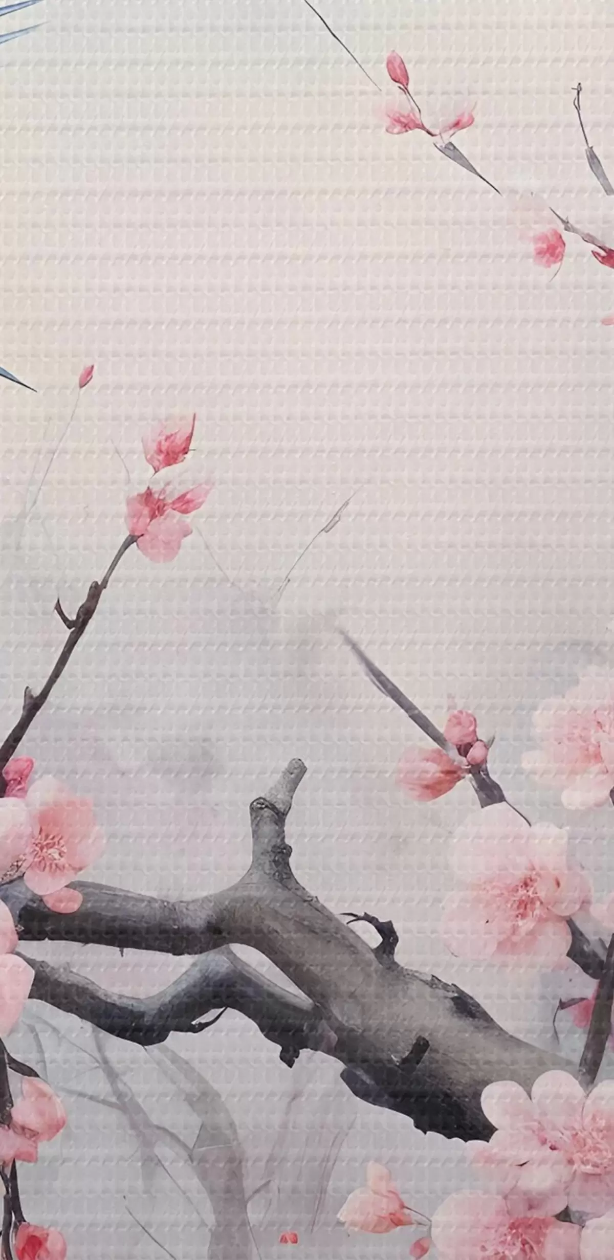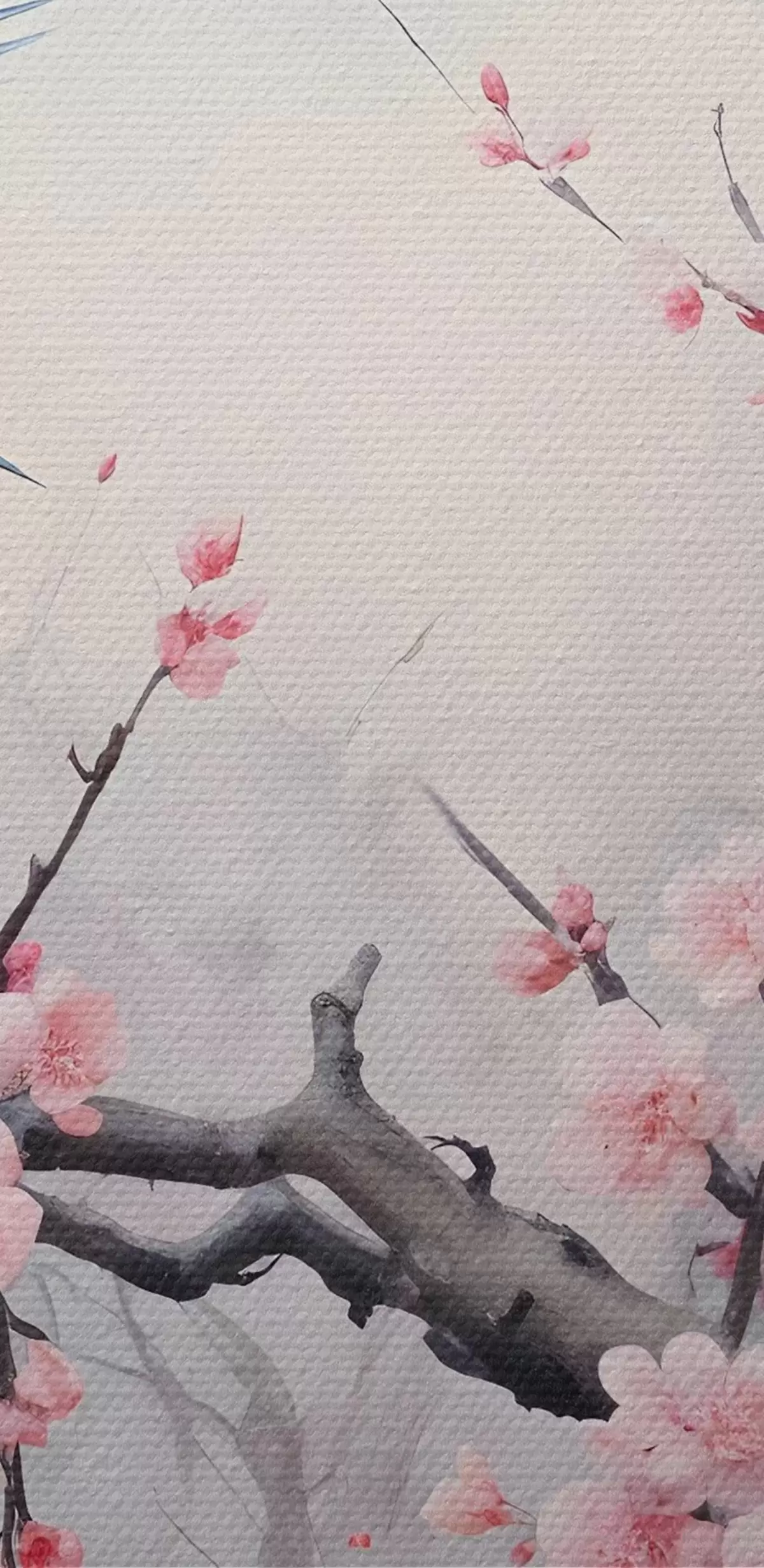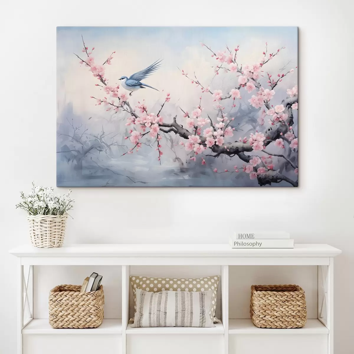 Picture Blue bird flying among pink cherry blossom flowers on a misty spring muted background Nr s41712