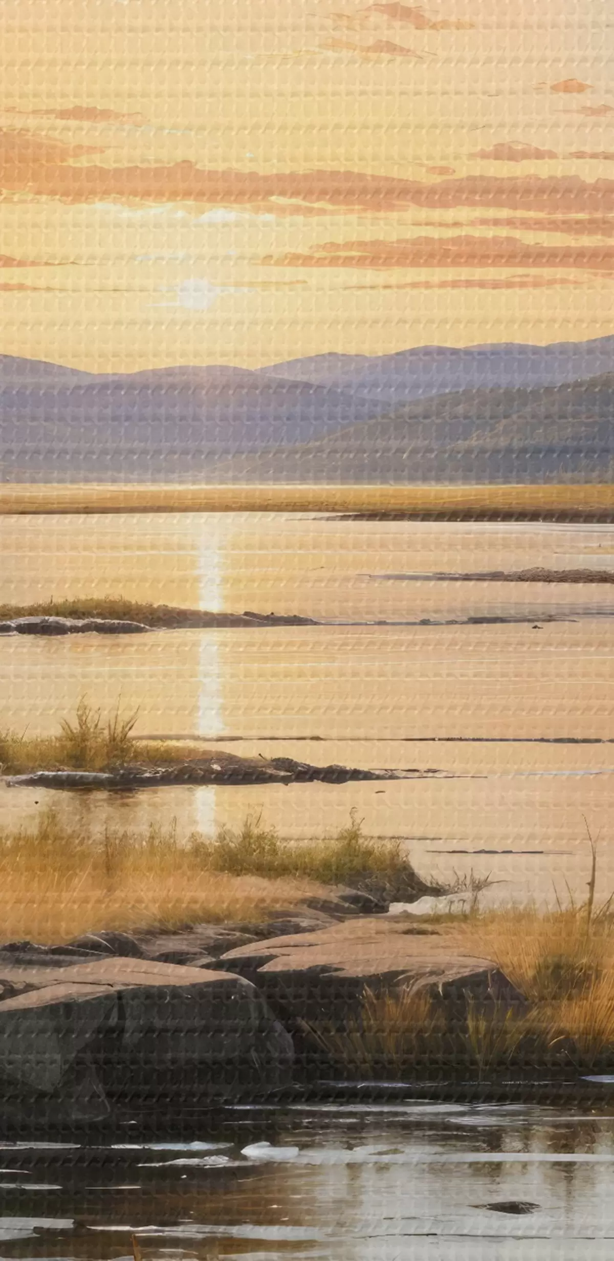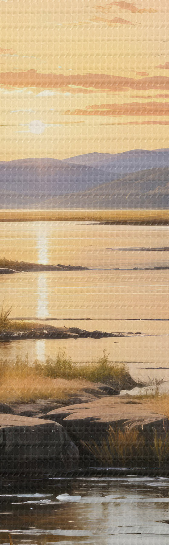 Picture A serene landscape with a lake surrounded by pine trees, reflecting the warm colors of the sunset sky Nr s41733
