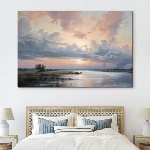 Picture A serene pastel-colored landscape with a calm lake reflecting the colorful sky at sunset Nr s41734