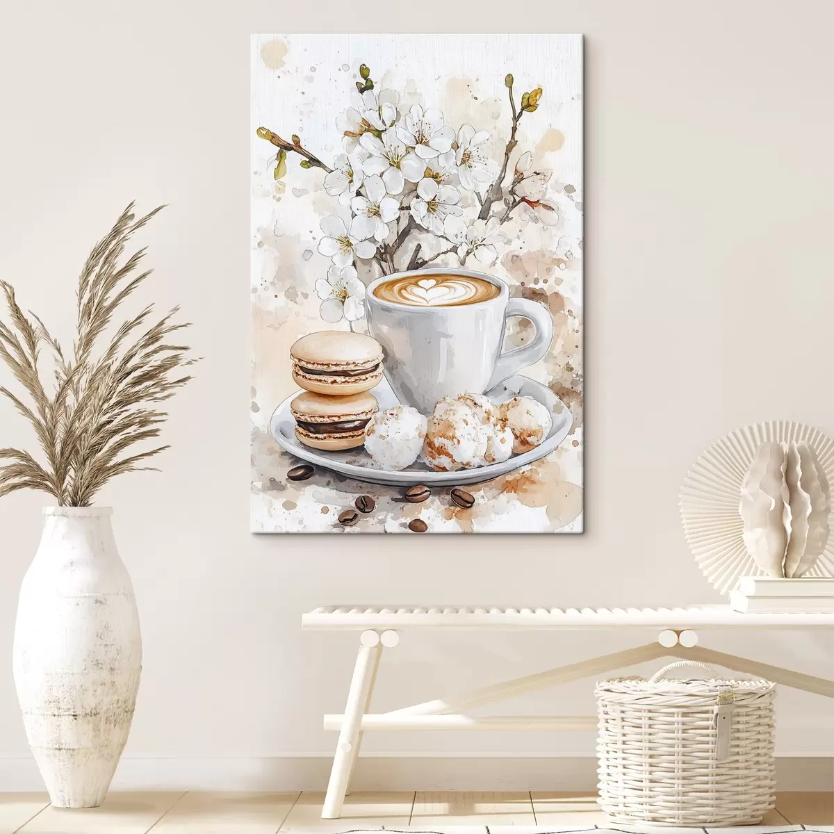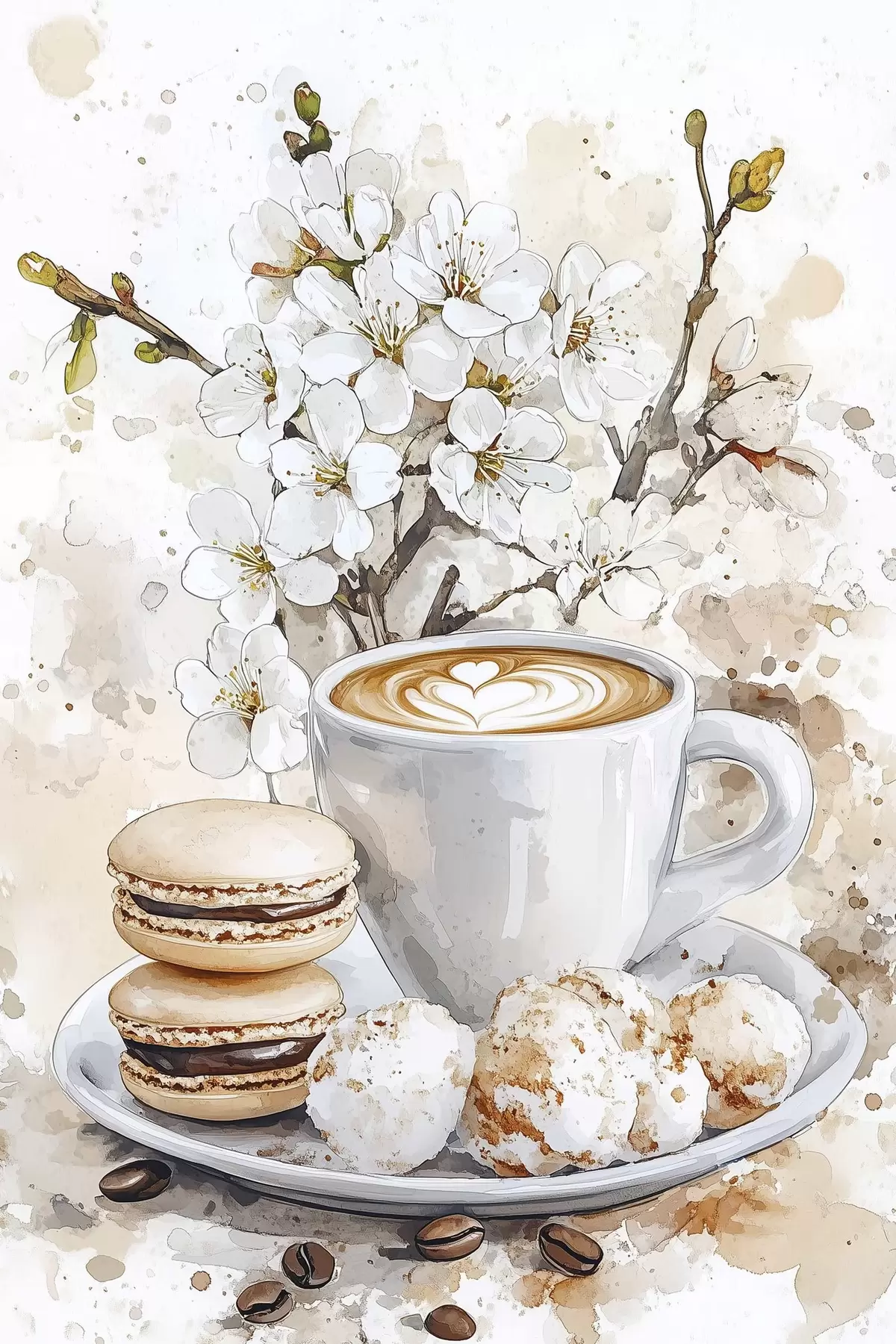 Picture Beautiful cup of coffee, jasmine flowers, macaroons, soft watercolor colors Nr s41964