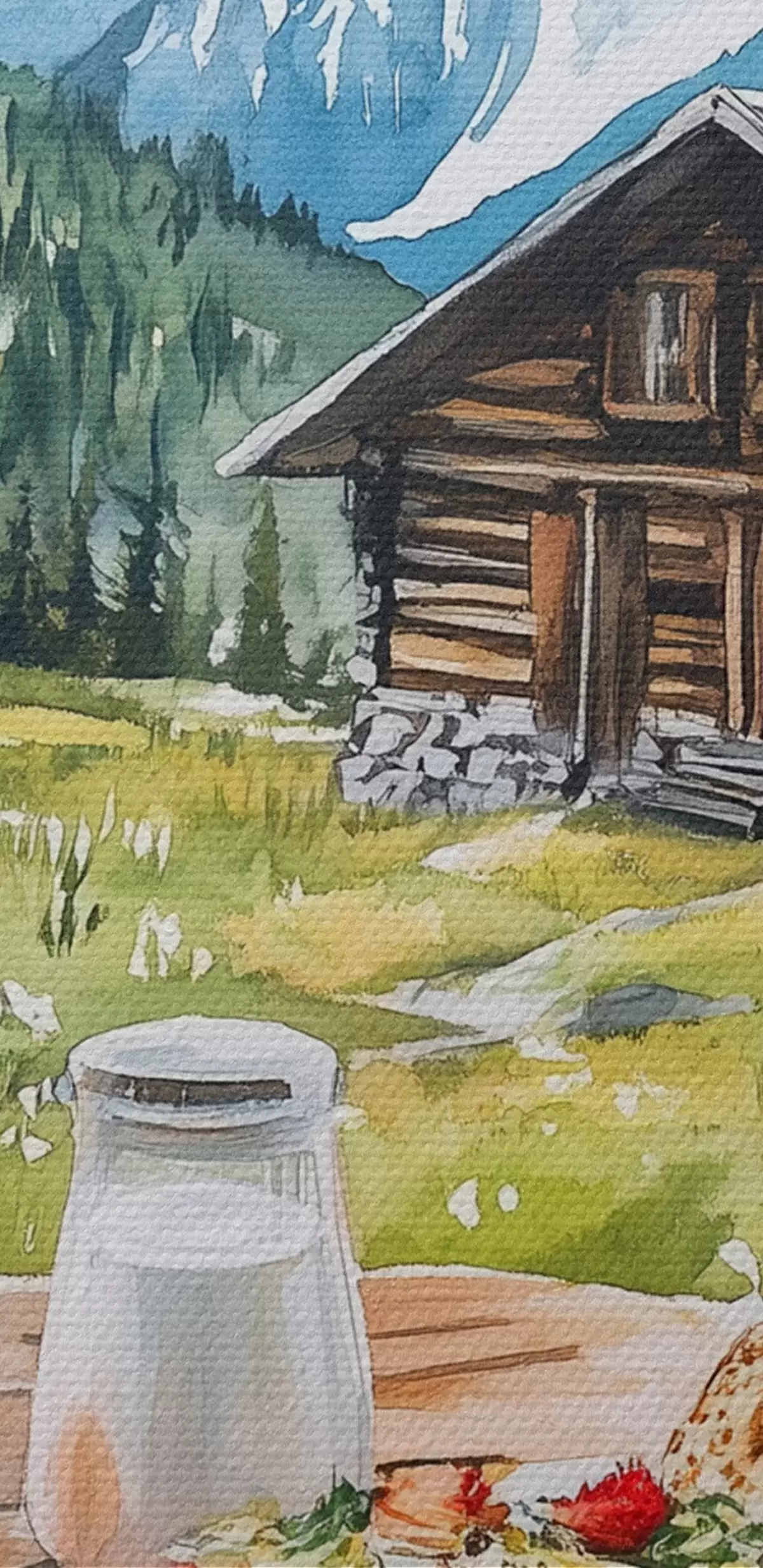 Picture Beautiful summer landscapes with mountains, forest and flowers, breakfast, watercolor style Nr s42427