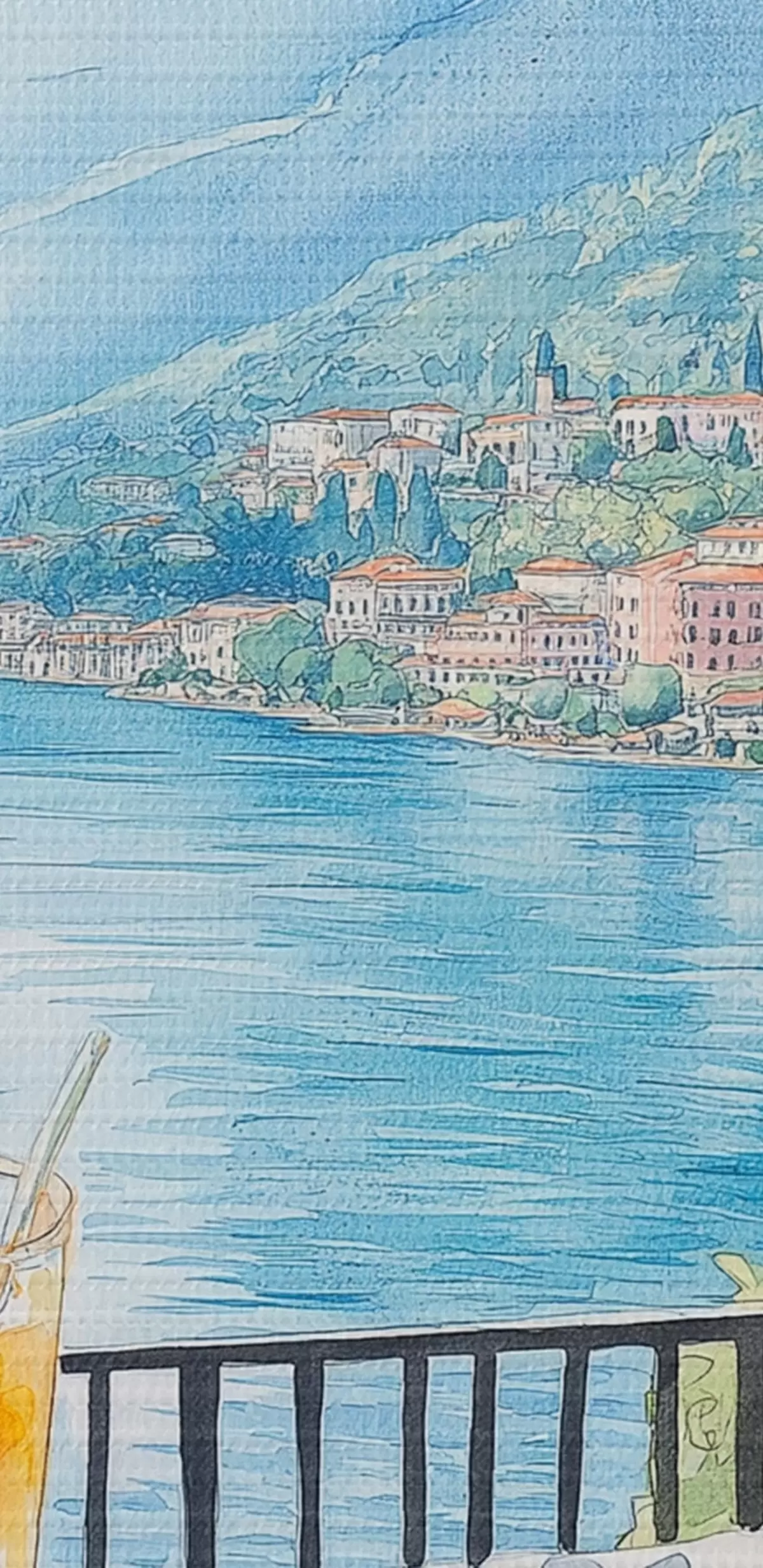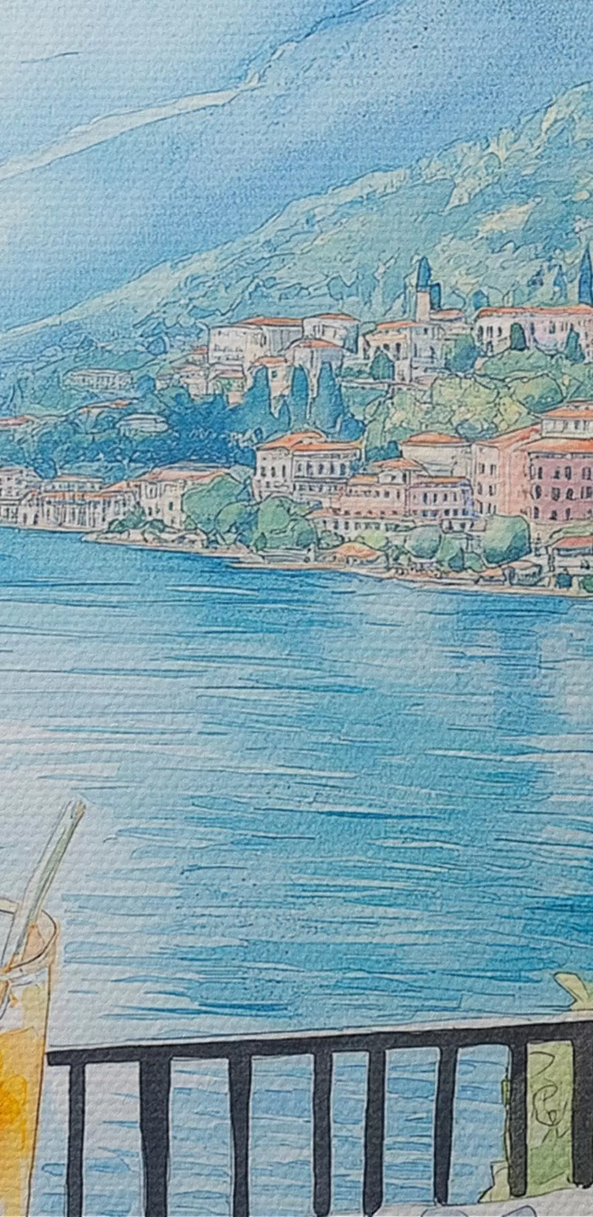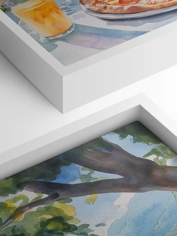 Picture Brunch in Italy, watercolor style, pizza margarita, lake, summer nature Nr s42436