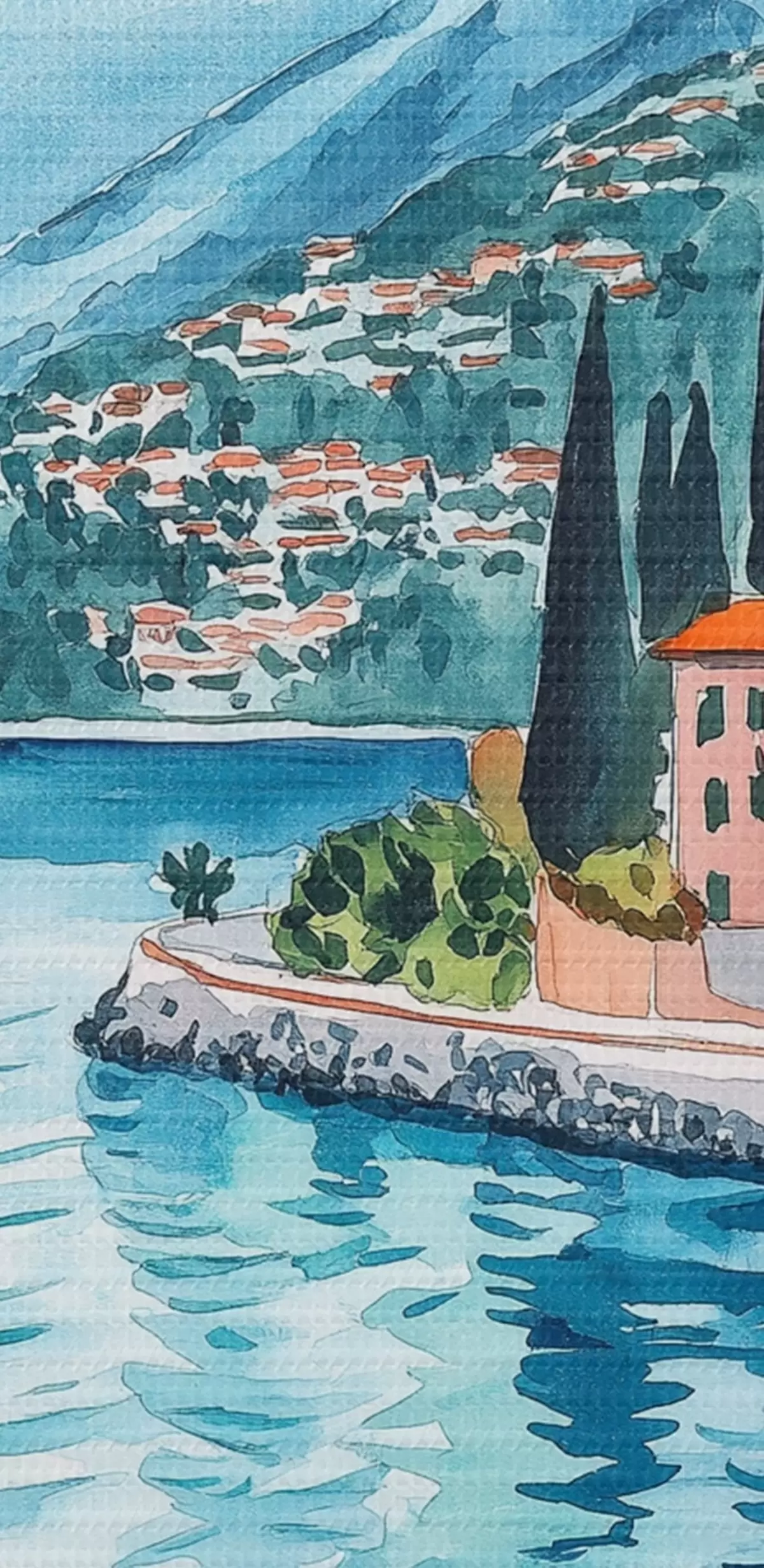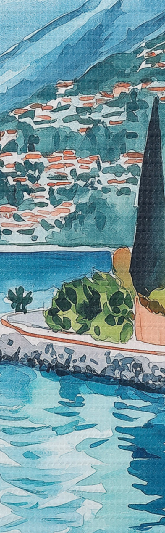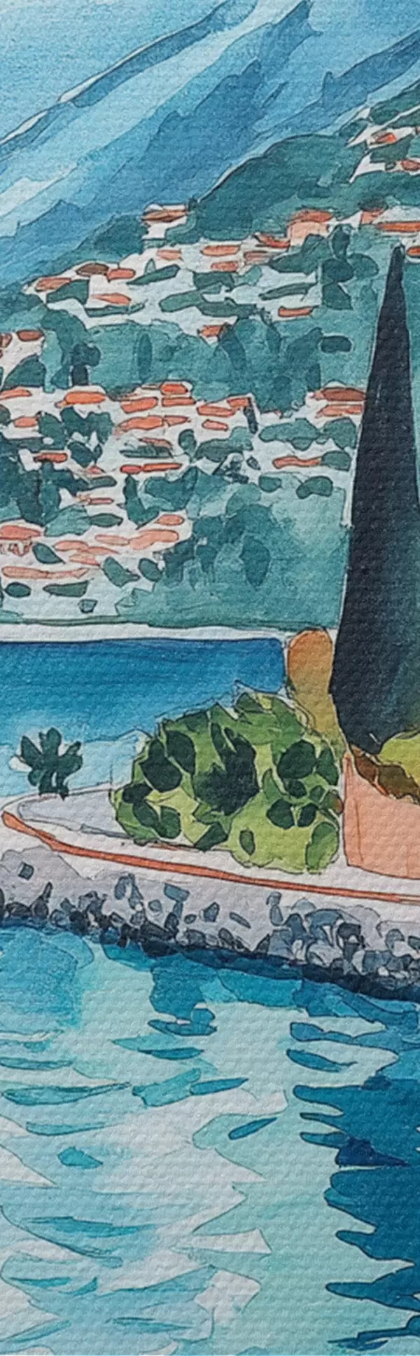 Picture Lake Como, Italy, watercolor style, pizza, cocktails, old city, mountains Nr s42437
