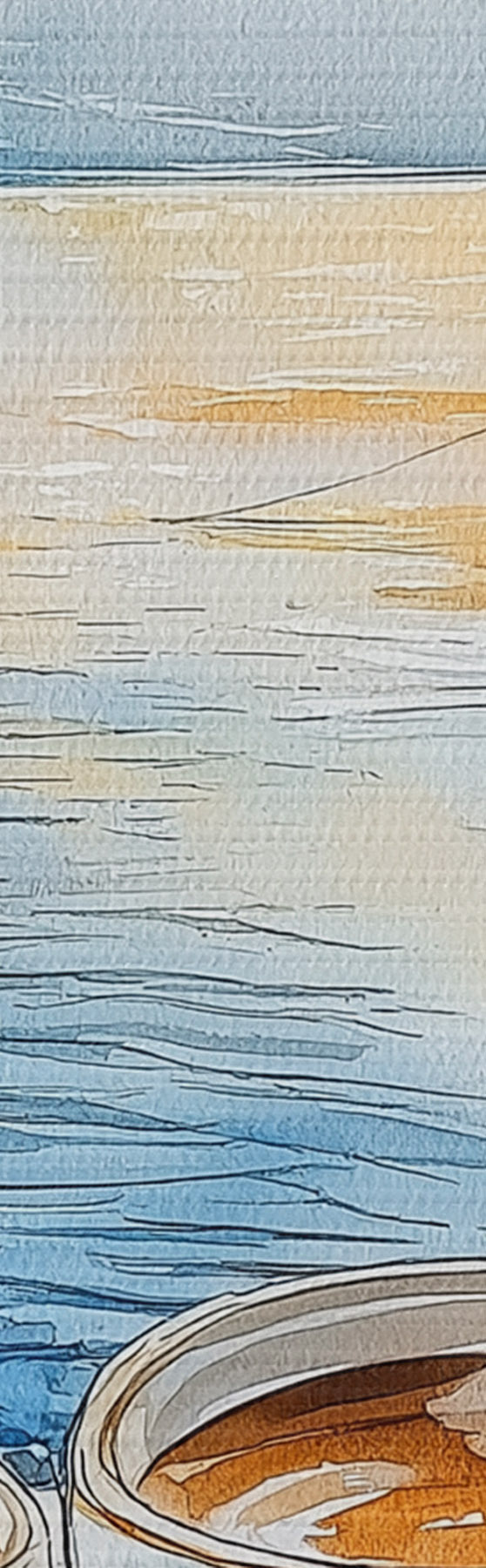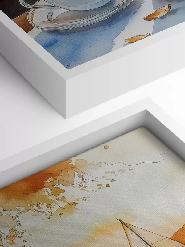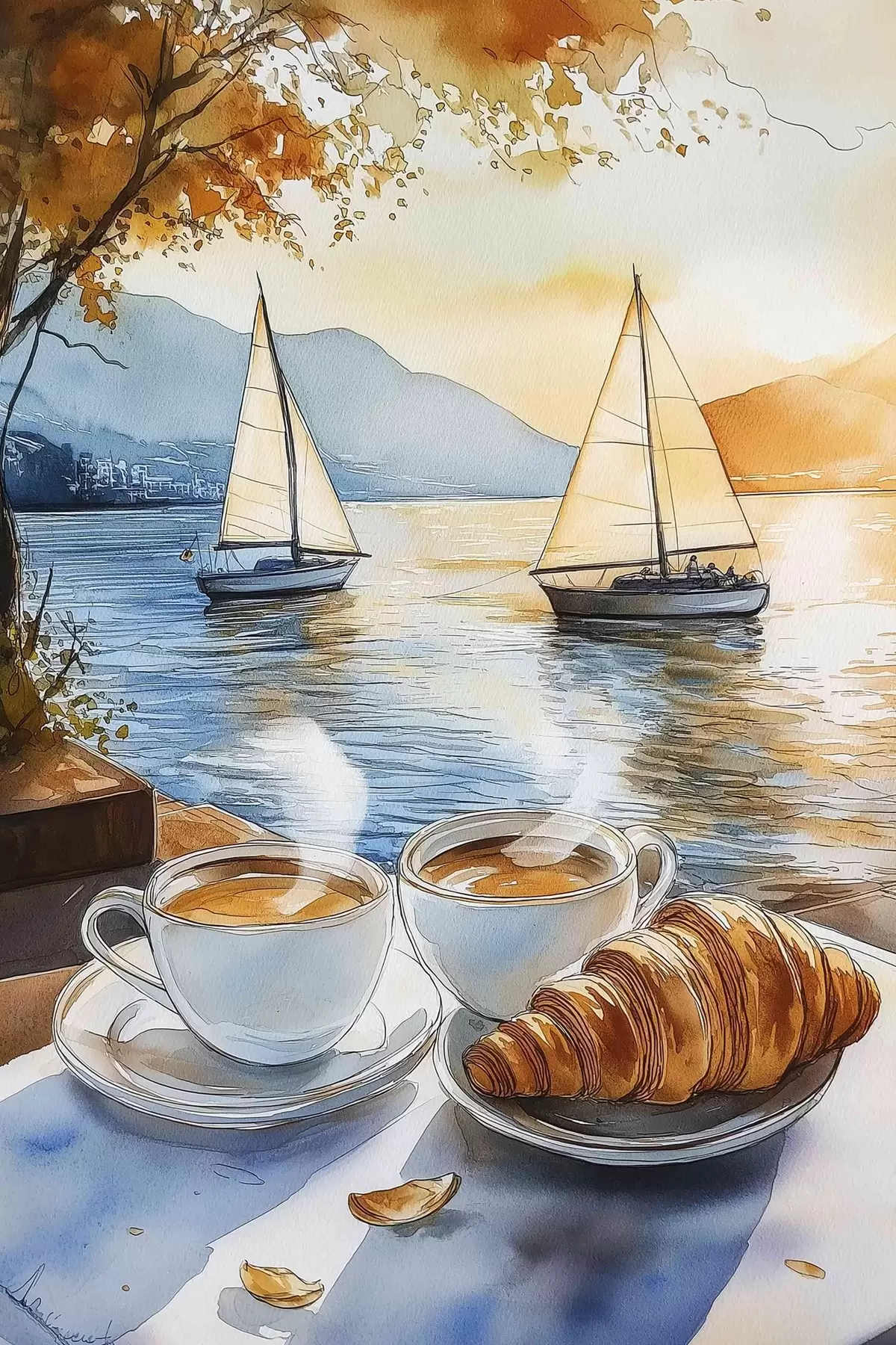 Picture Sunset on the lake, sailboats, cups of coffee, watercolor style Nr s42442