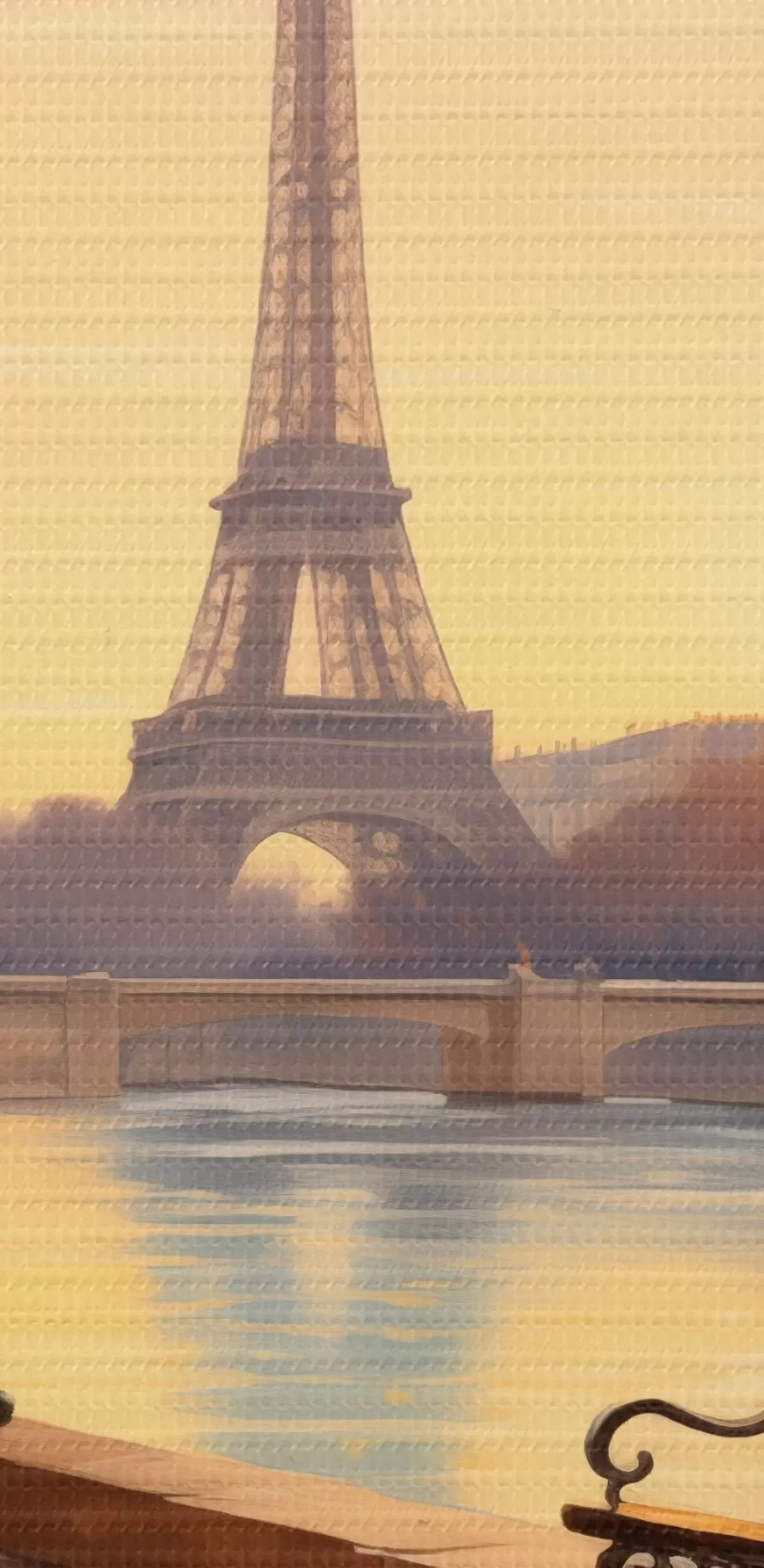 Picture Autumn in Paris with a view of the Eiffel Tower, the Seine embankment covered with golden leaves, benches, and streetlights adding a romantic atmosphere Nr s42577
