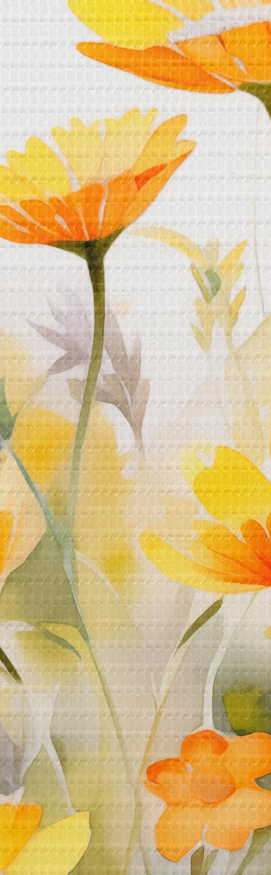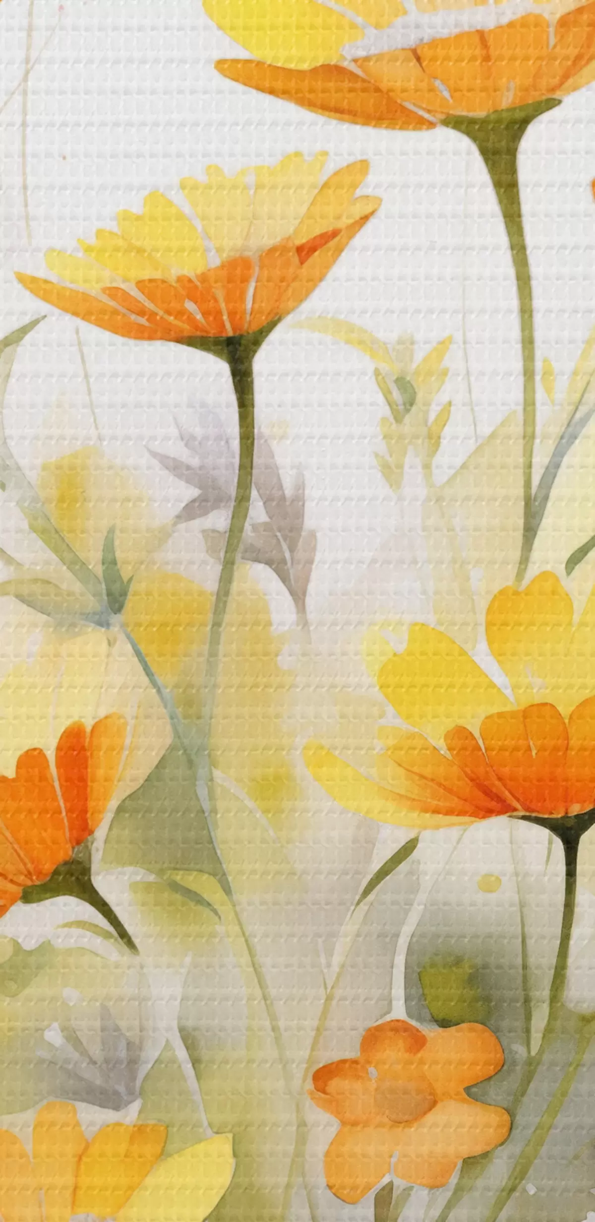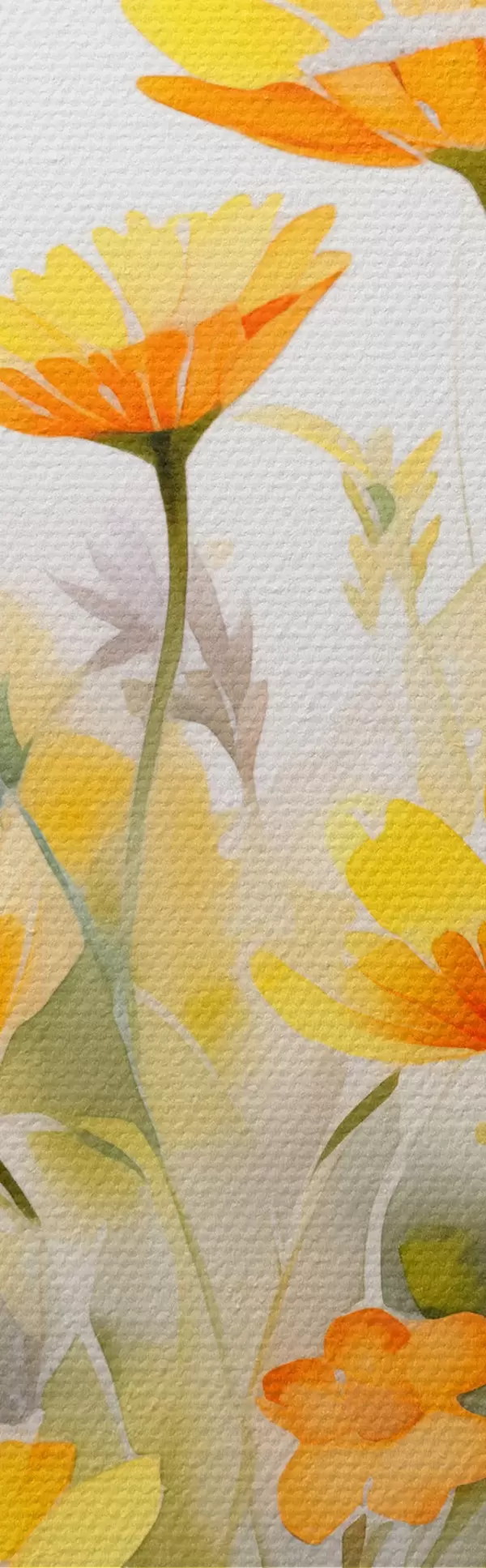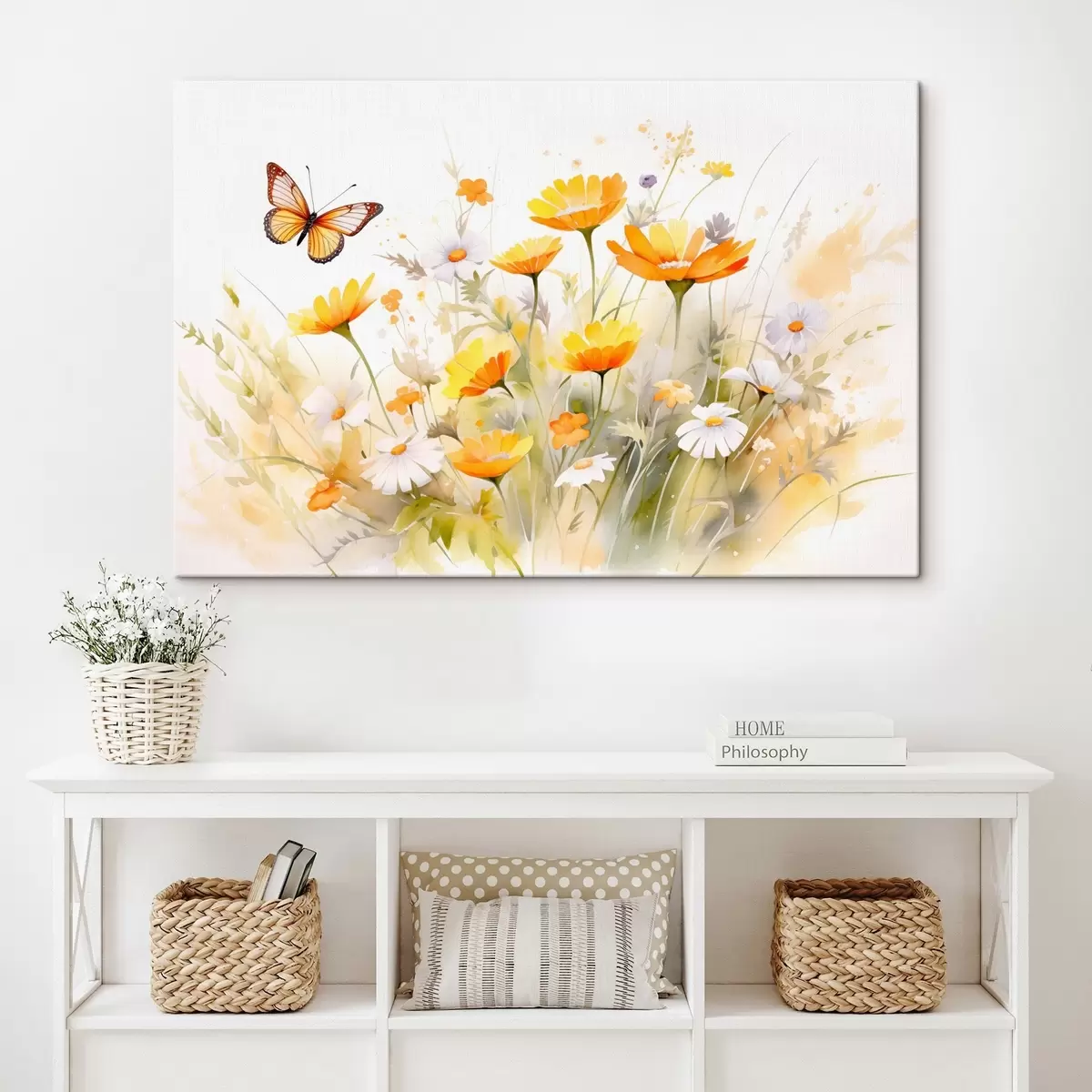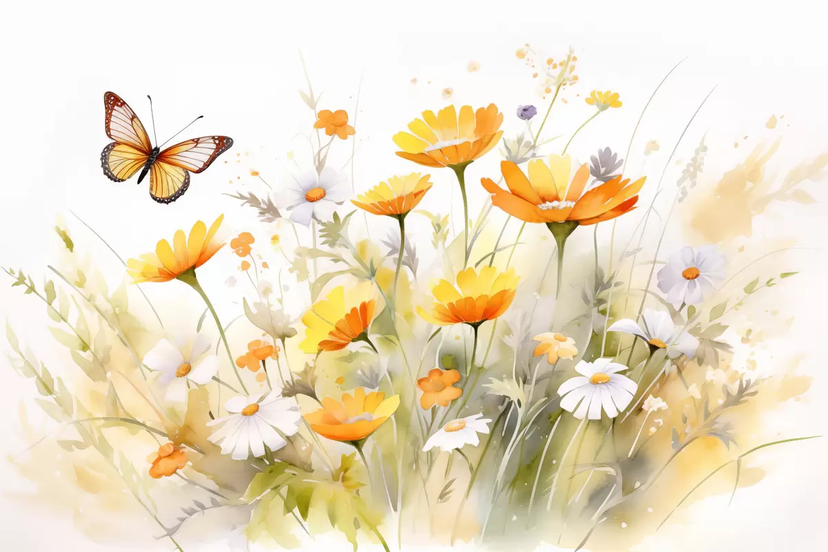 Picture A vibrant watercolor-like field of flowers featuring orange and white daisies, with a butterfly fluttering nearby Nr s42714