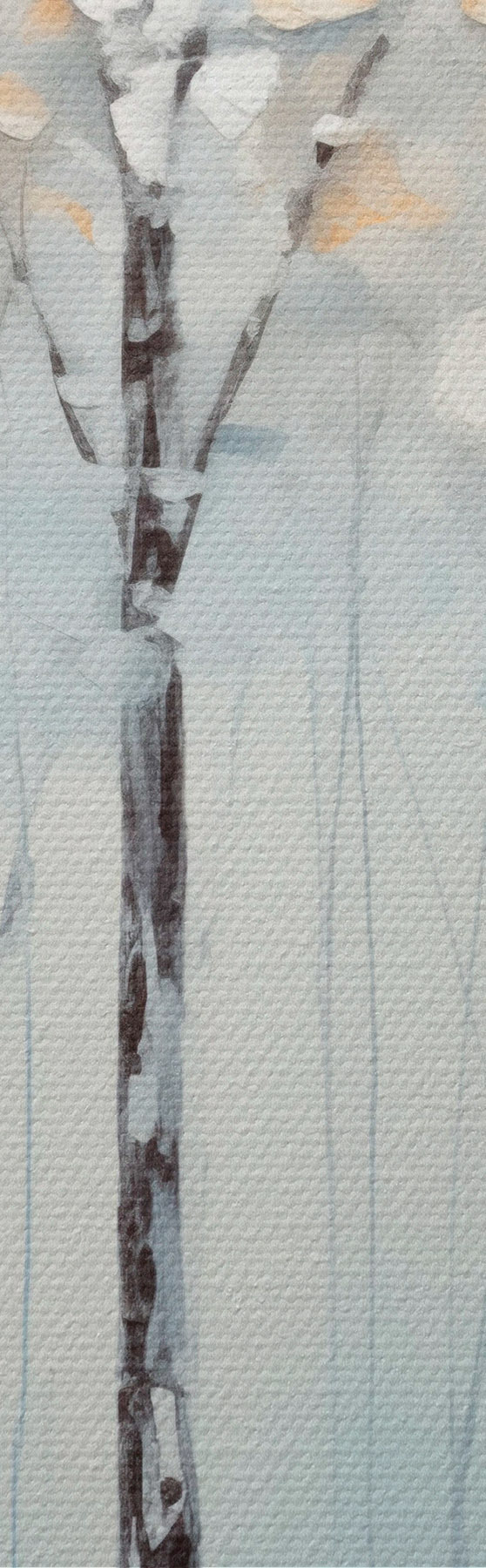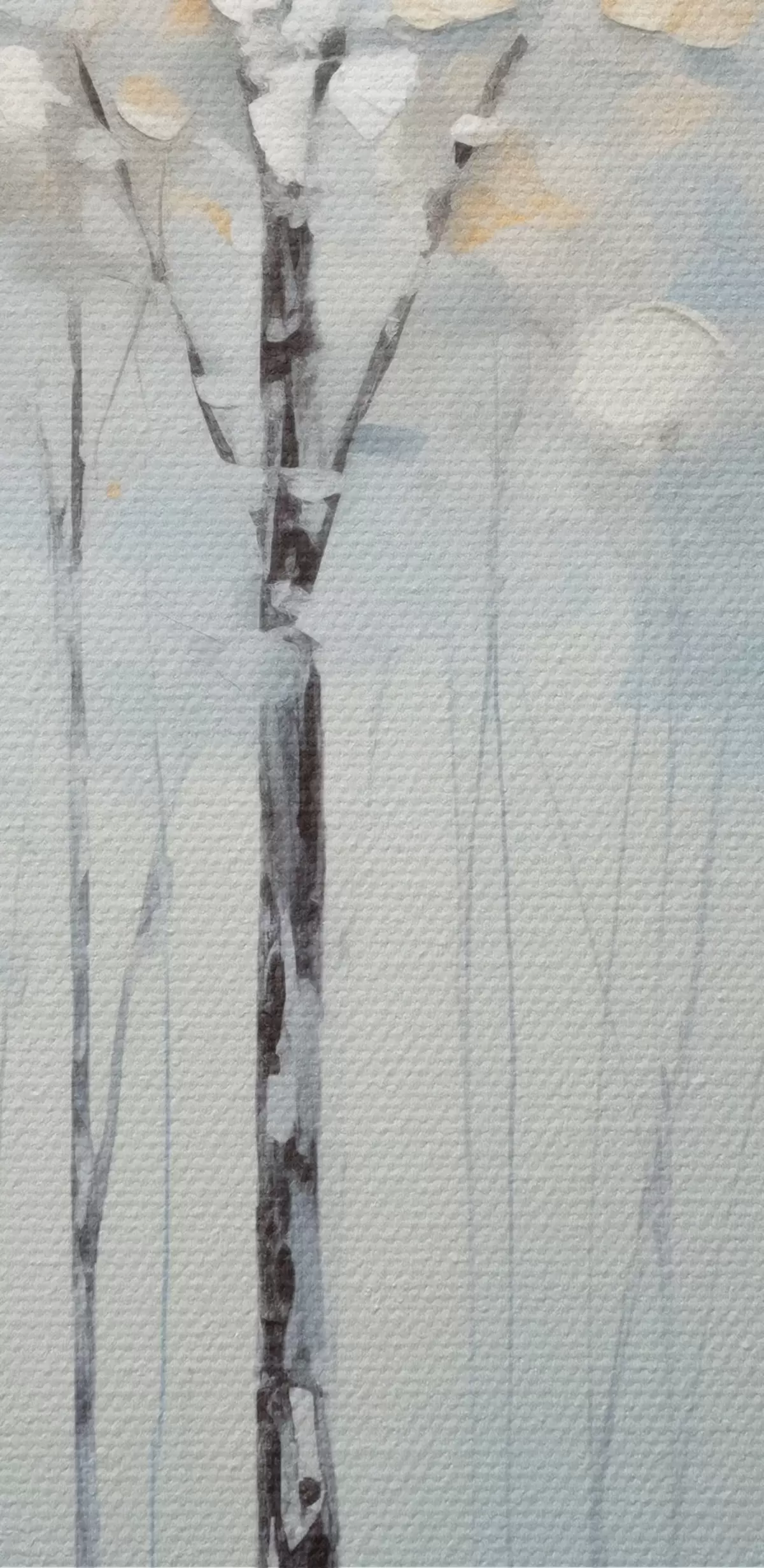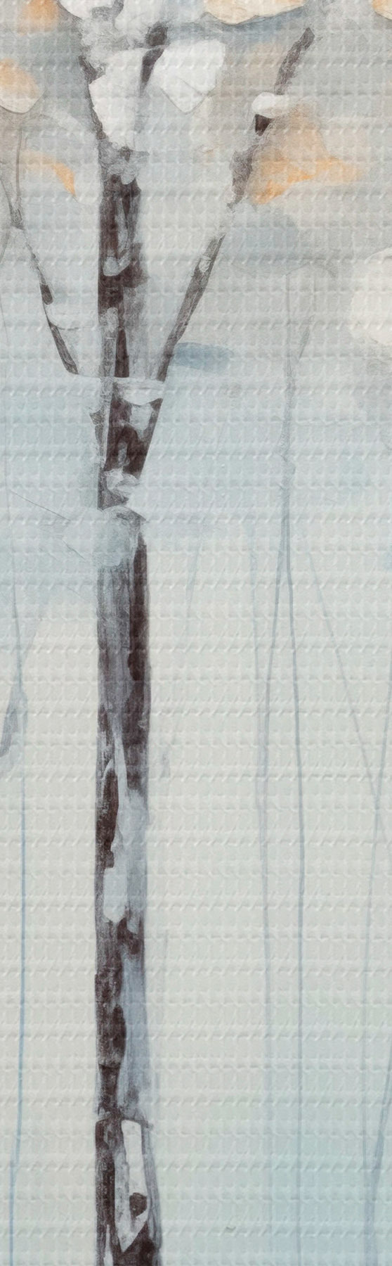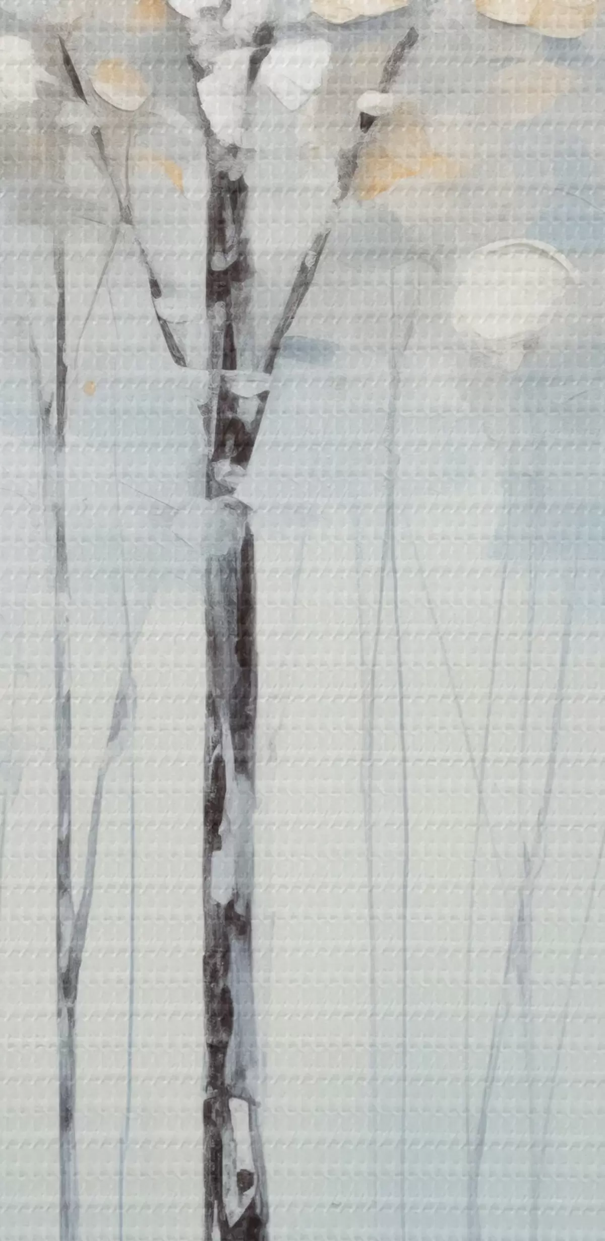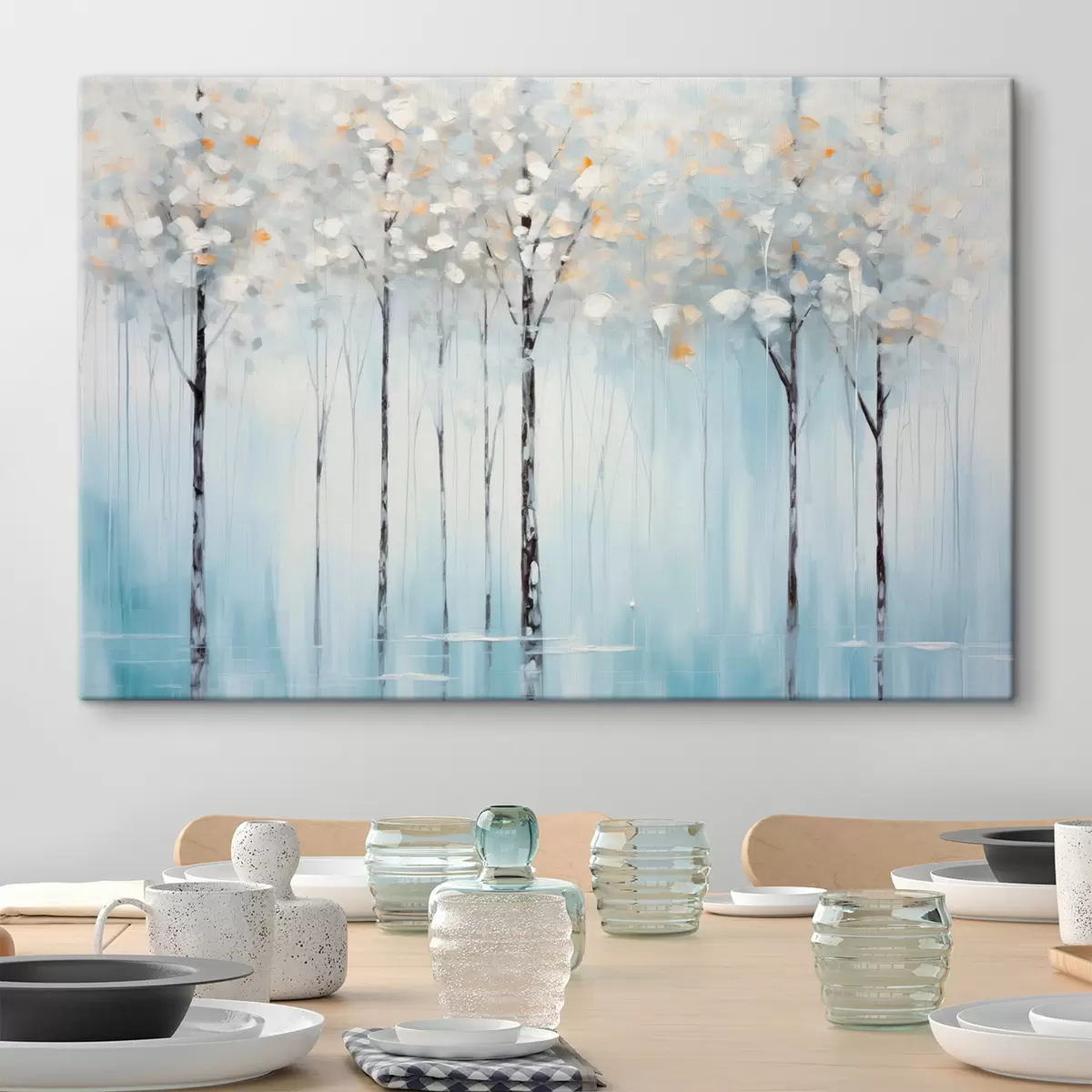 Picture Tall, slender trees with blue leaves and hints of yellow on a soft blue background, oil painting imitation Nr s42731