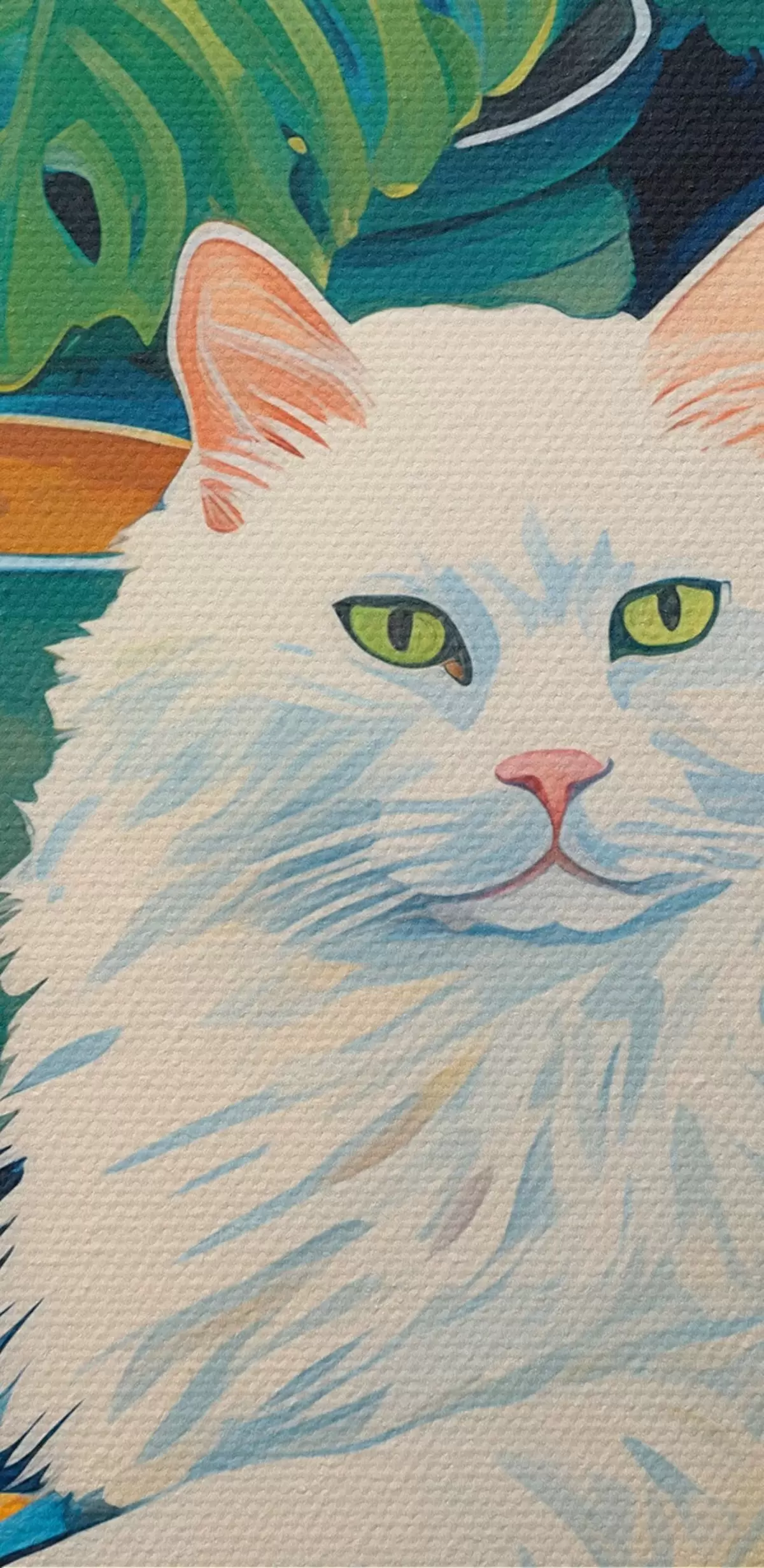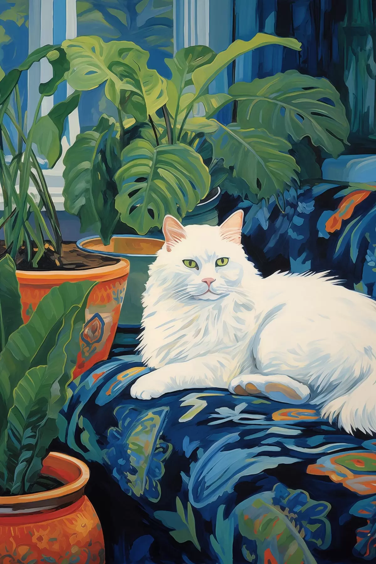 Picture A white cat amidst lush greenery and ceramic pots Nr s43131