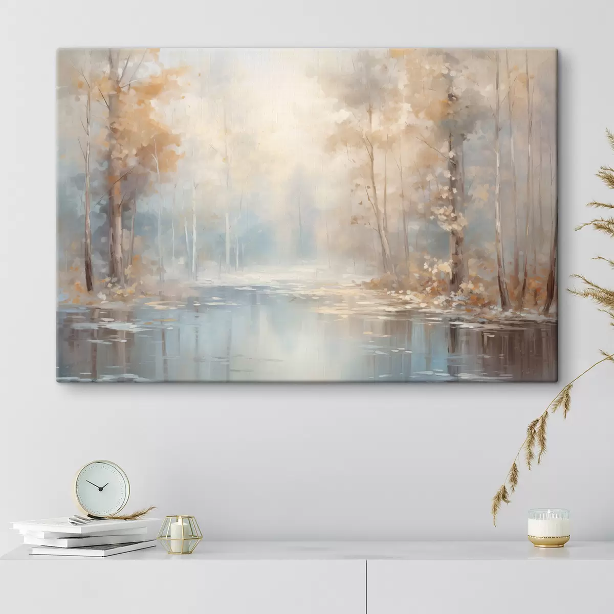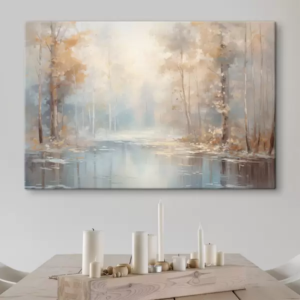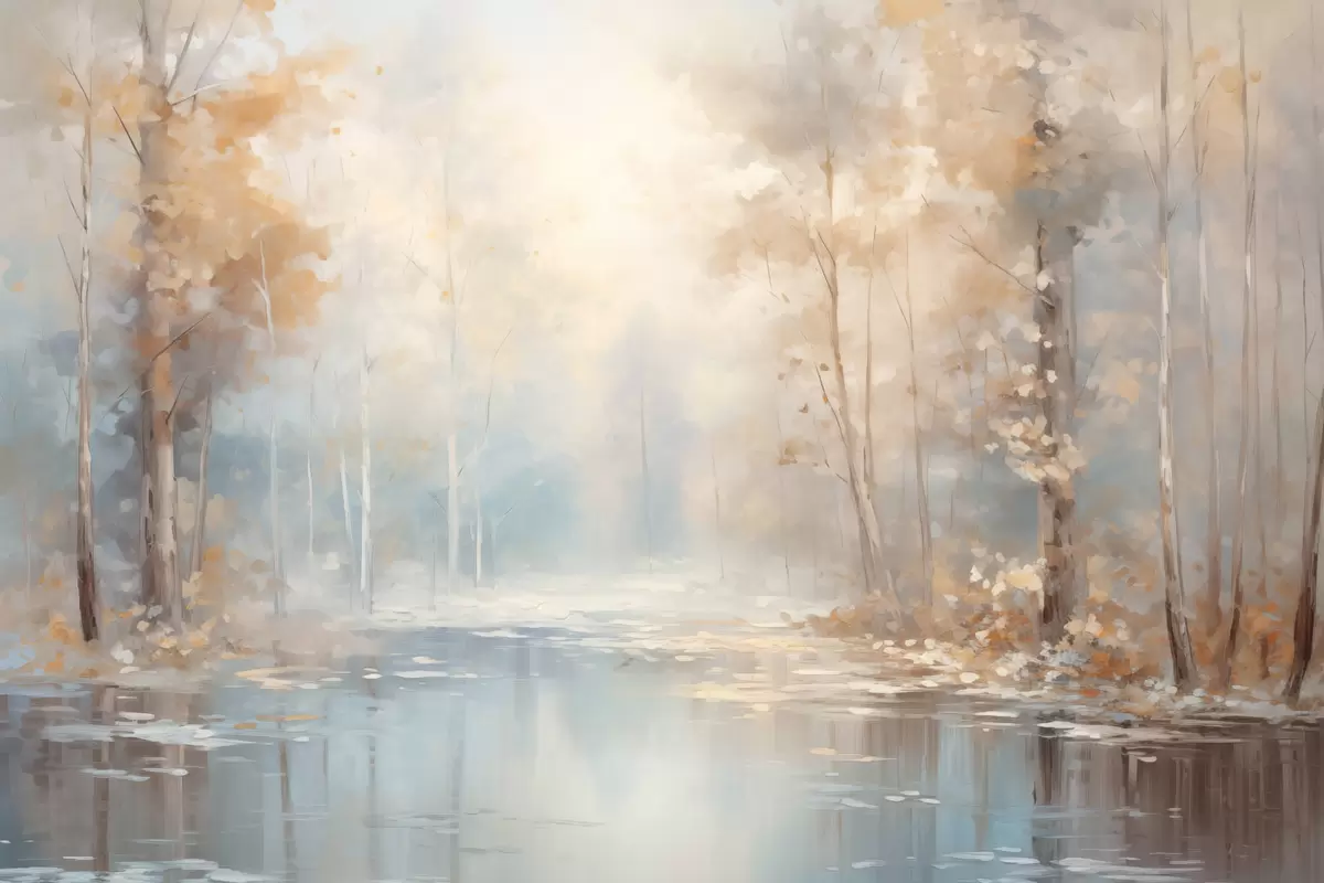 Picture Landscape oil painting imitation of a calm river reflecting the soft light, surrounded by autumn trees Nr s43167