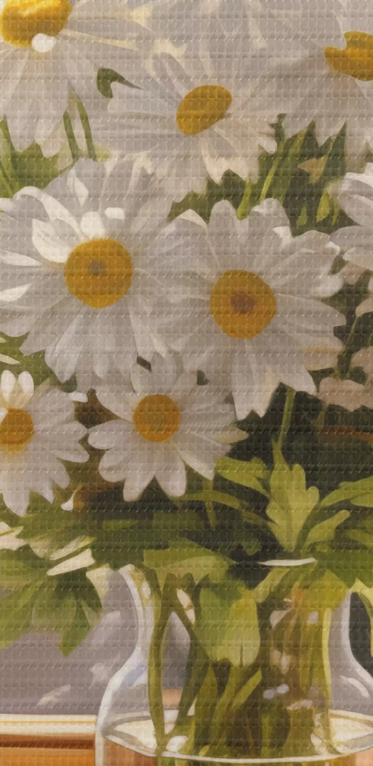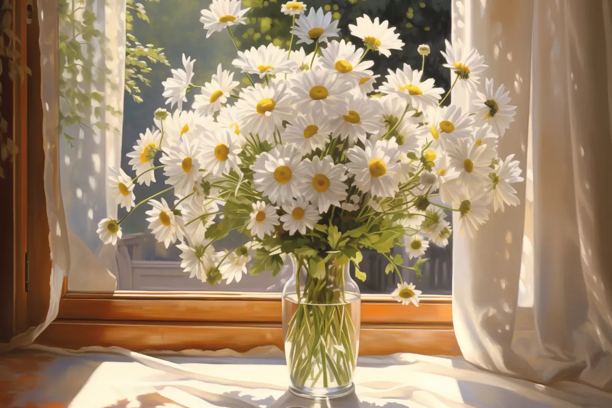 Picture Oil painting imitation of a vase with white daisies on a windowsill, sunny day, warm colors pallette Nr s43171