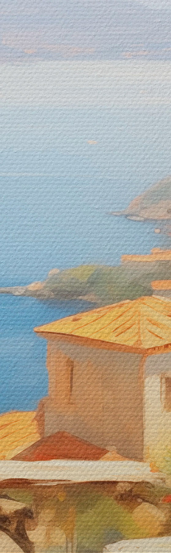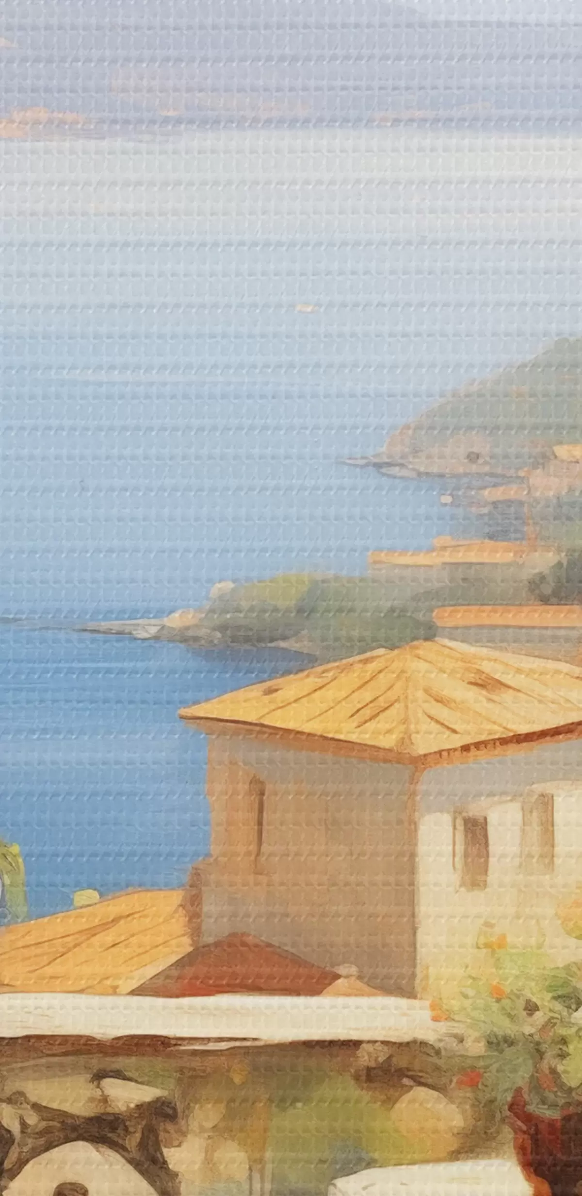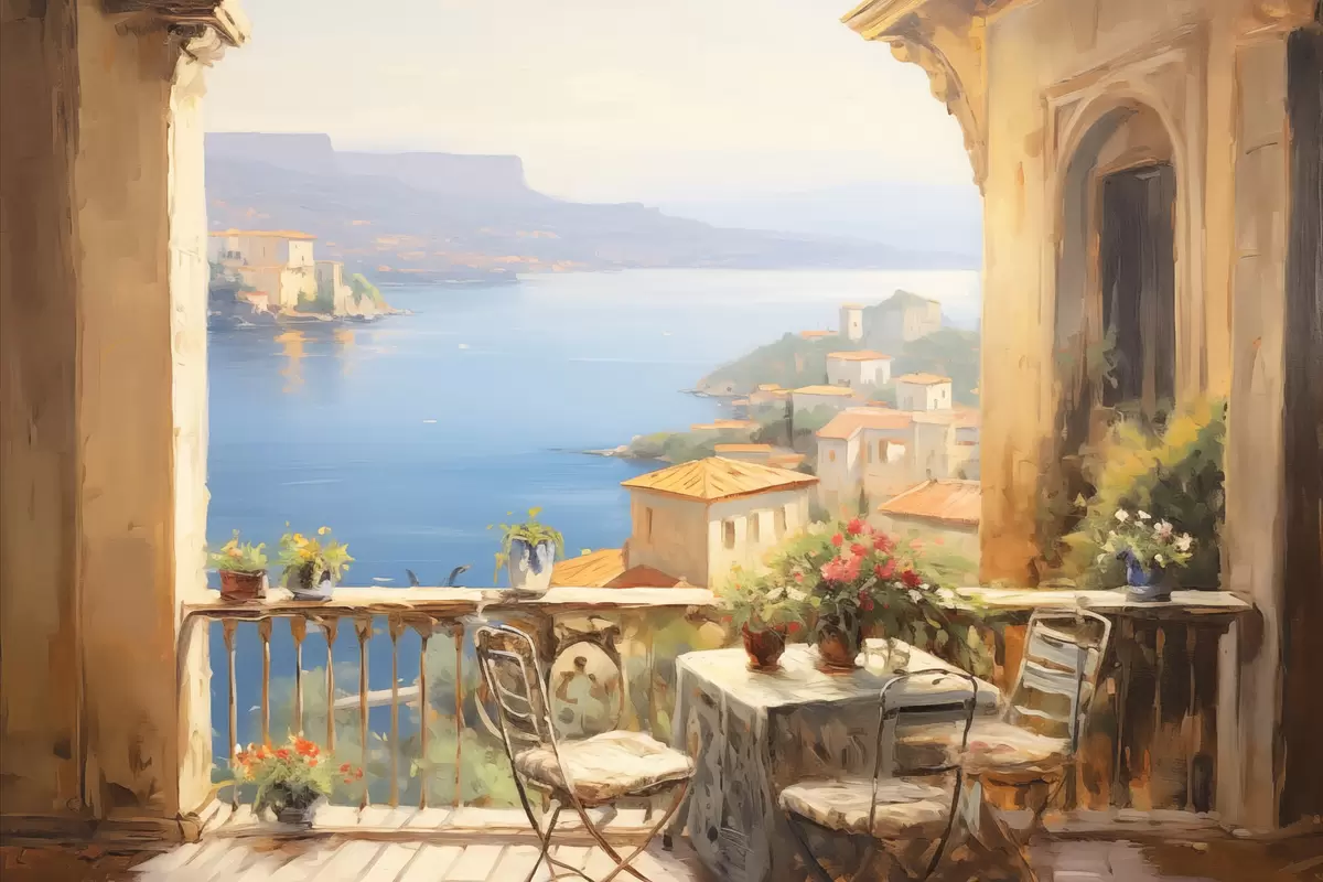 Picture Oil painting imitation of balcony with flowers, overlooking the sea, houses on the coast, sunny day, blue sky Nr s43173