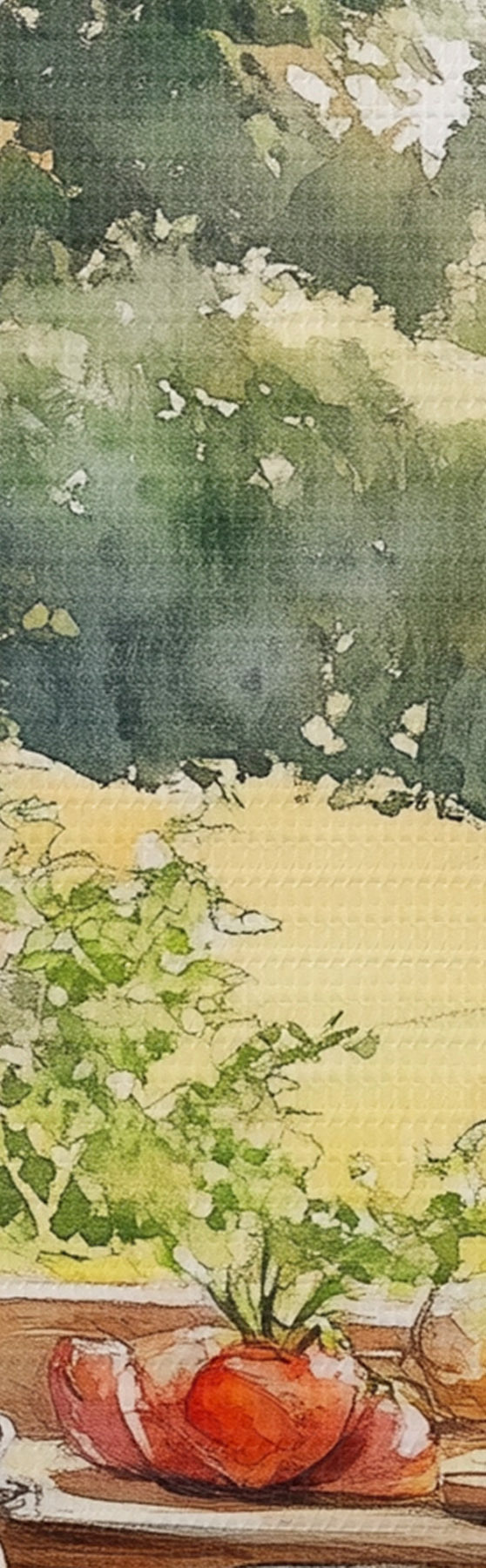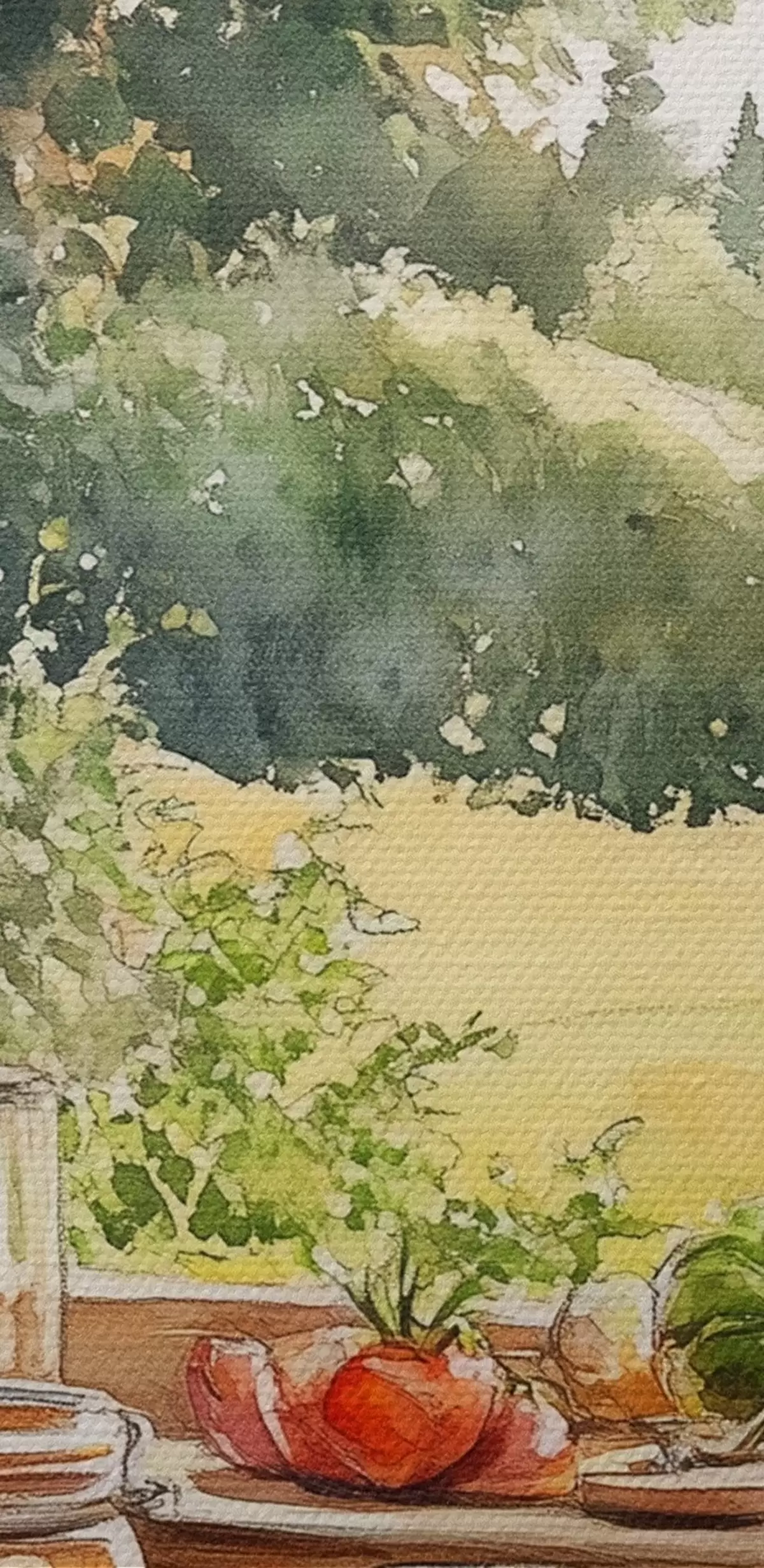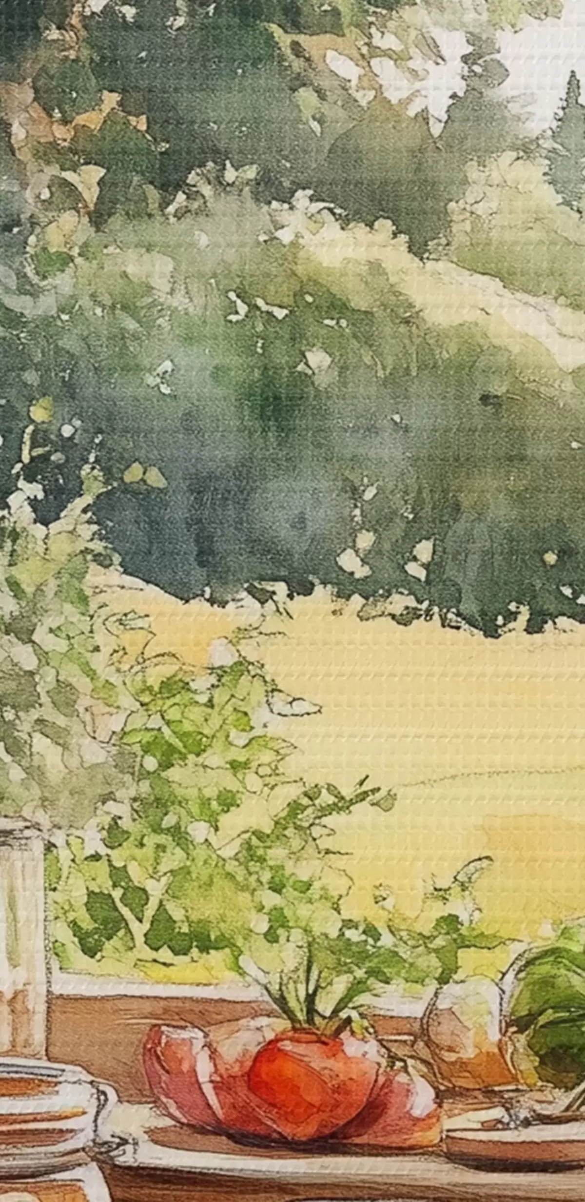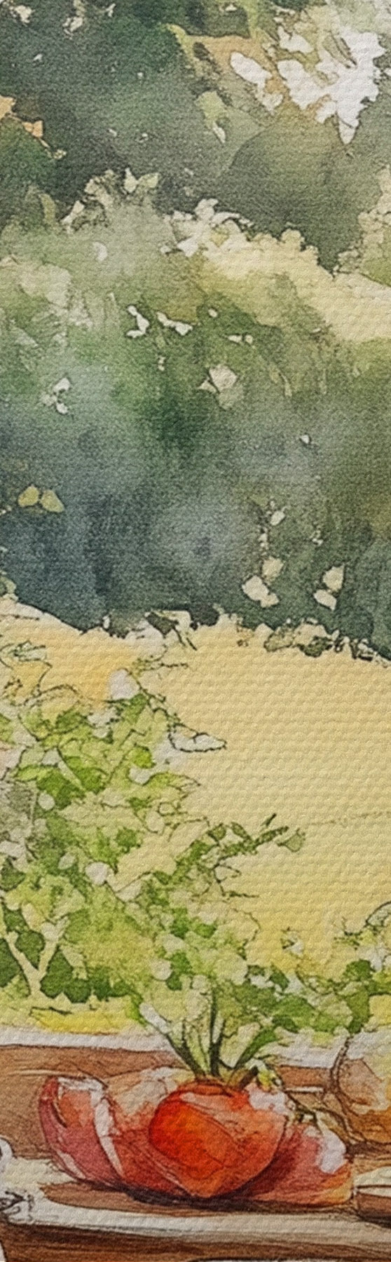 Picture Village aesthetics, wooden house, summer nature, vegetables, watercolor style Nr s43185