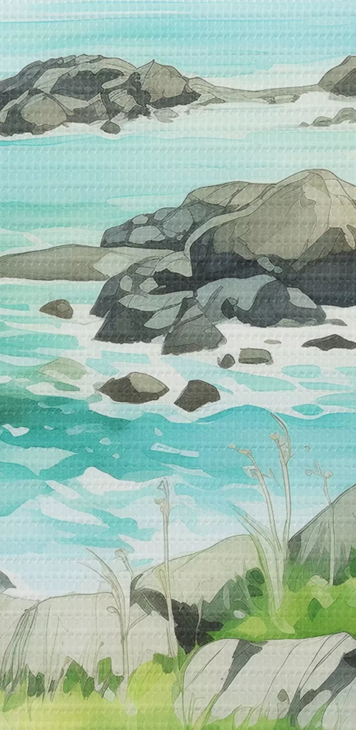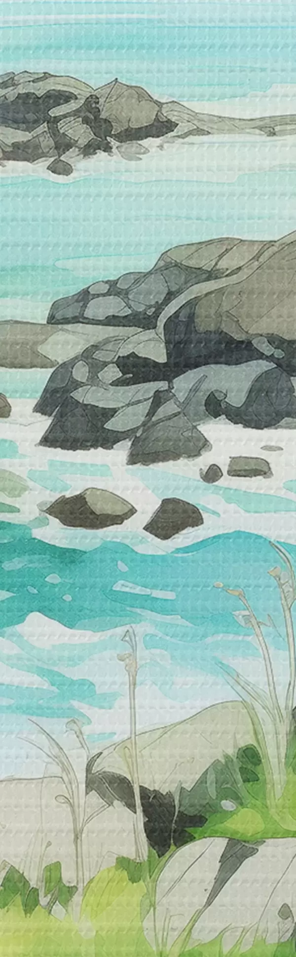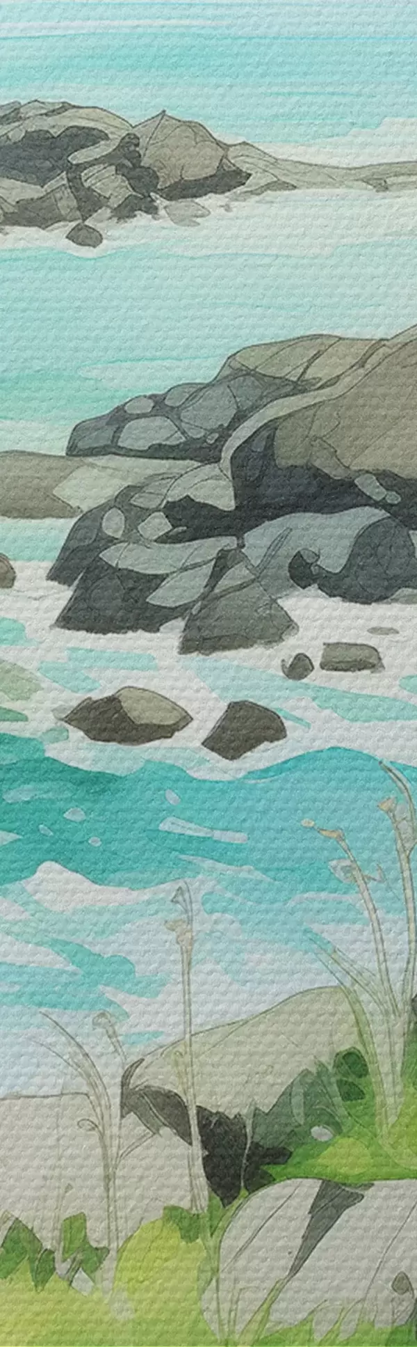 Picture Norway nature, fjords, summer landscape, green grass, mountains, watercolor style Nr s43188