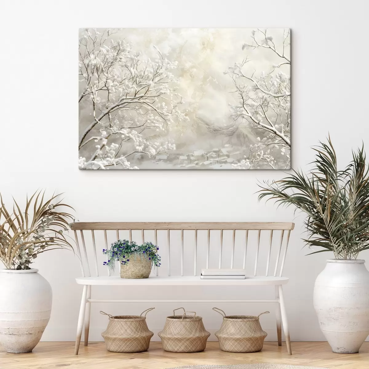 Picture Winter branches with snow against the background of a winter village Nr s43321