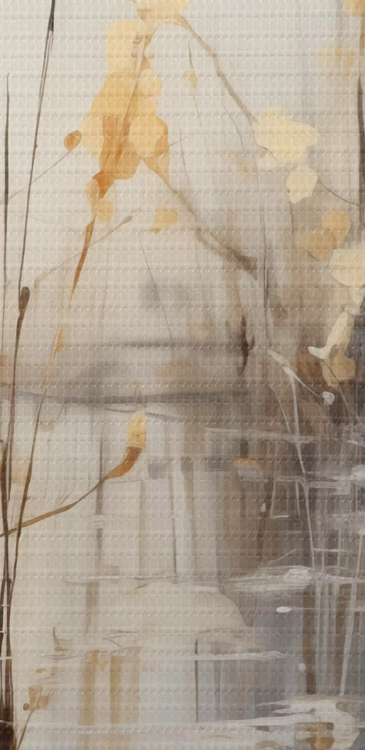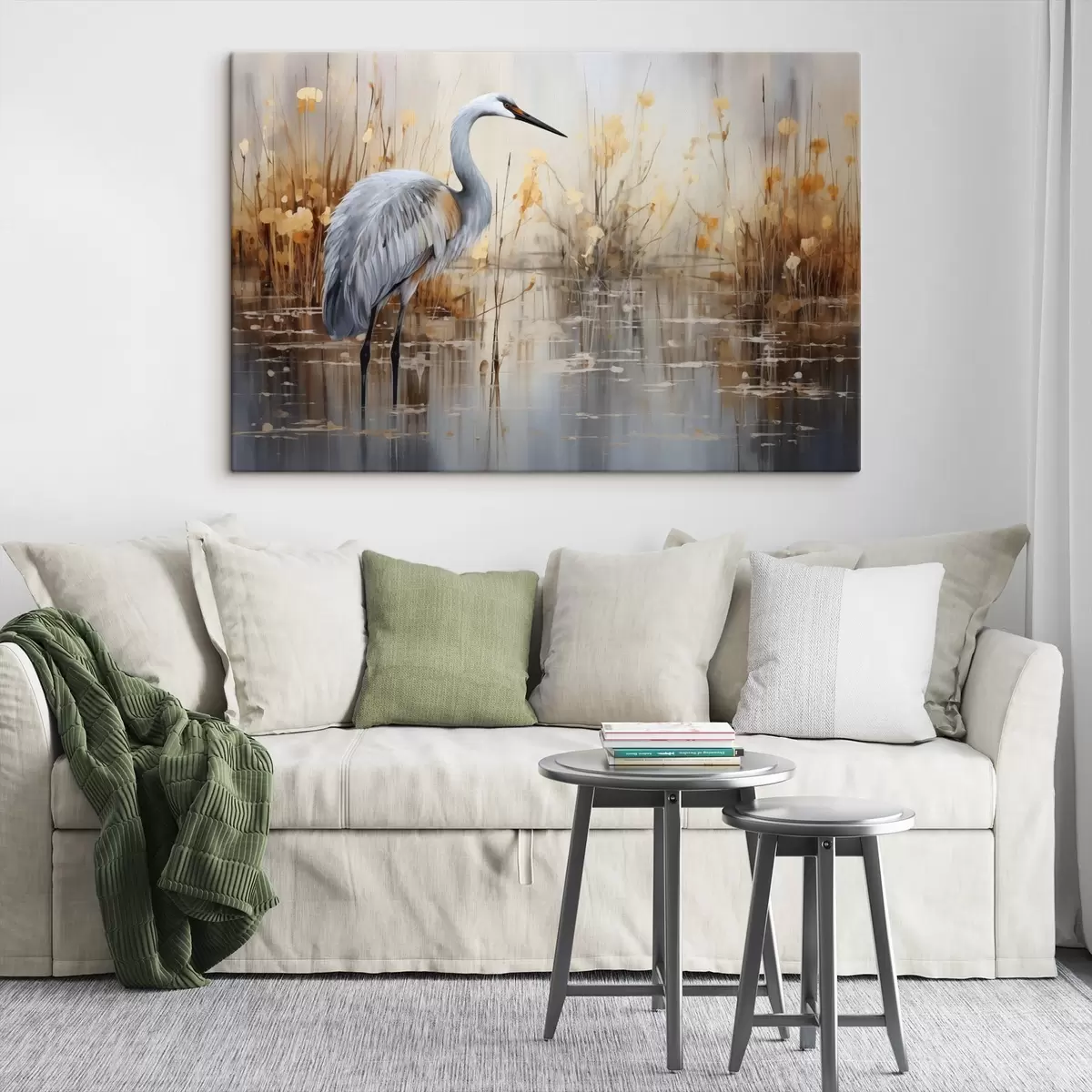 Picture A grey heron standing in a pond , surrounded by tall, thin plants, the background is a soft blend of beige and white Nr s43398