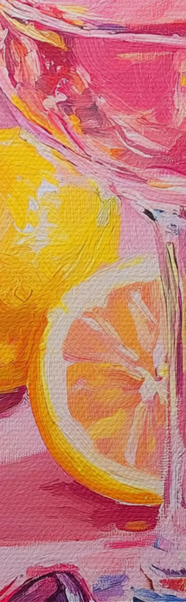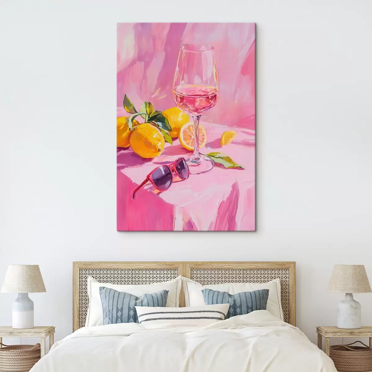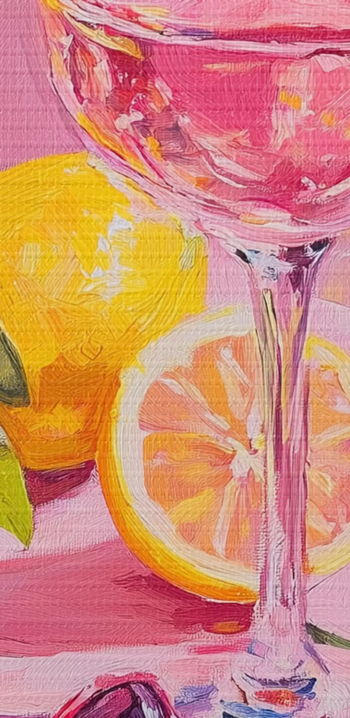 wall murals Glass of wine with lemons, sunglasses, abstraction, oil style drawing, pink colors s43883