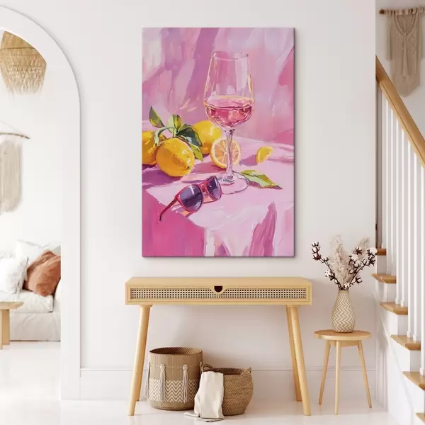 Picture Glass of wine with lemons, sunglasses, abstraction, oil style drawing, pink colors Nr s43883