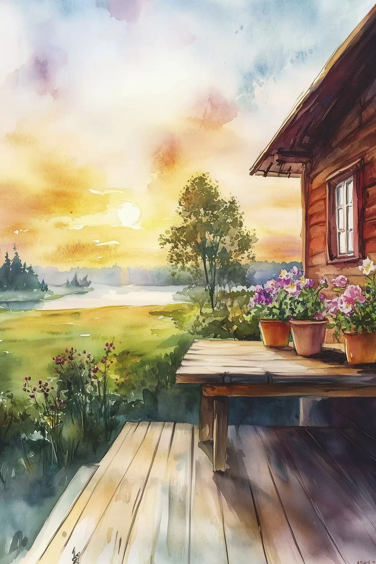 Picture Sunset colors, farmhouse, watercolor style, rustic, summer flowers Nr s44017