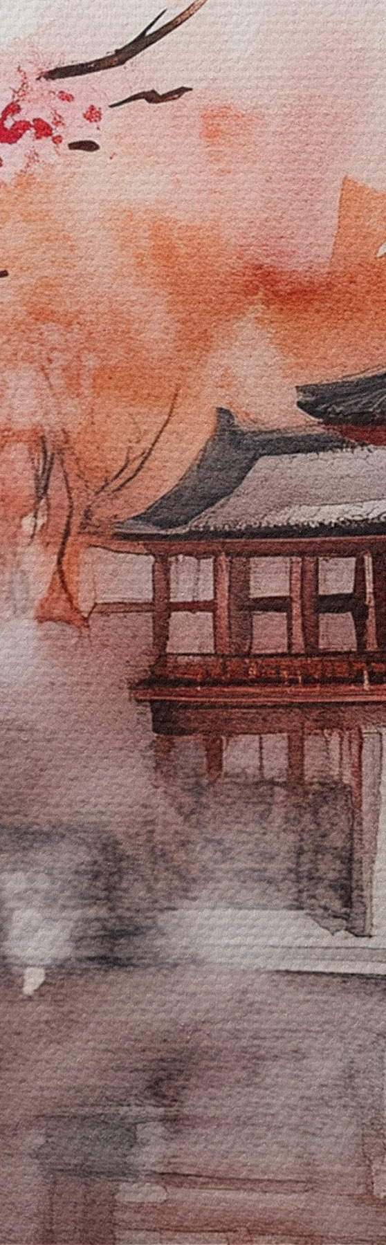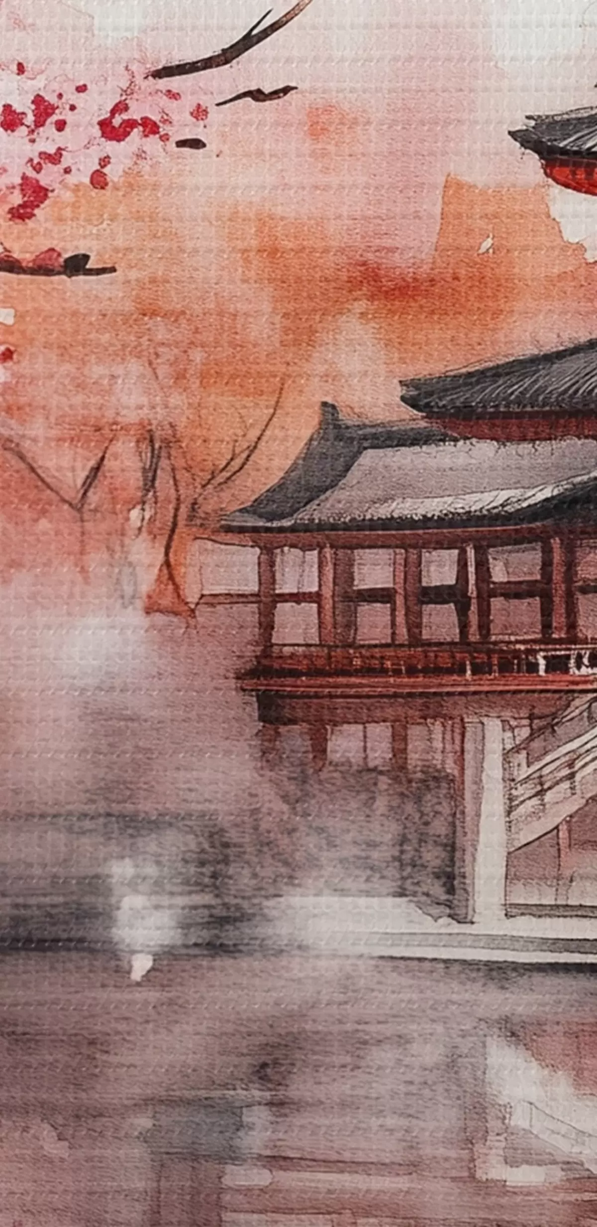 Picture Beautiful Japan landscape with blooming cherry tree and house on the lake Nr s44310