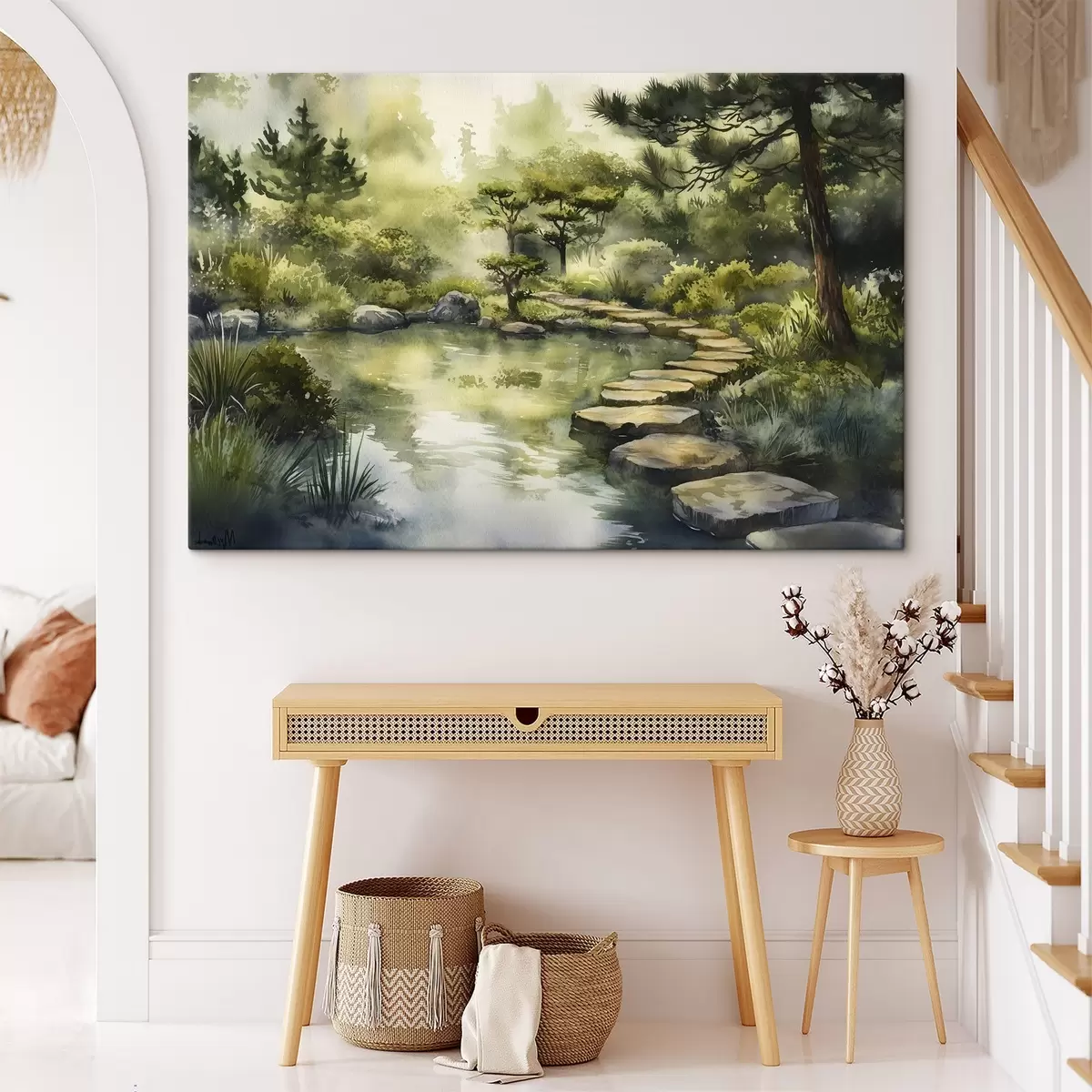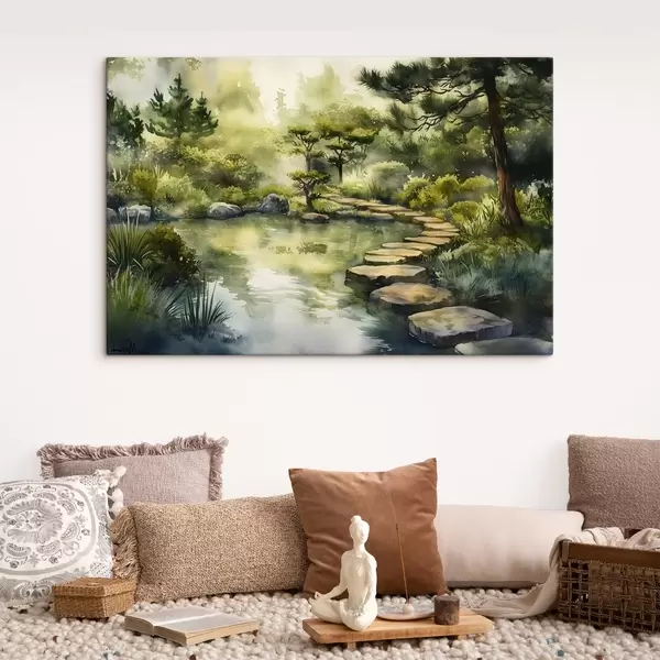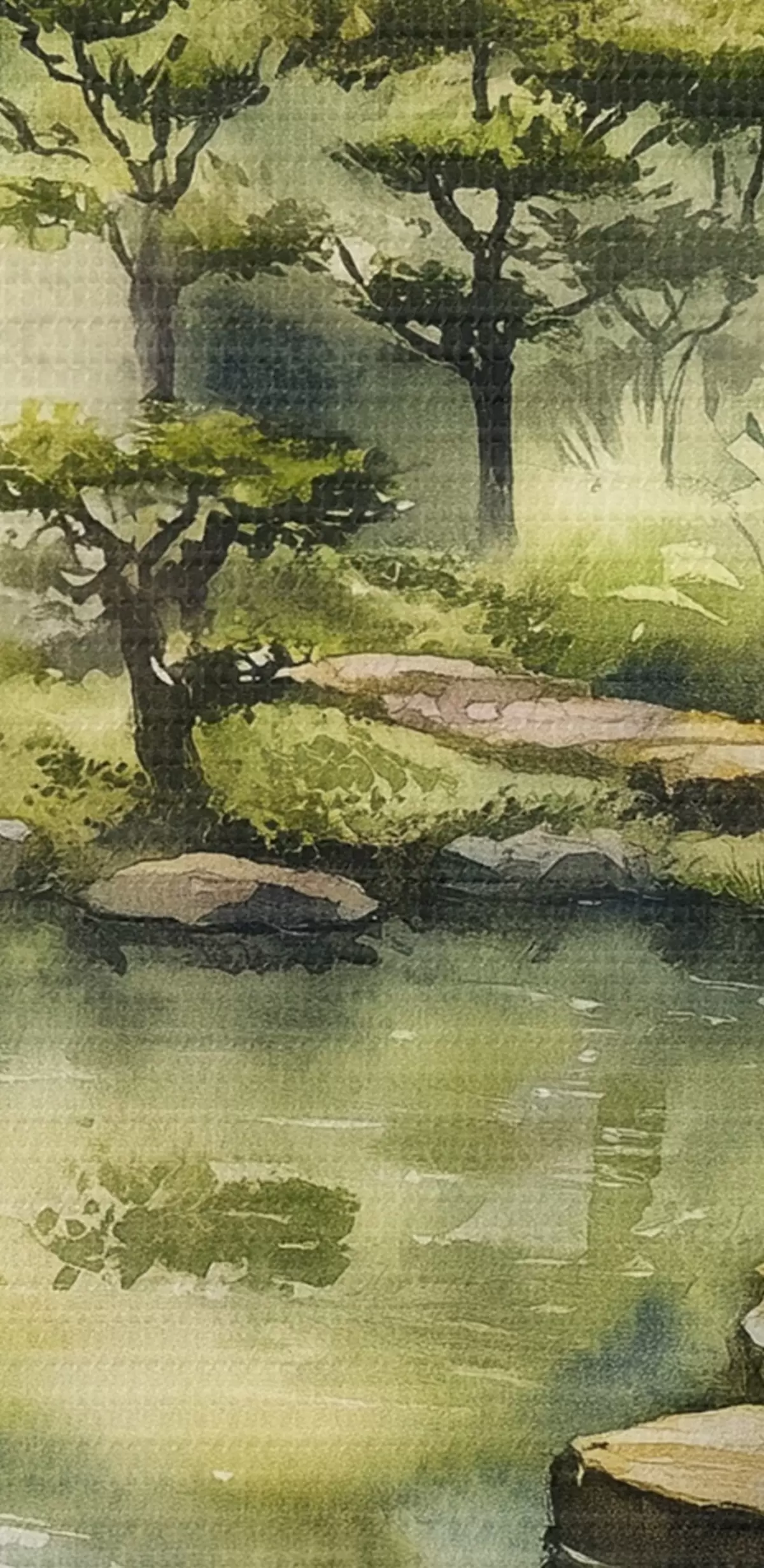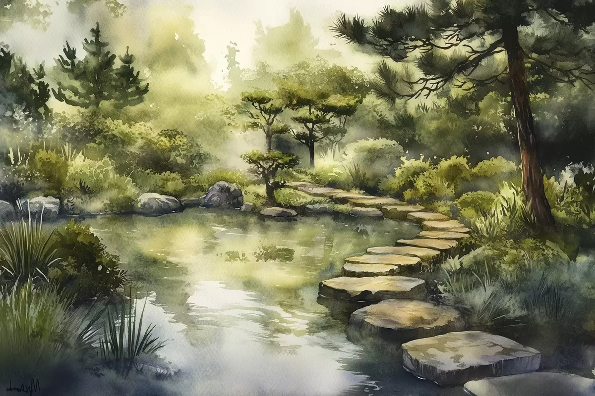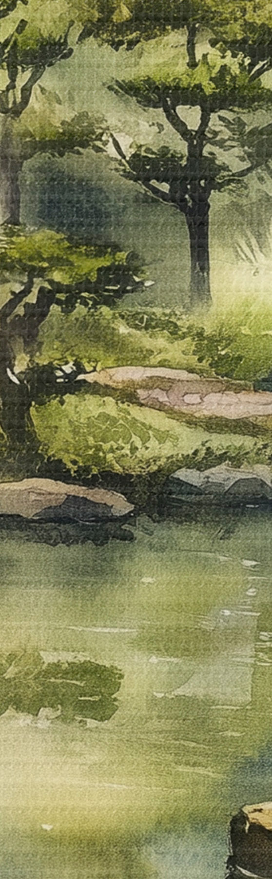 Picture Oriental forest with rocks, pond and pine trees, greenery, watercolor style Nr s44311