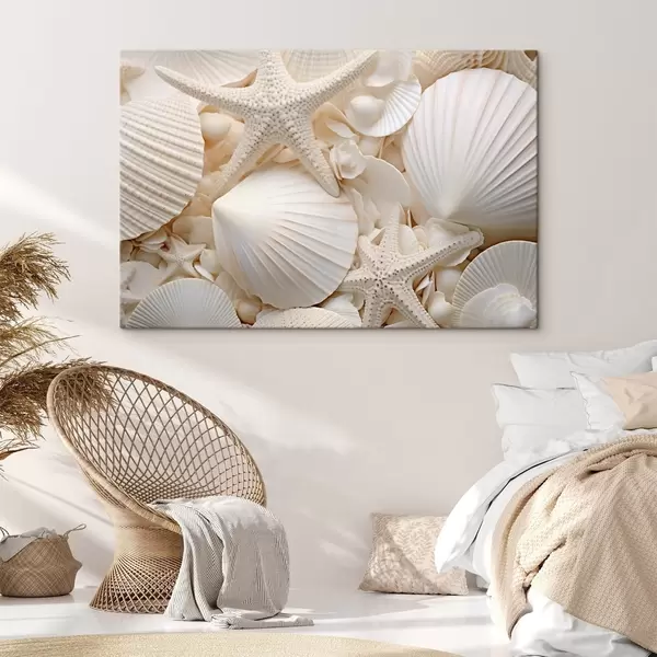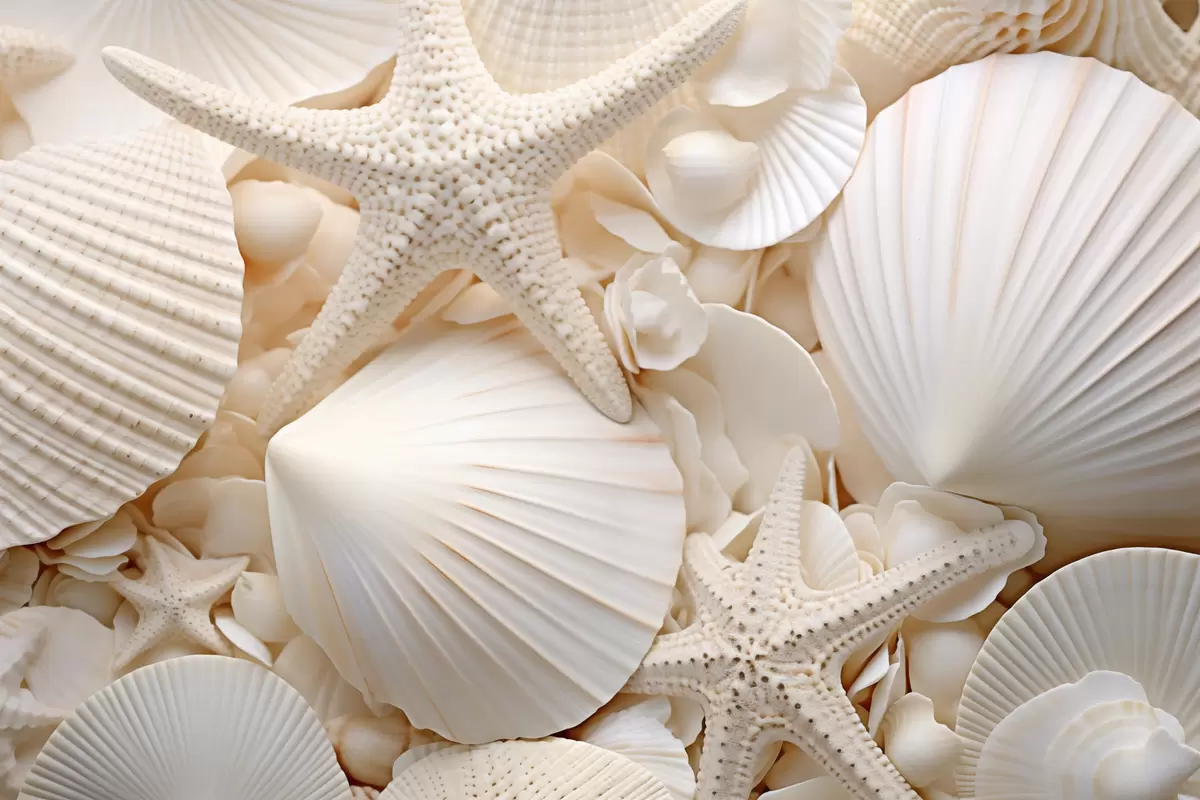 Picture Decorative white seashells and starfish, creating a textured monochromatic composition Nr s44392