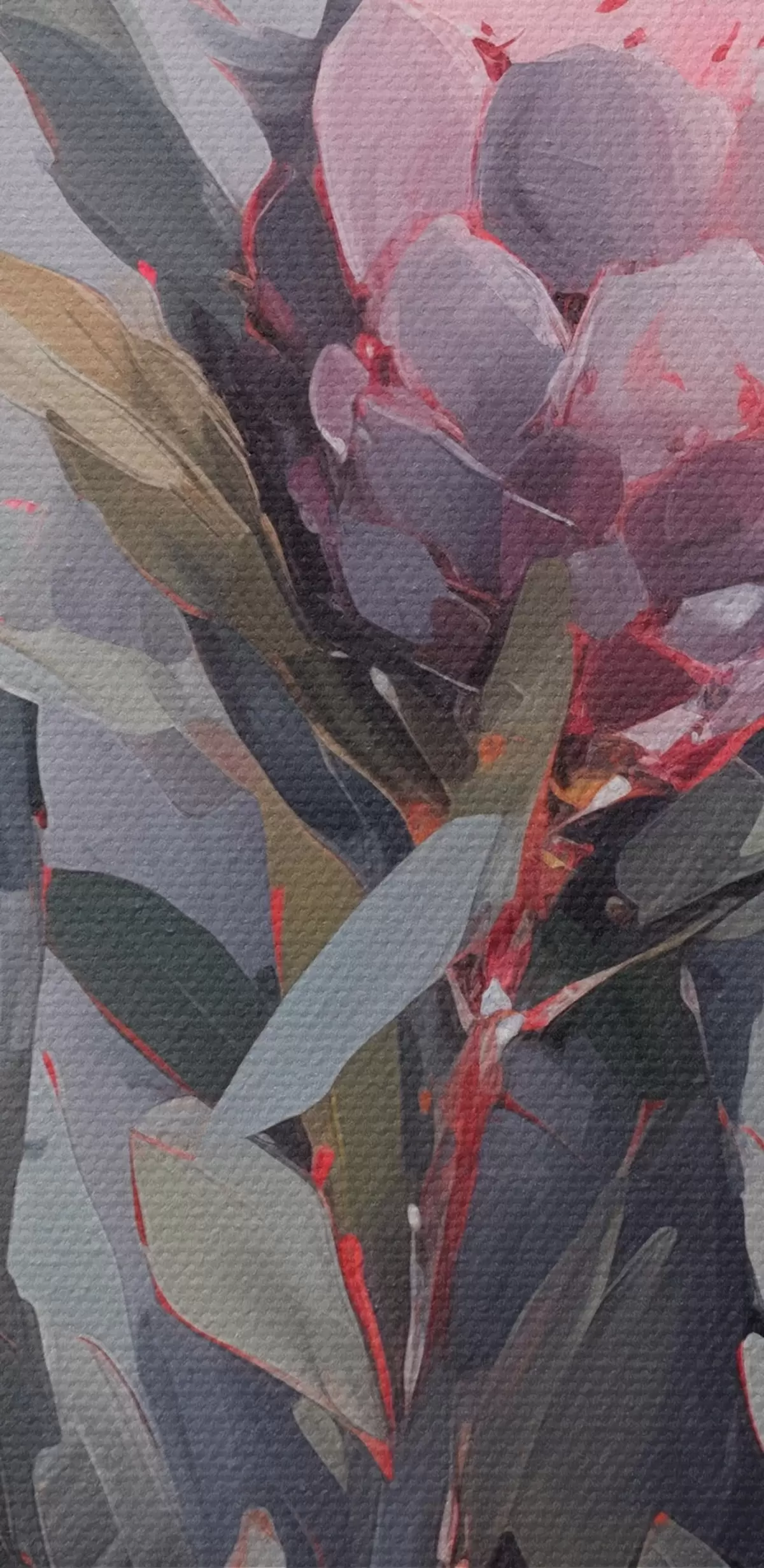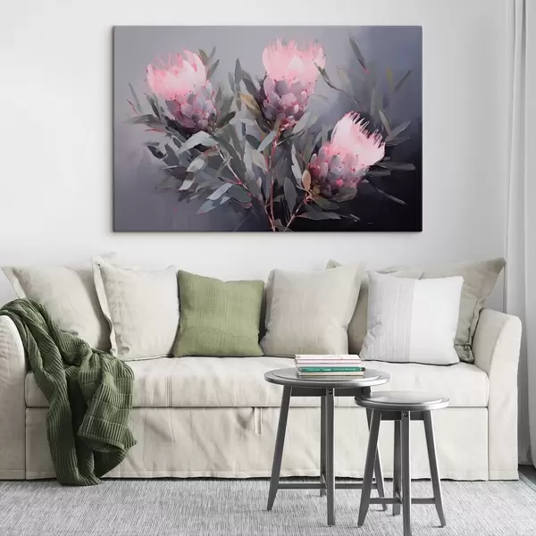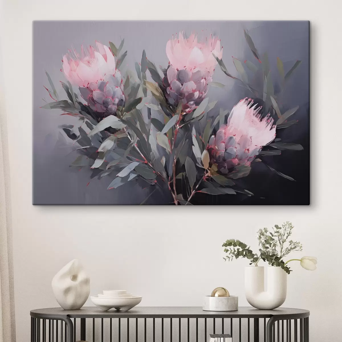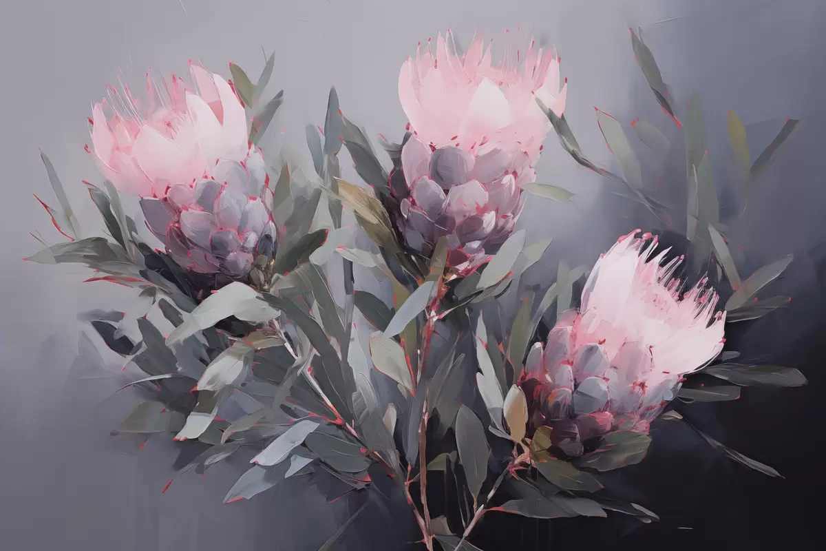 Picture Pink protea flowers with green leaves, soft brushstrokes, dark colors, elegant composition Nr s44400