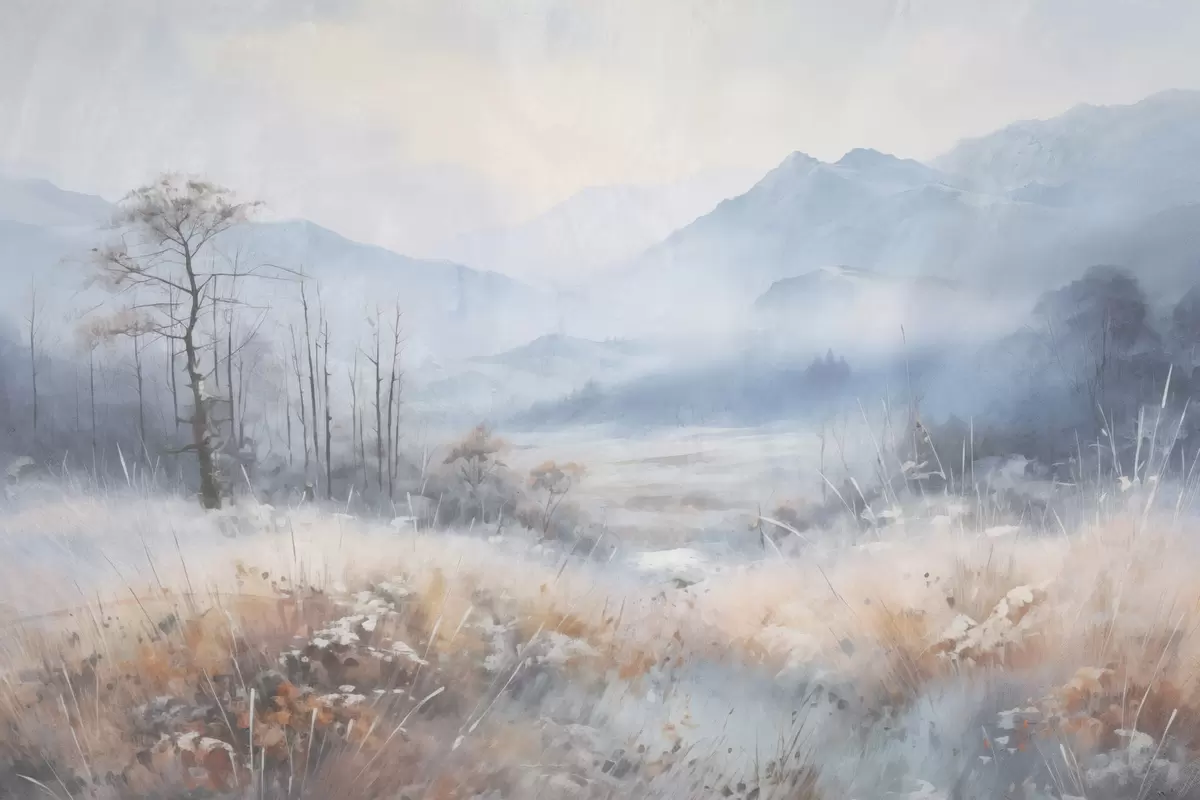 Picture Textured landscape with mountains, dry grass and a forest, muted colors Nr s44402