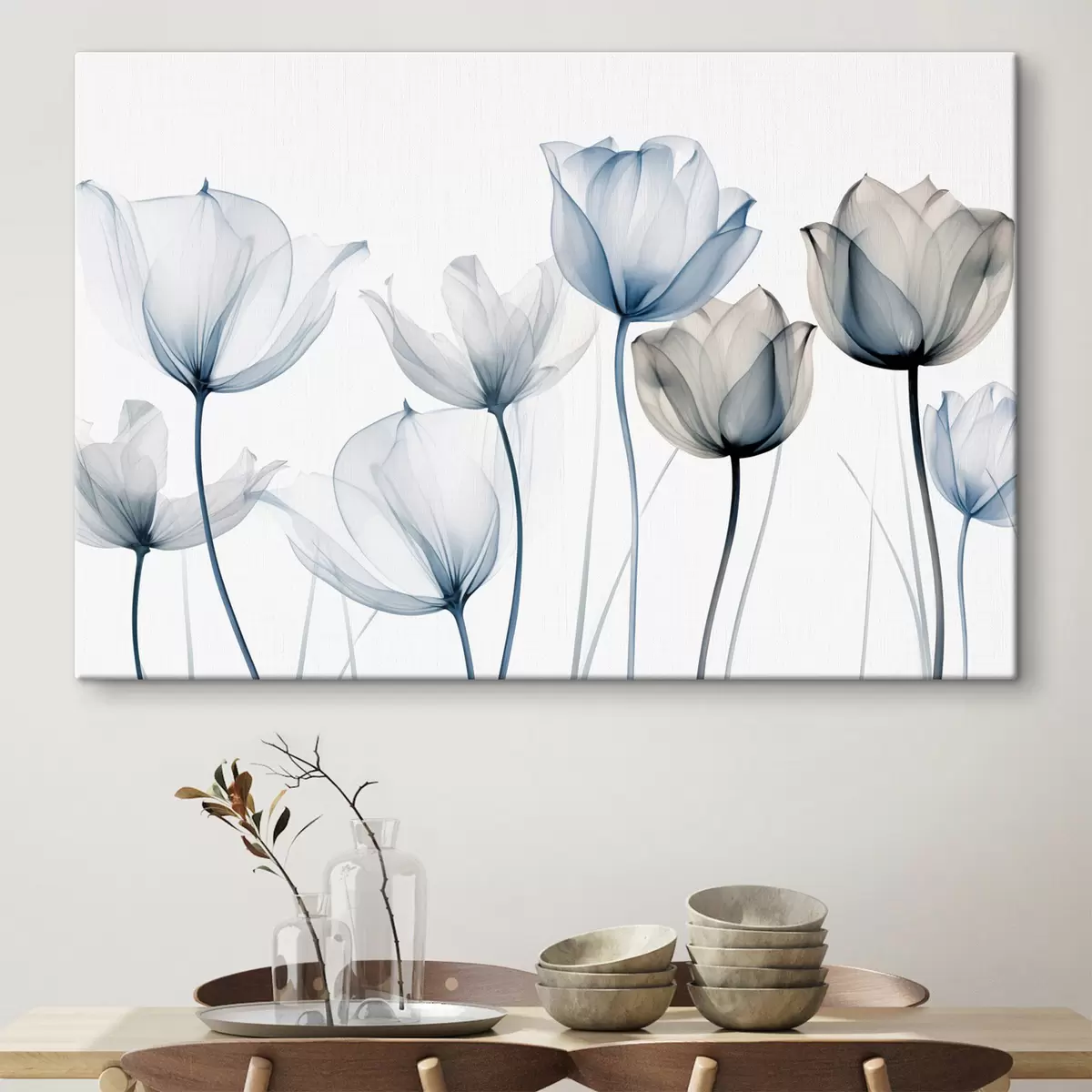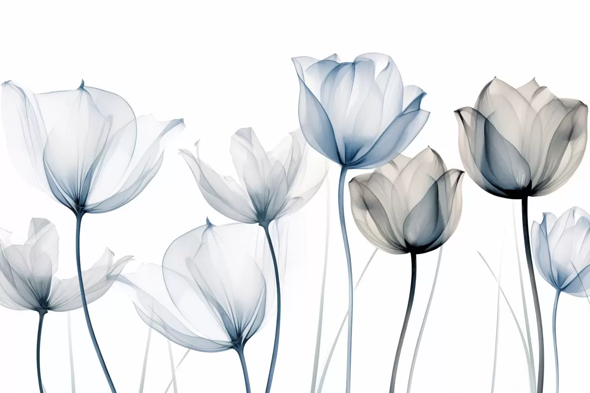 Picture Translucent blue and white tulips with long stems, against a plain white background Nr s44409