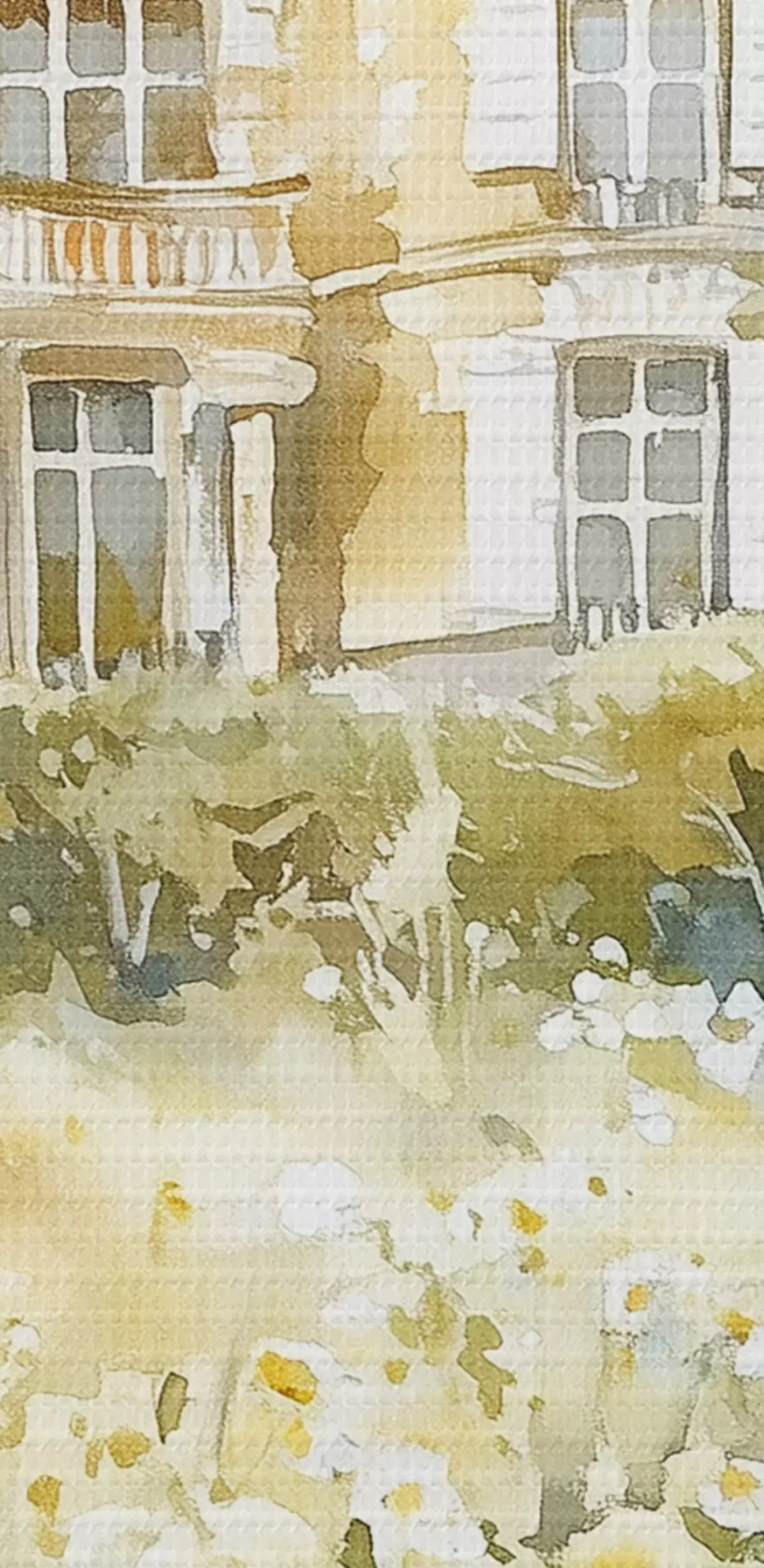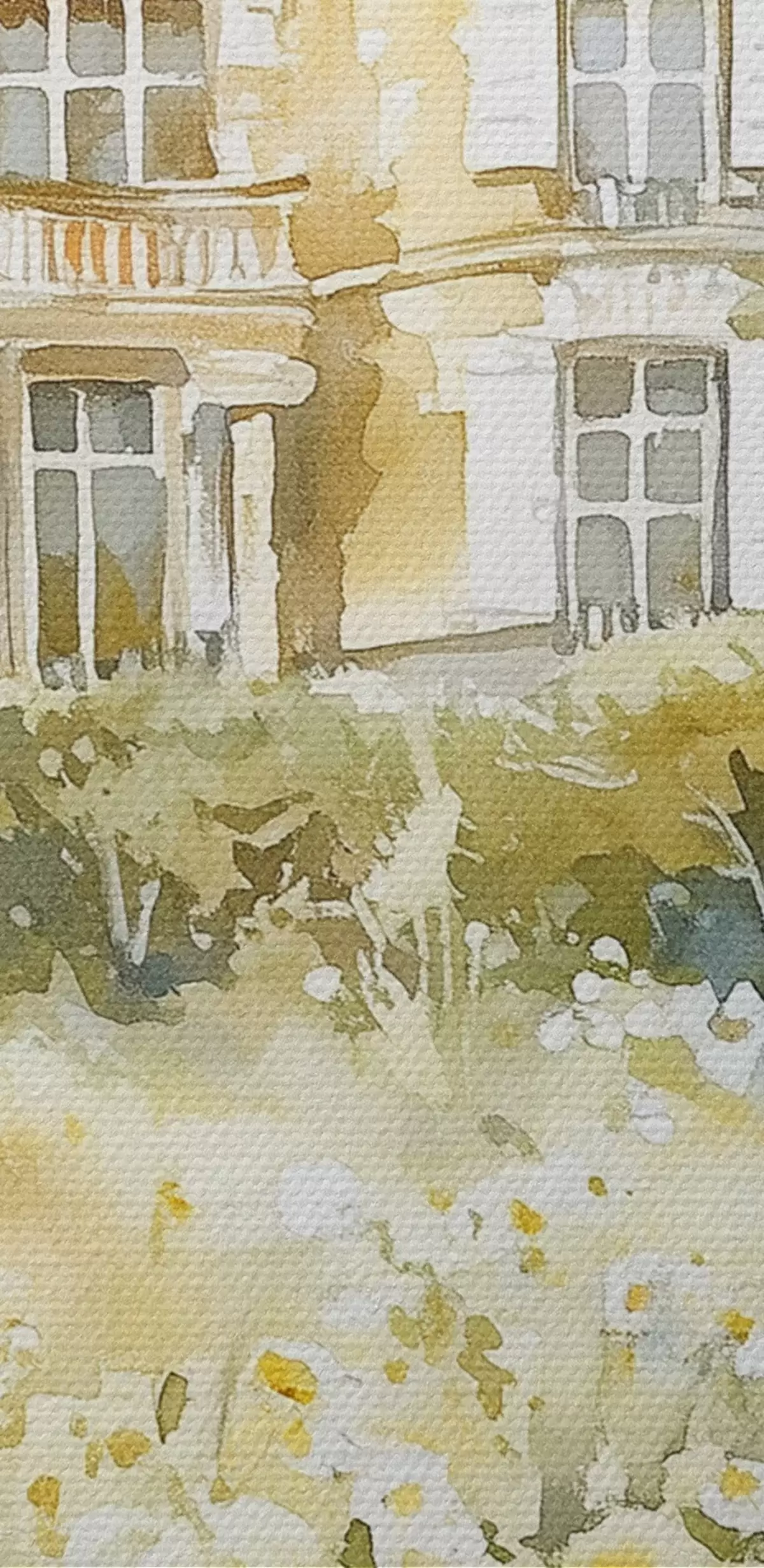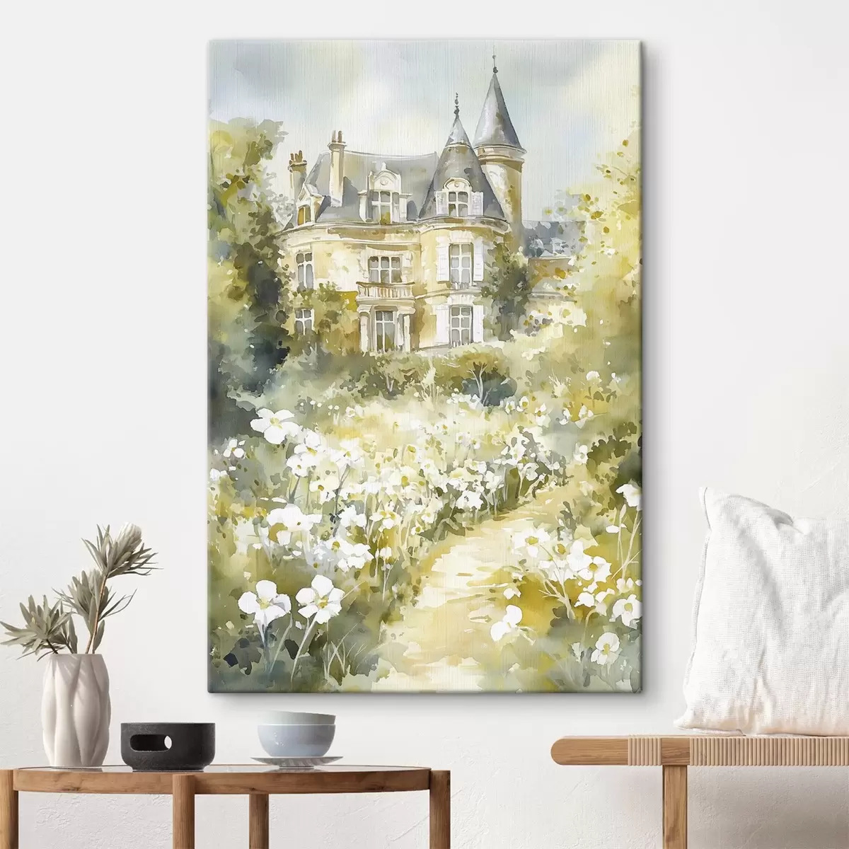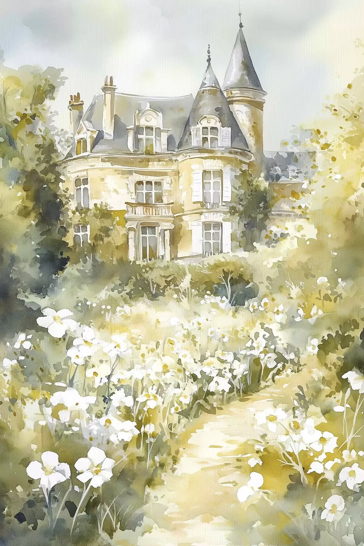 Picture Beautiful chateau with greenery and white flowers, watercolor style Nr s44506