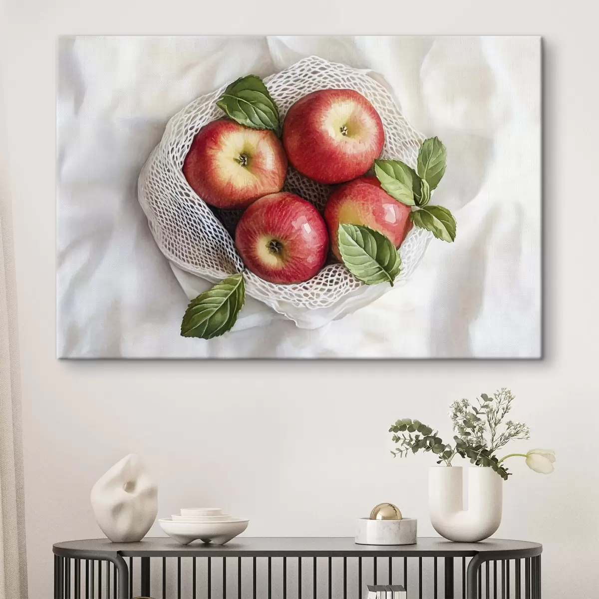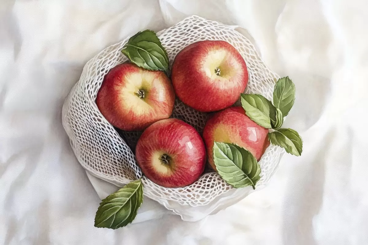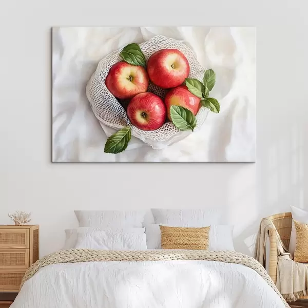 Picture Red apples in the linen bag with mint leaves, rustic style, fruits Nr s44609