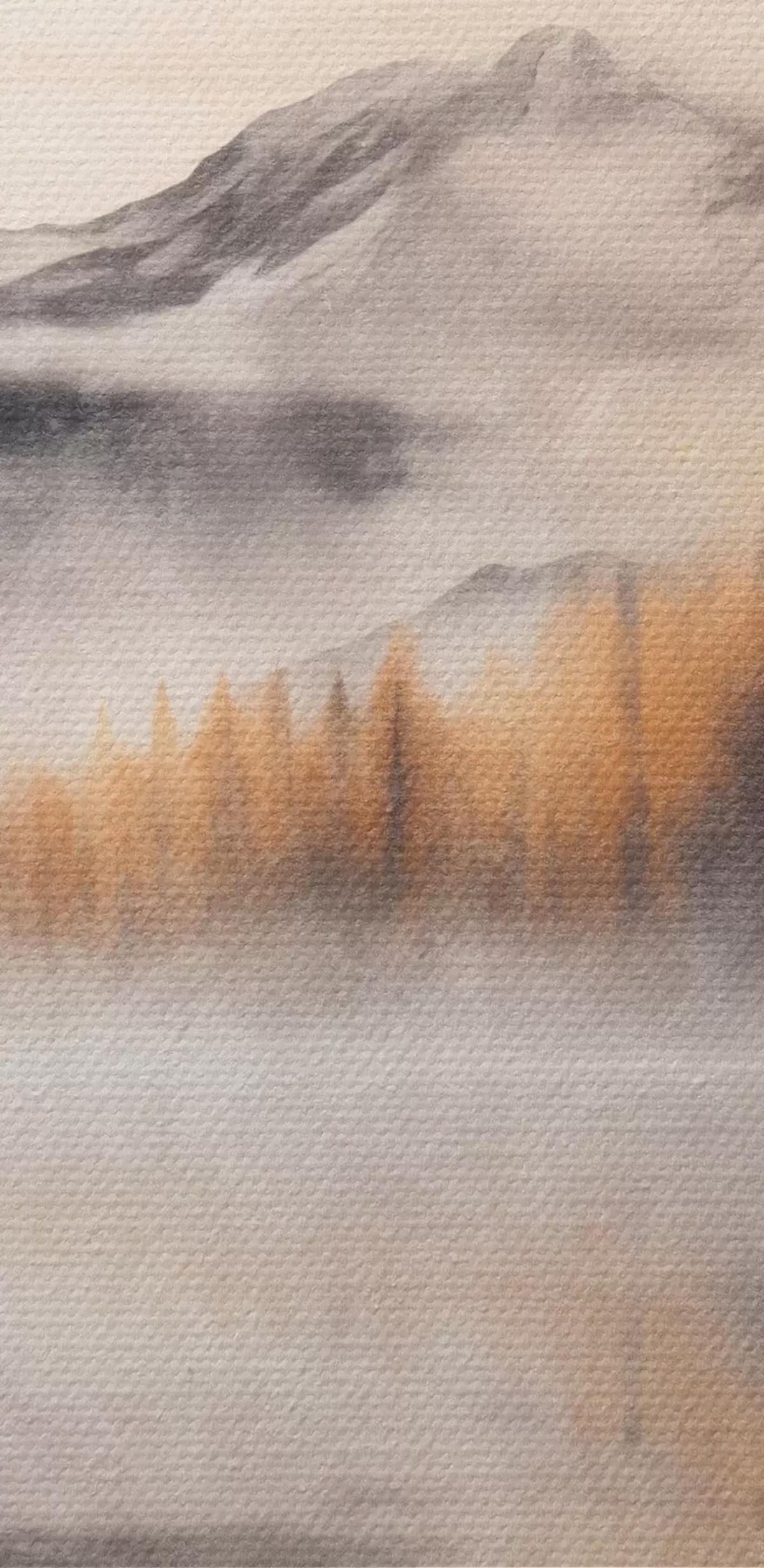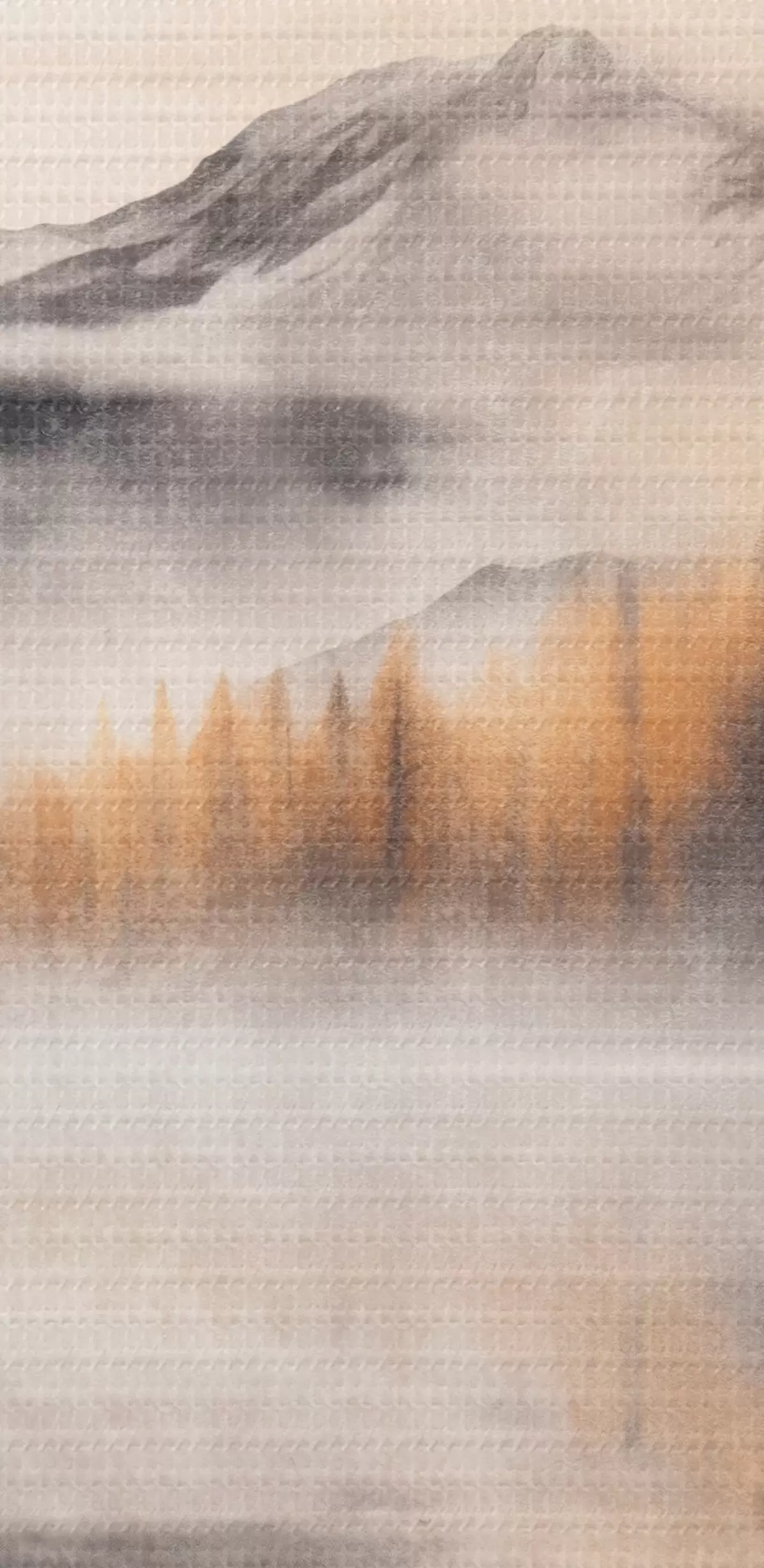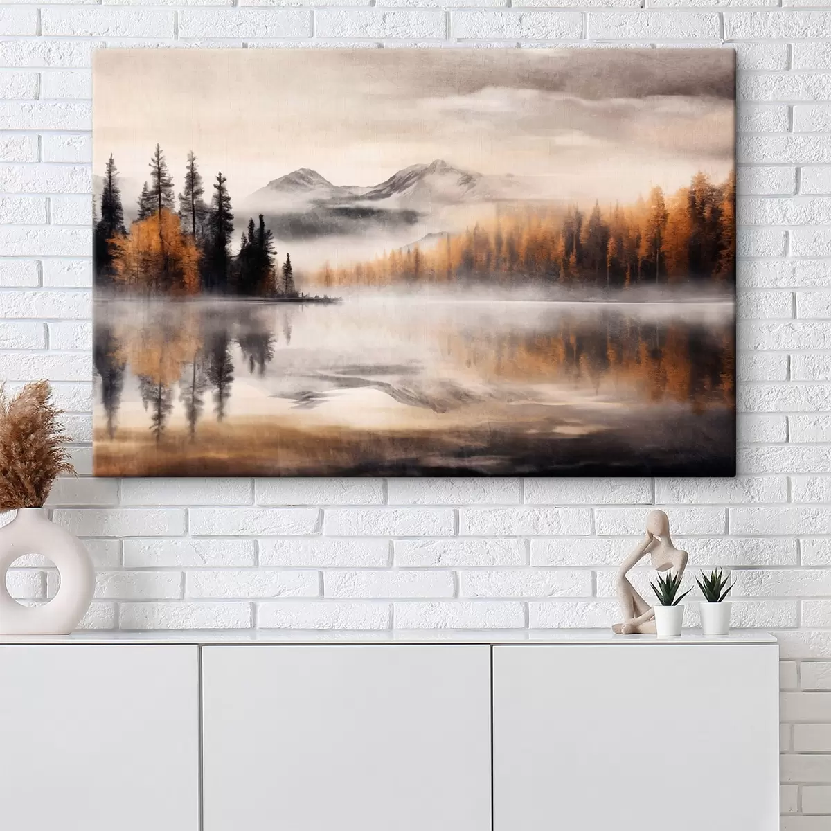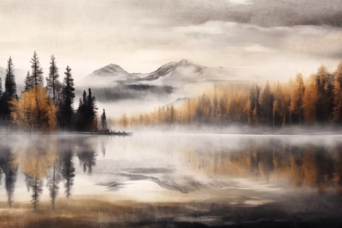 Picture A misty textured lake landscape with pine trees and mountains, cloudy gray sky Nr s44856