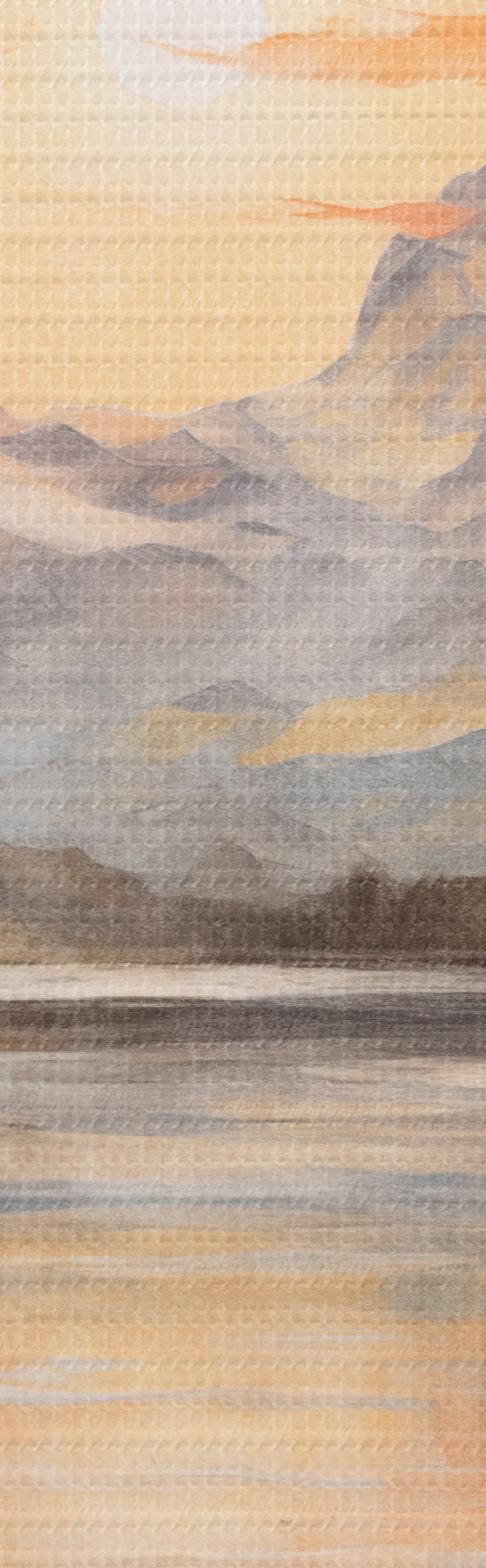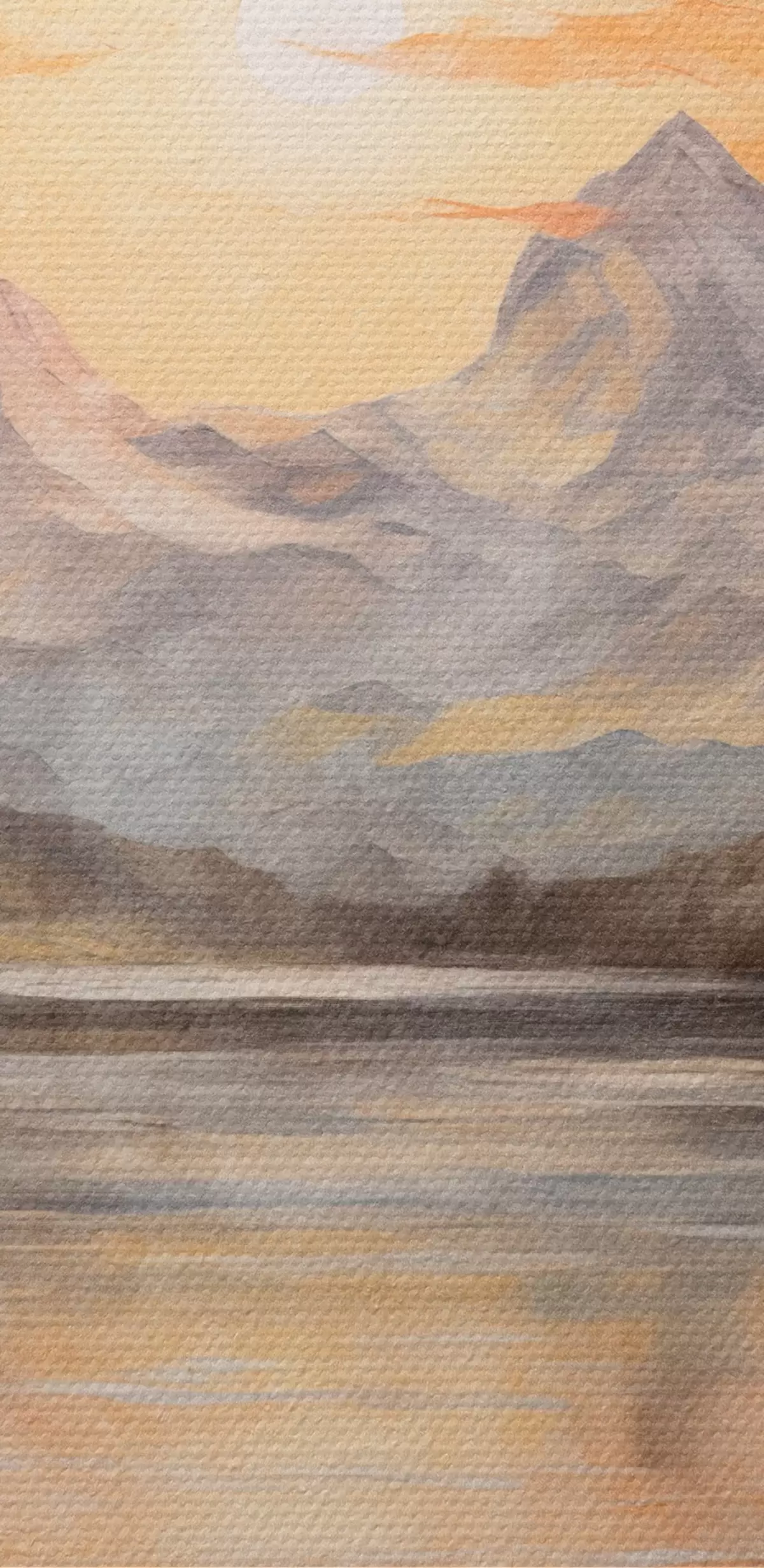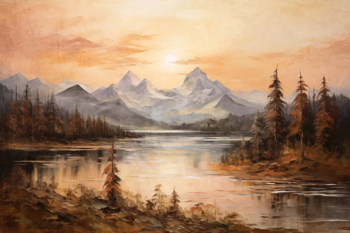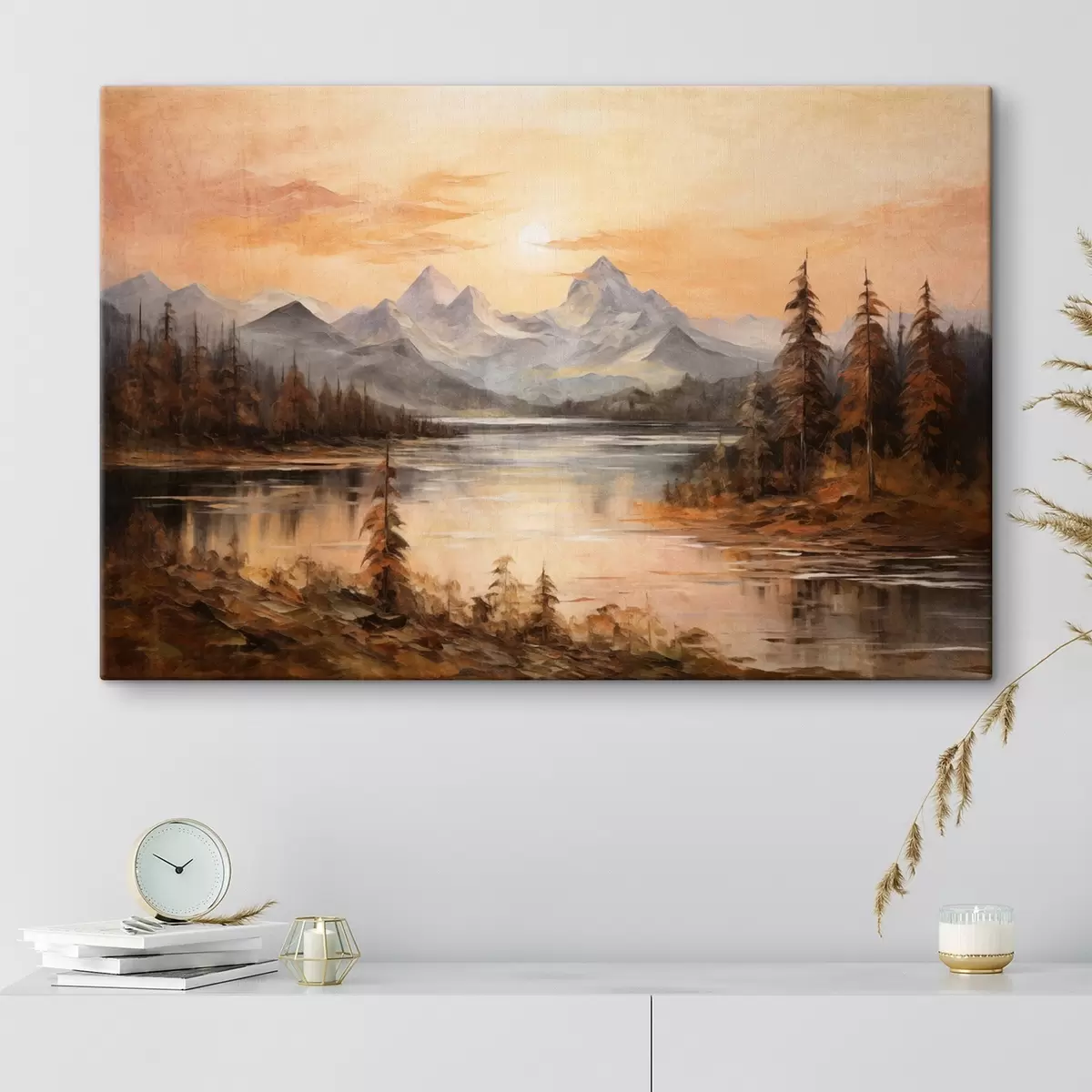 Picture Landscape with a lake surrounded by trees and mountains in the background, orange sky with the sun Nr s44857