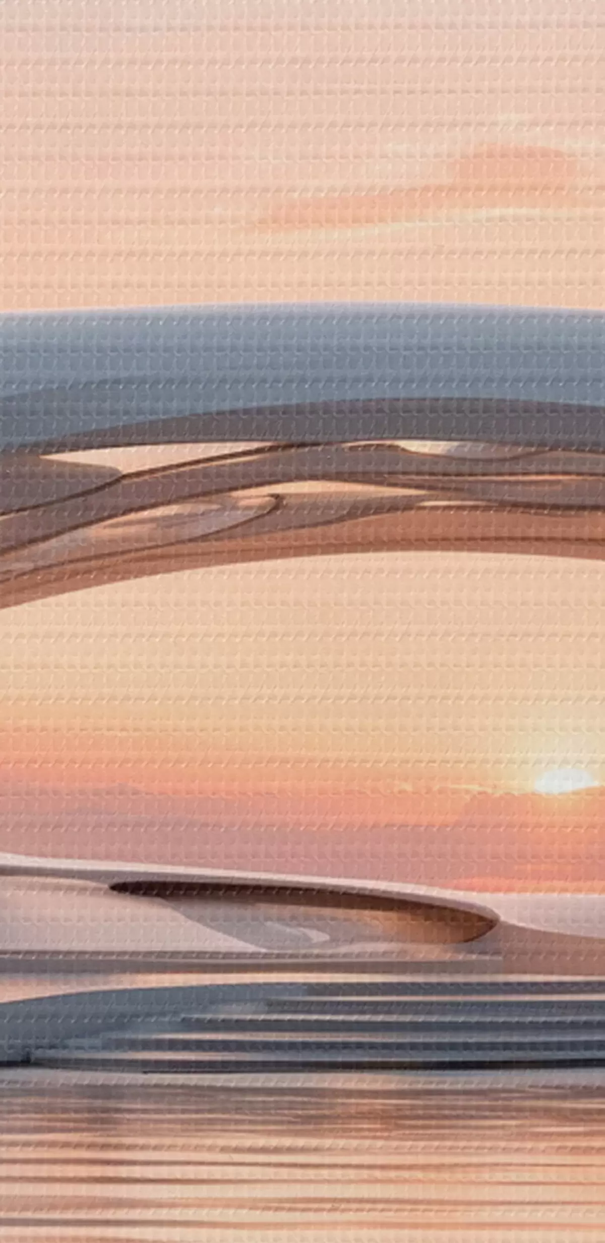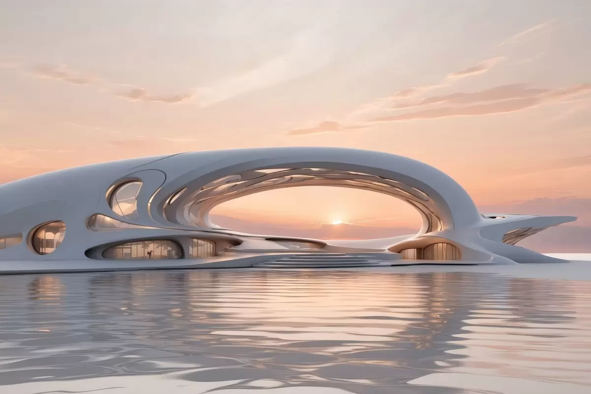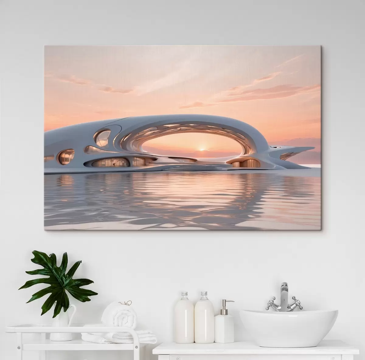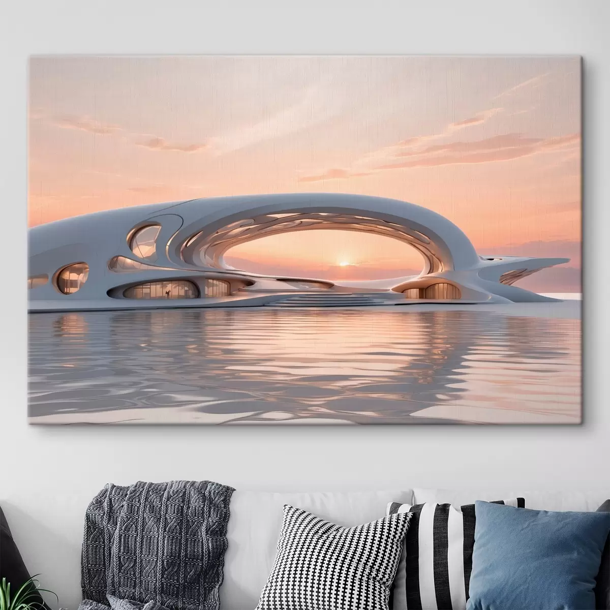 Picture Futuristic building on water against a pink sunset Nr s44884
