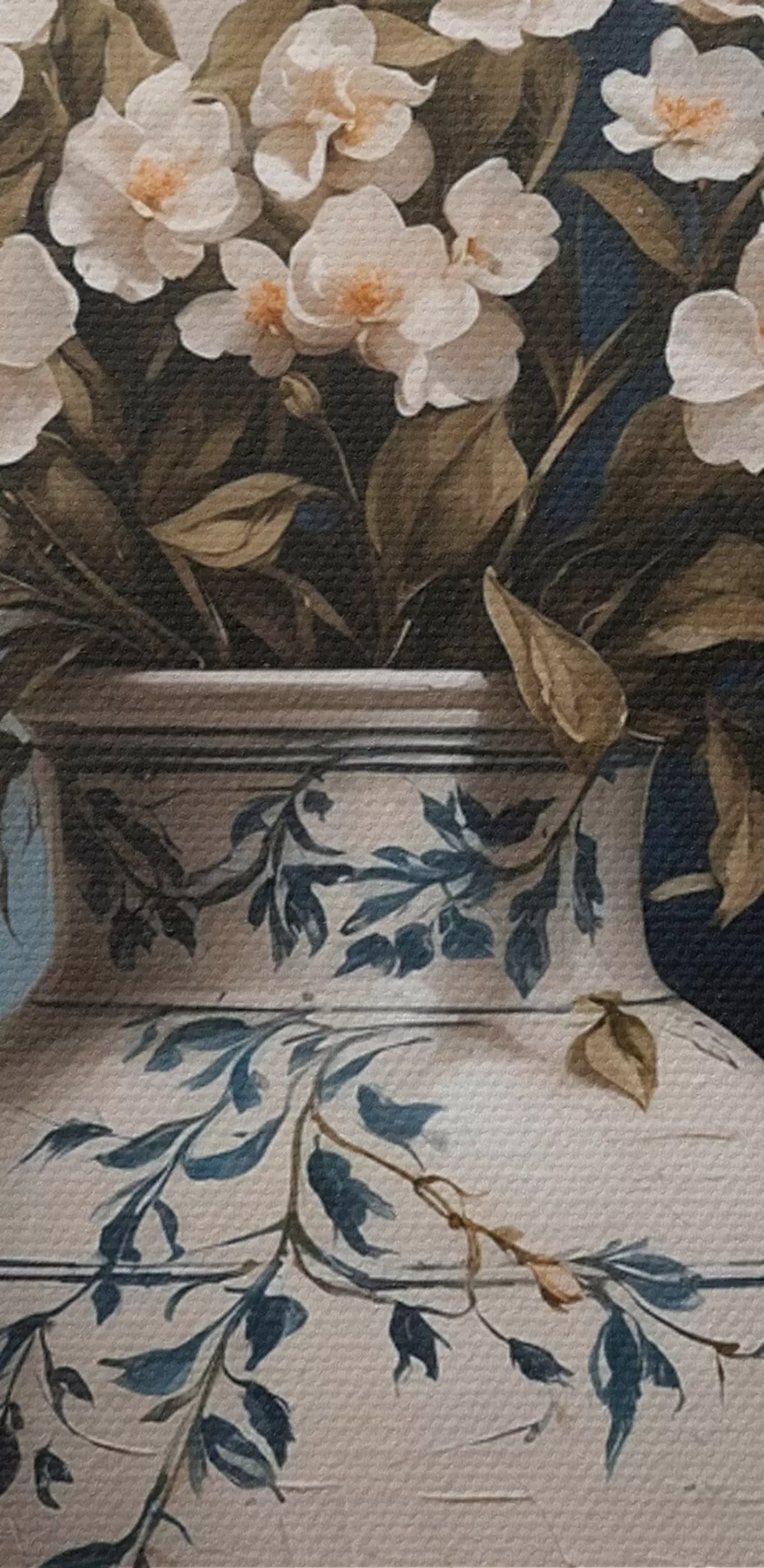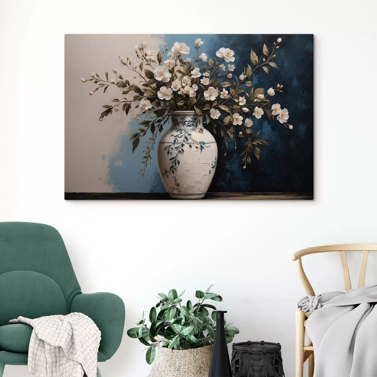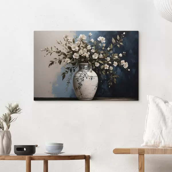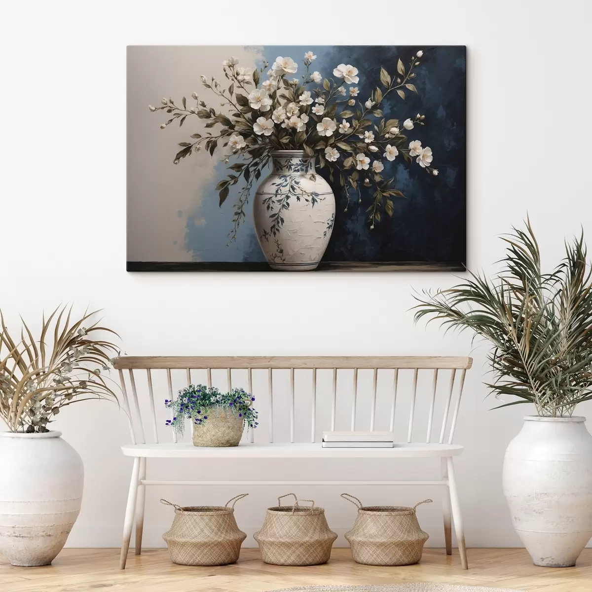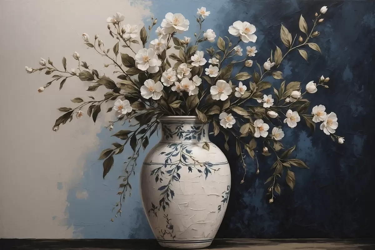 Picture White and yellow flowers in a large vase on a blue background Nr s44893