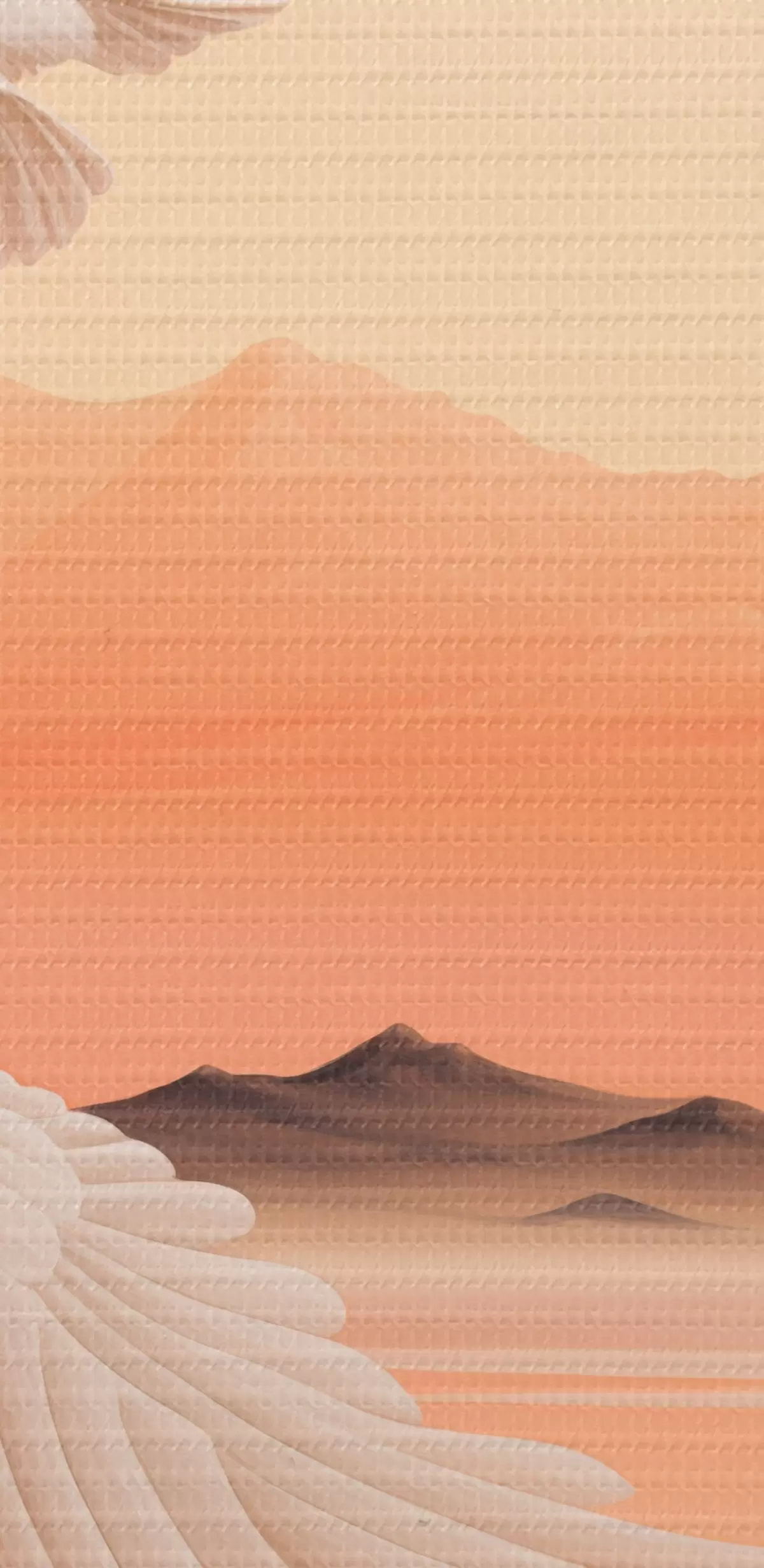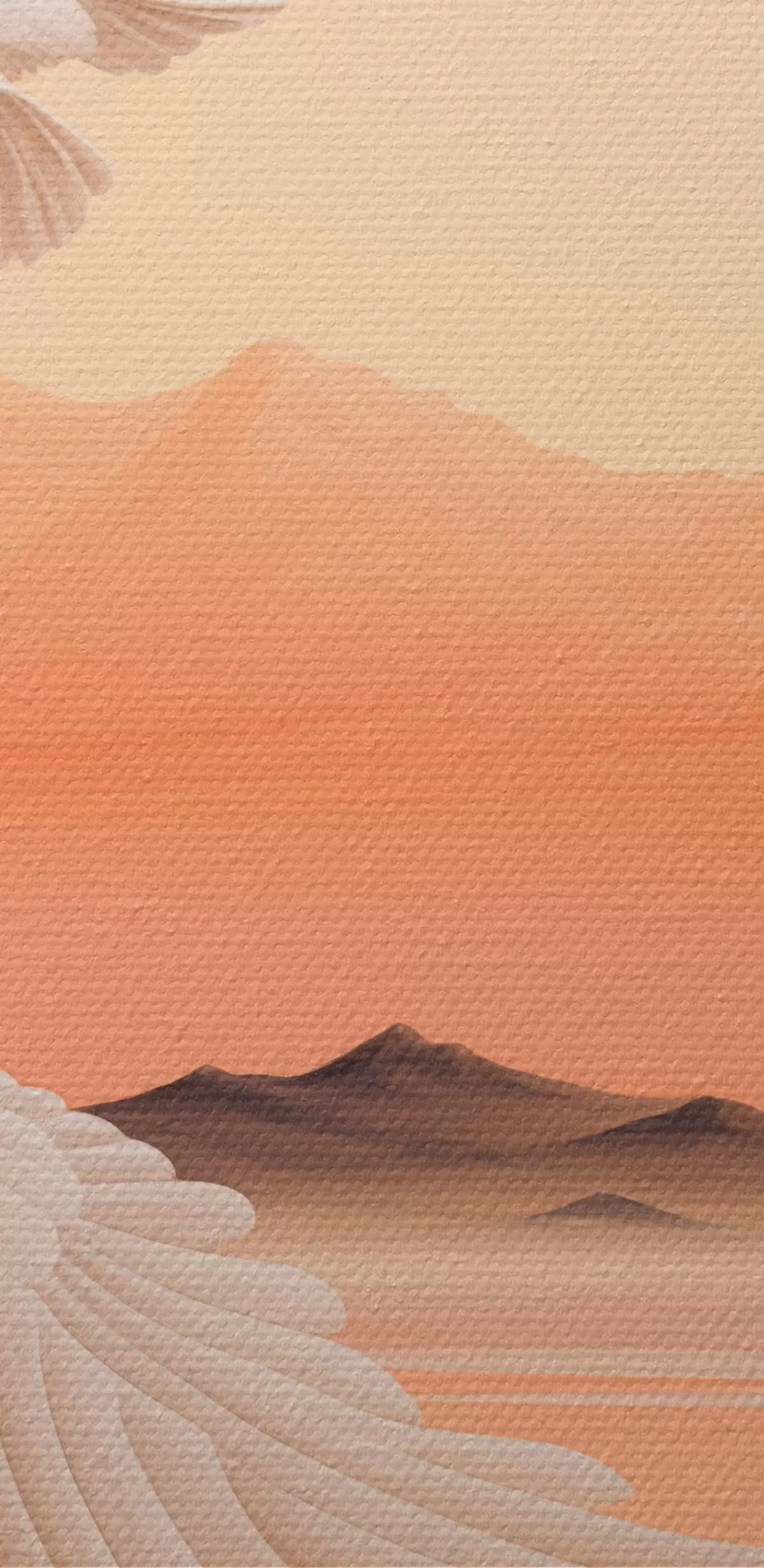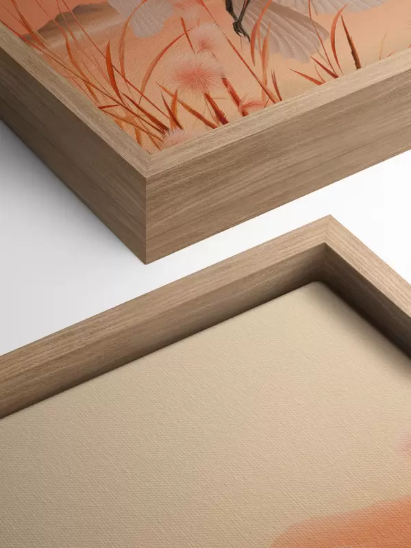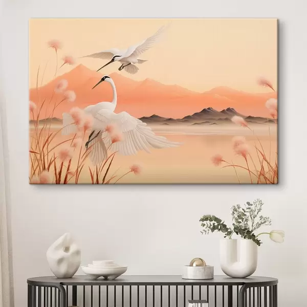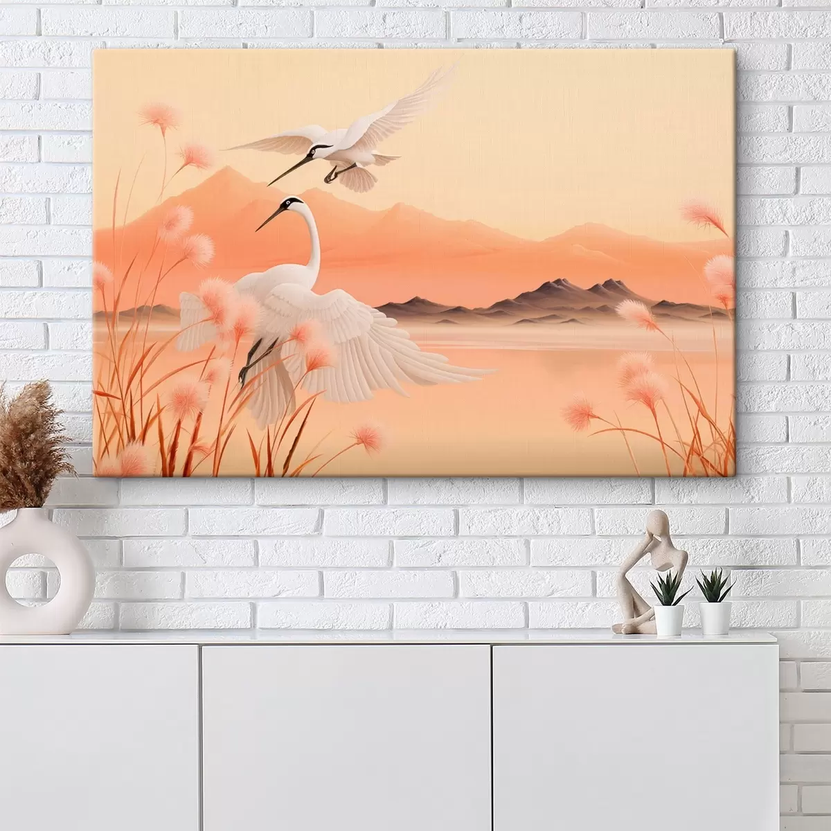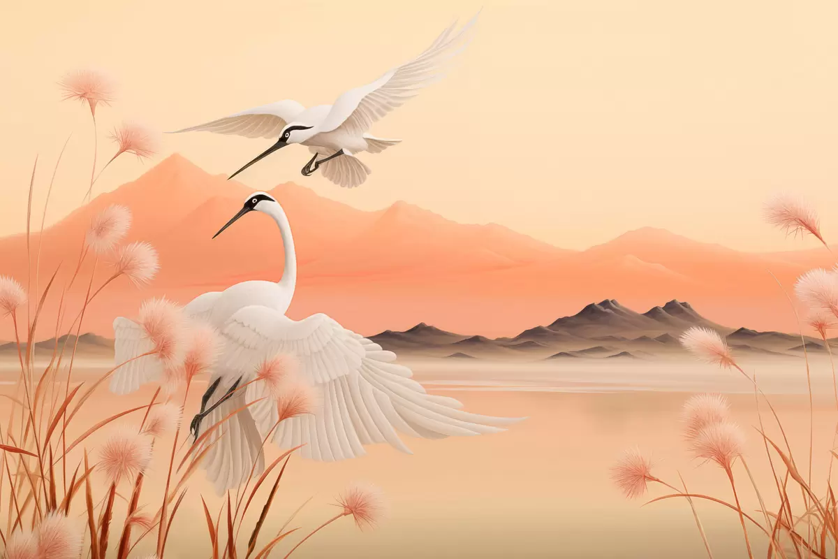 Picture White cranes with pink reeds in the foreground, mountains and a lake in the background, soft orange light Nr s44925