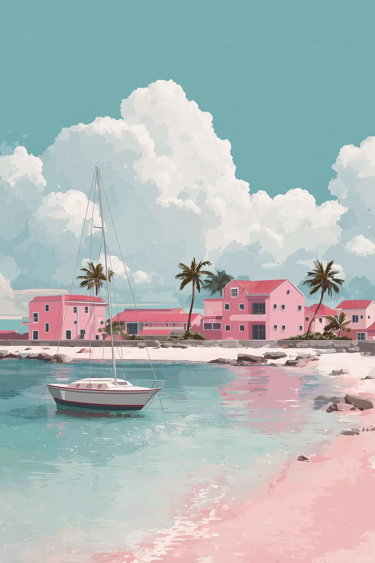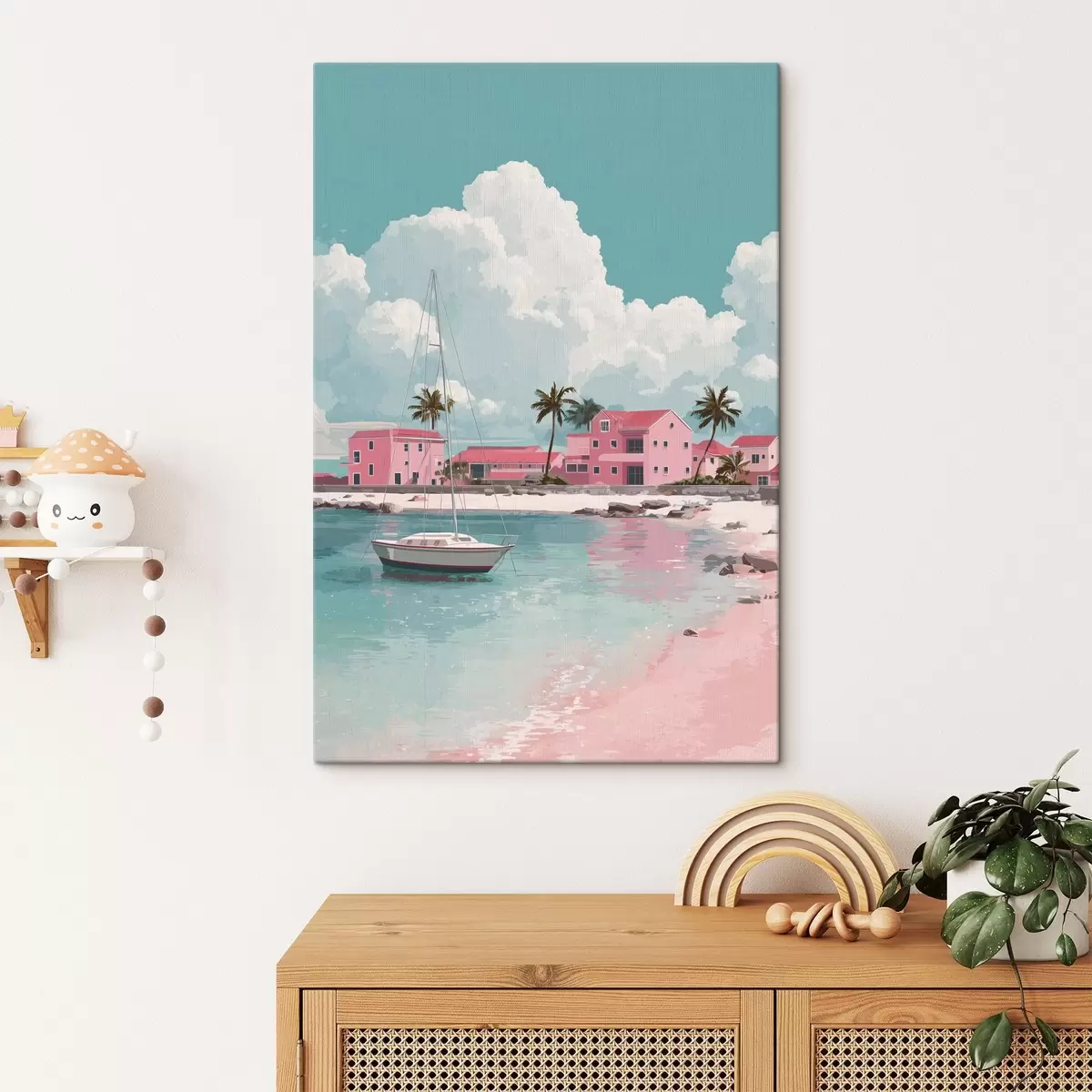 Picture Pink beach with bright sunshine, sailboat and houses Nr s44986