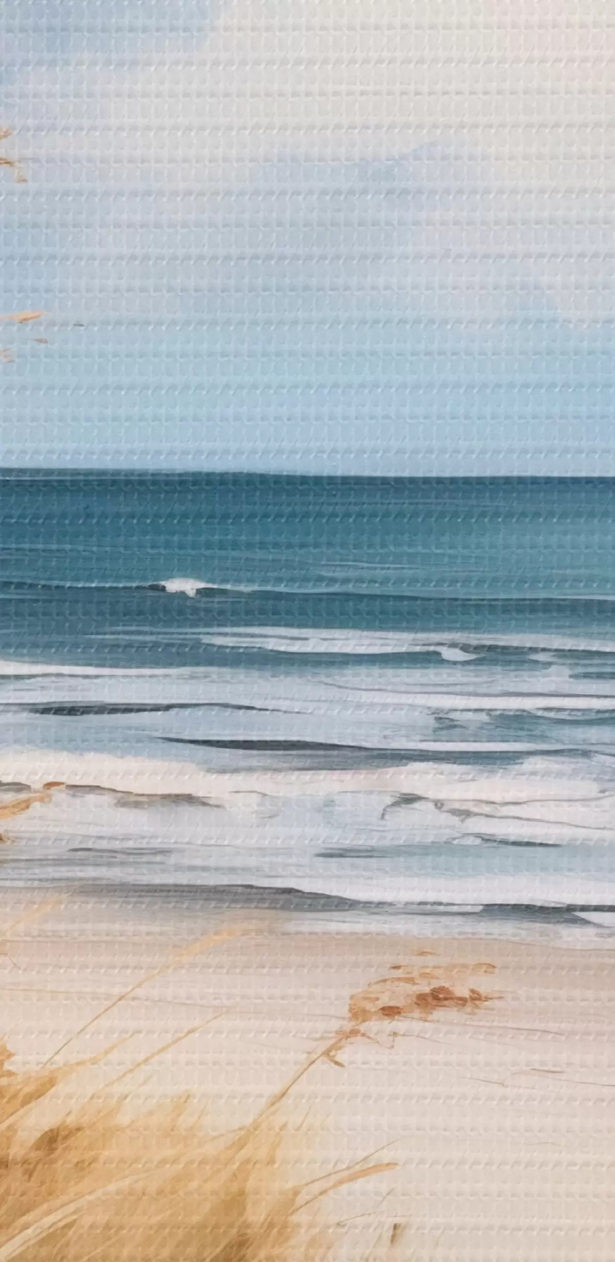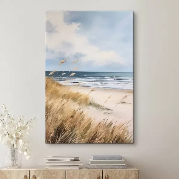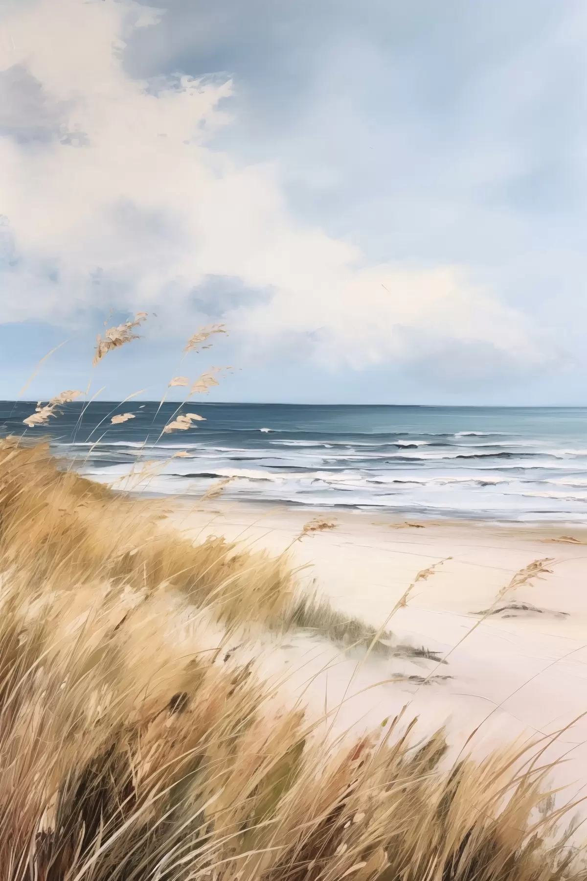 Picture A sandy beach with tall grass in the foreground, the ocean with waves and a cloudy sky in the background Nr s45174