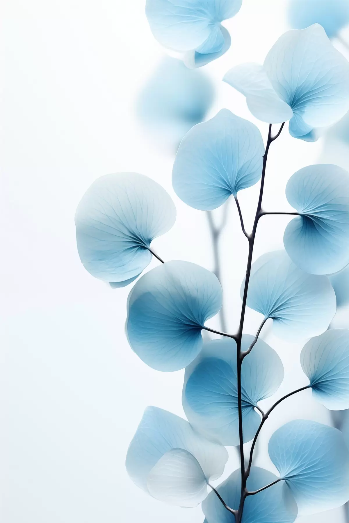 Picture Branch with translucent blue leaves, delicate veins visible, light and calm composition, minimalist aesthetic Nr s45176