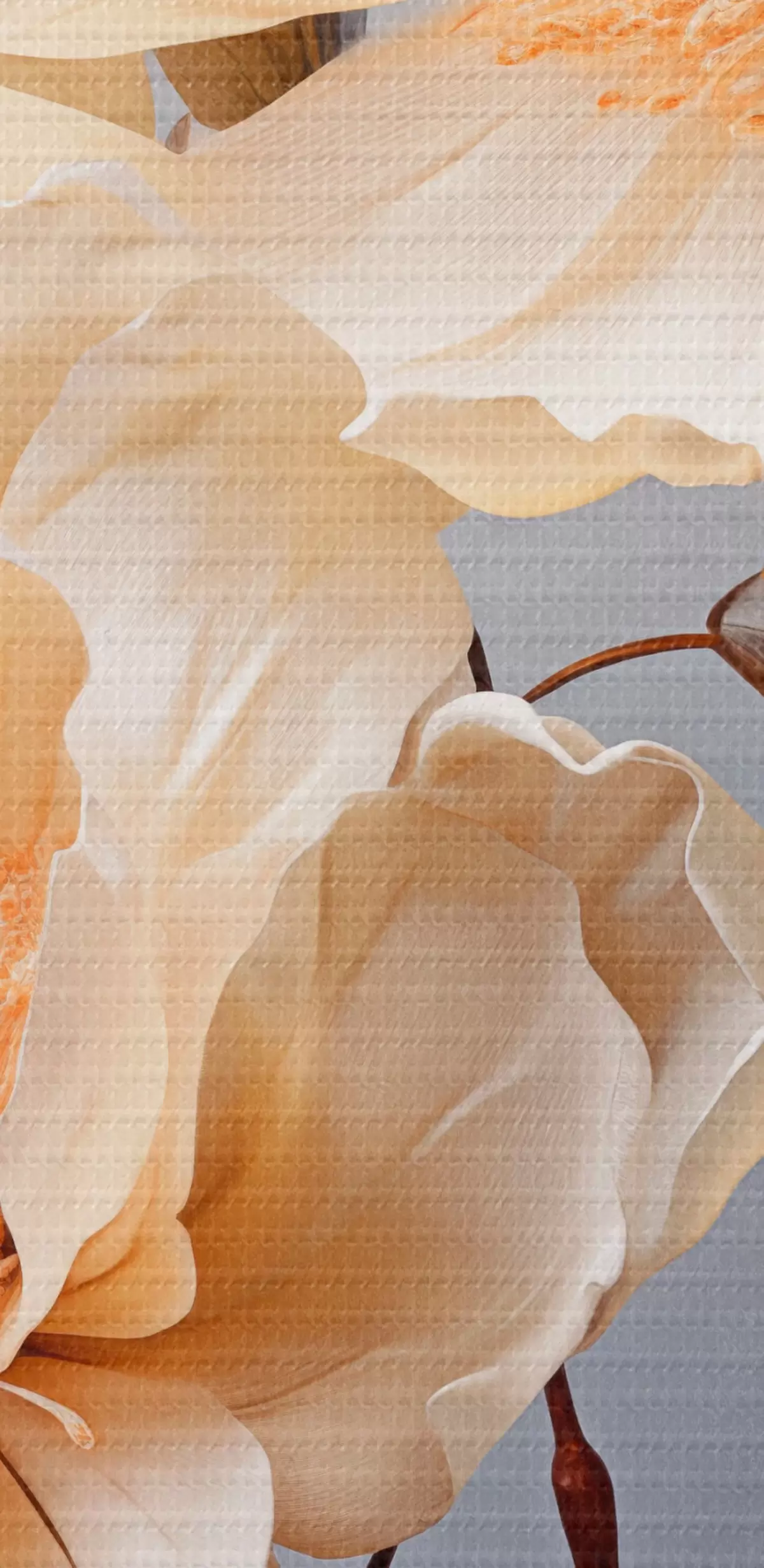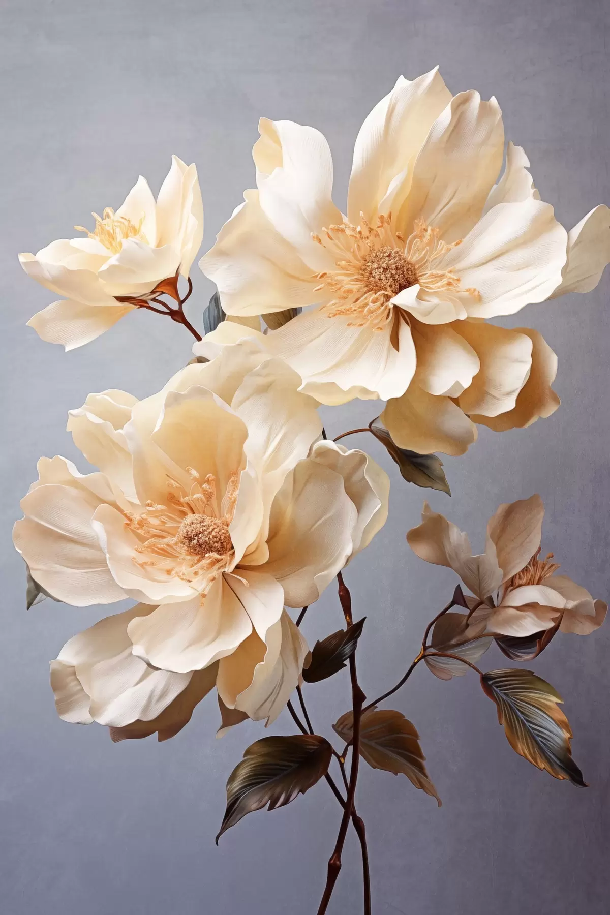 Picture Textured flowers with orange pistils and orange leaves on gray background, soft light, elegant, detailed, realistic Nr s45182