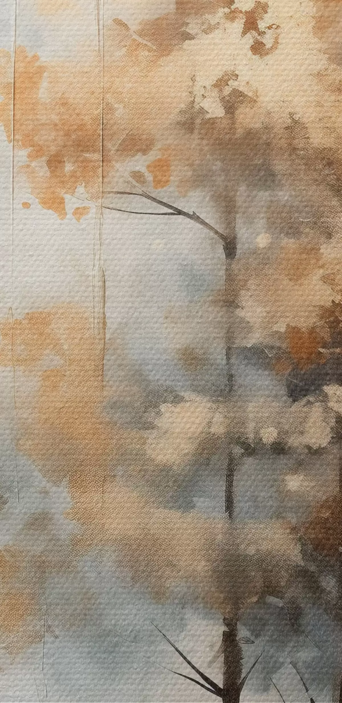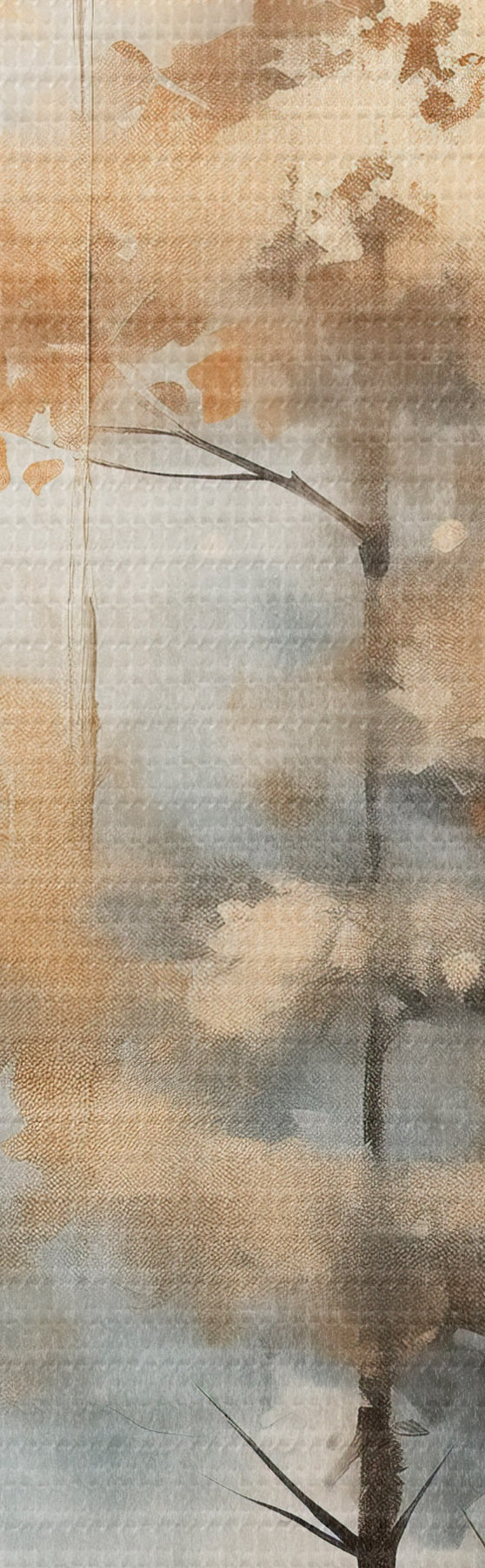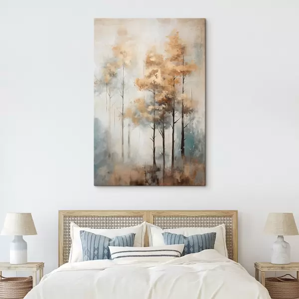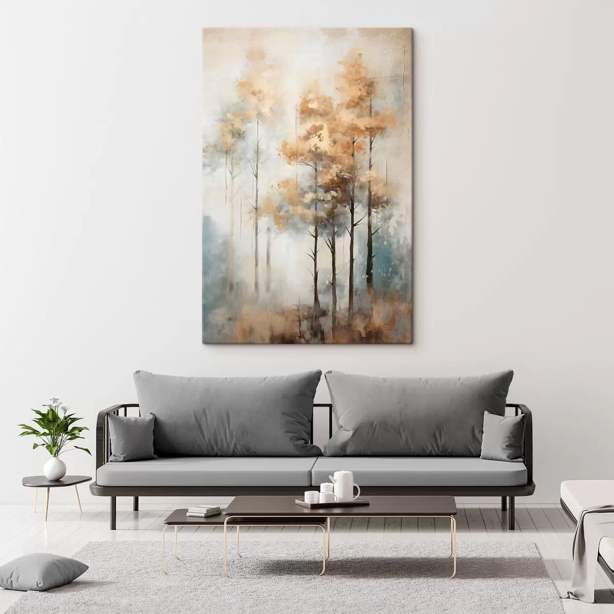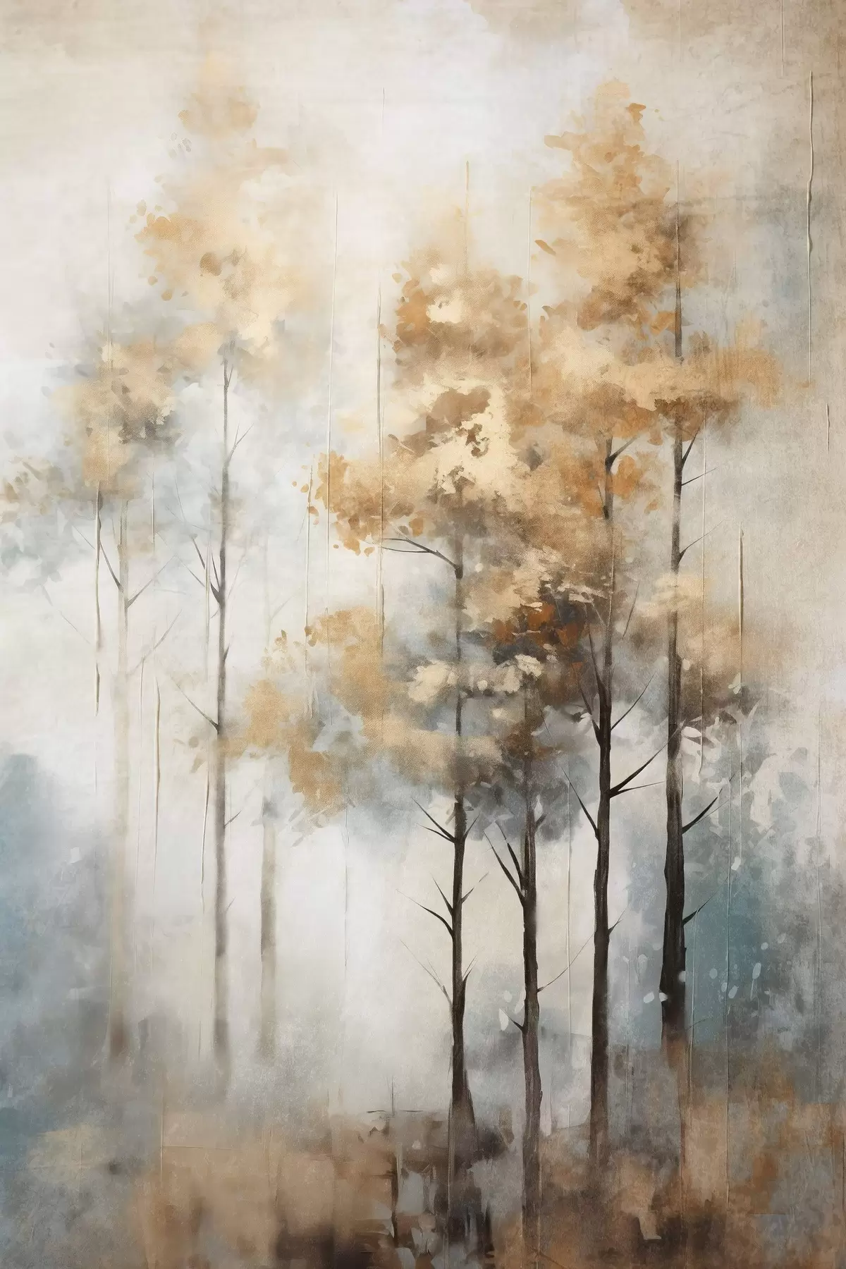 Picture Textured tall trees with yellow leaves in a forest , the background is a mix of soft blue and brown tones Nr s45187