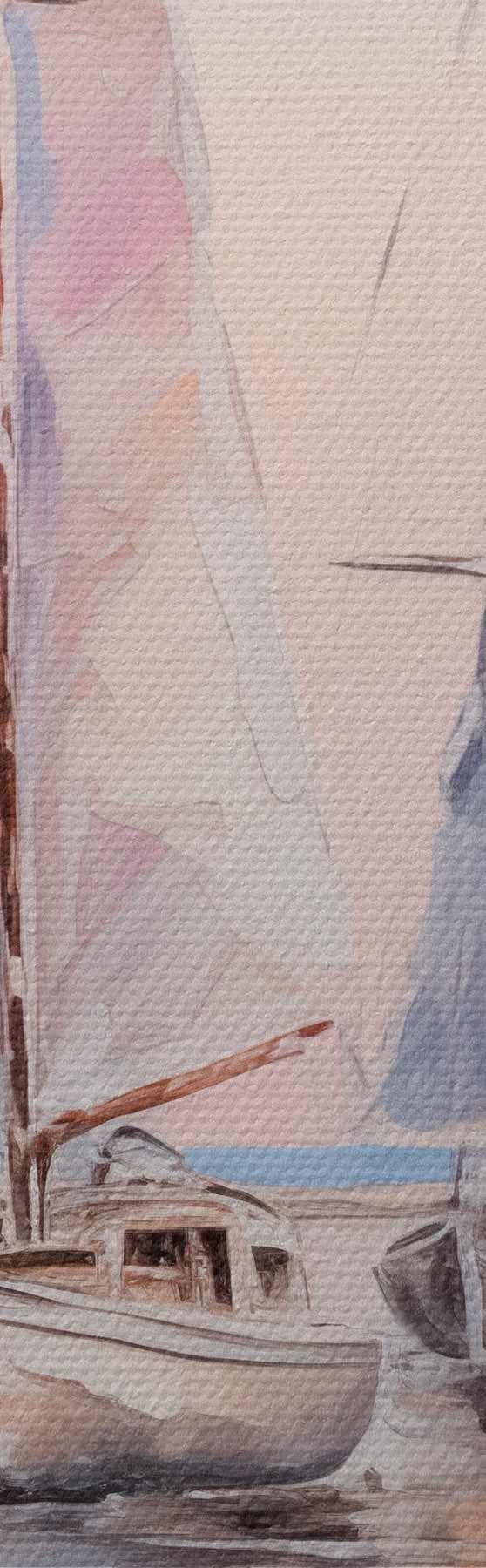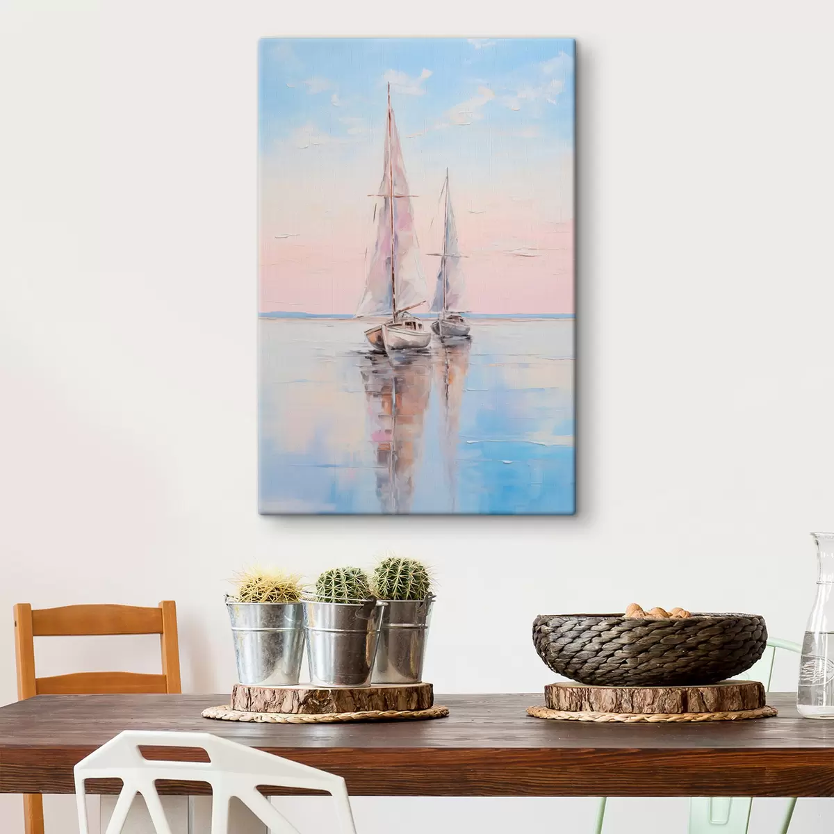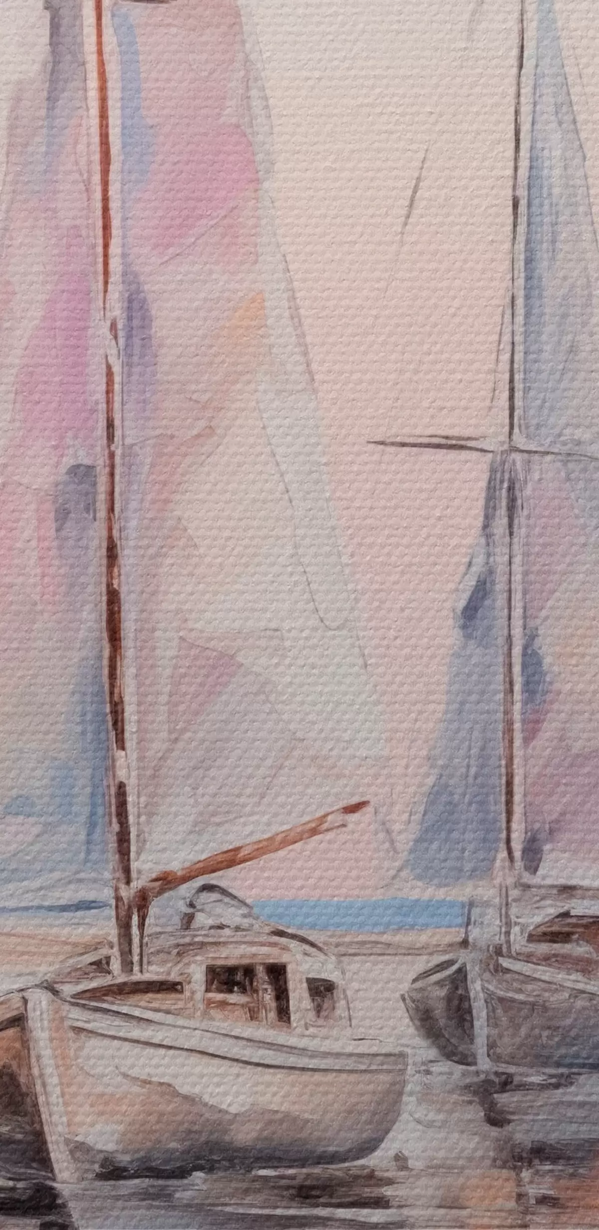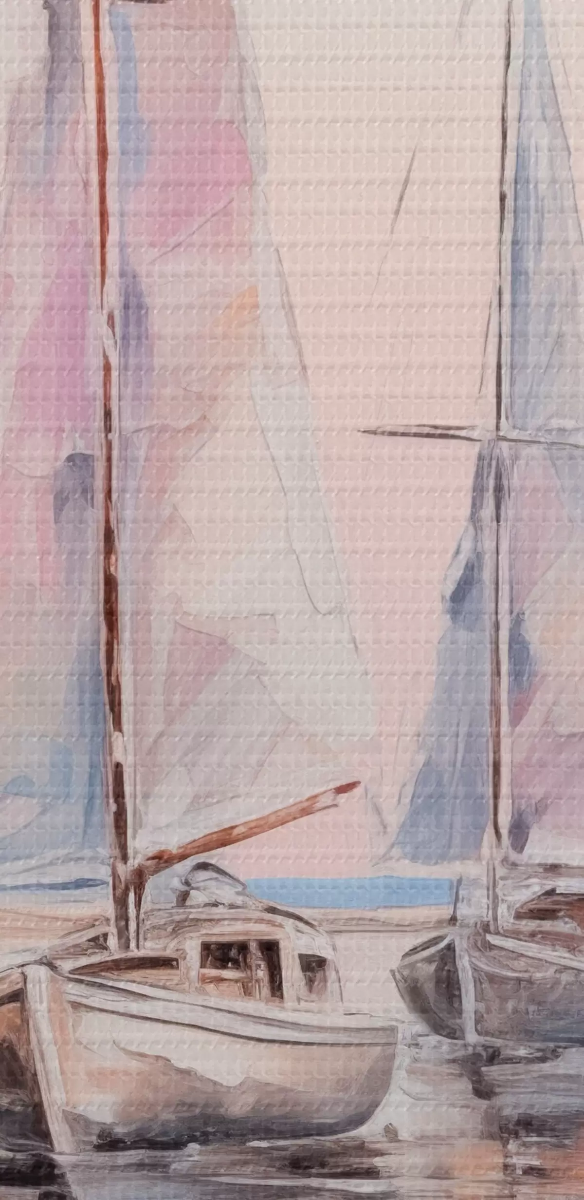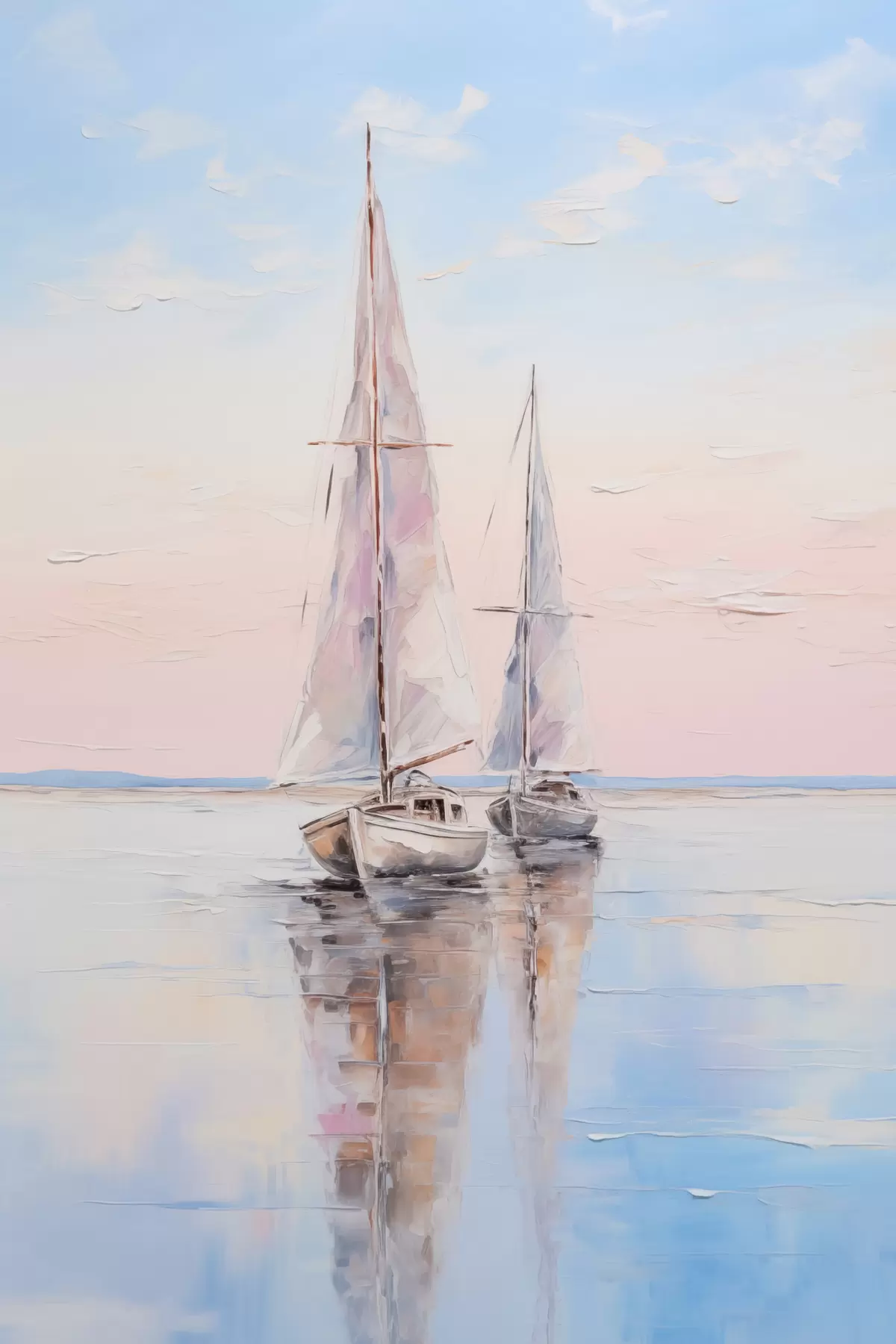 Picture Sailboats with pink sails floating on a calm sea, reflections of the boats in the water, soft pastel colors Nr s45558
