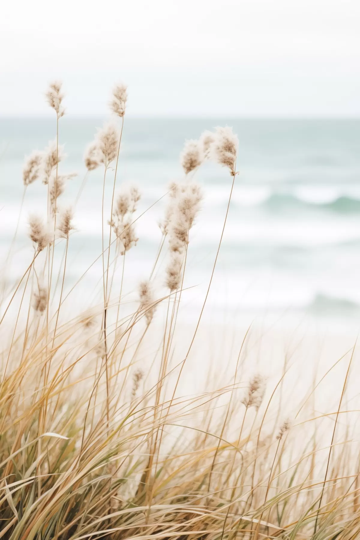 Picture Tall grass with fluffy seed heads, sandy beach and ocean waves in the background, soft and muted color palette Nr s45561