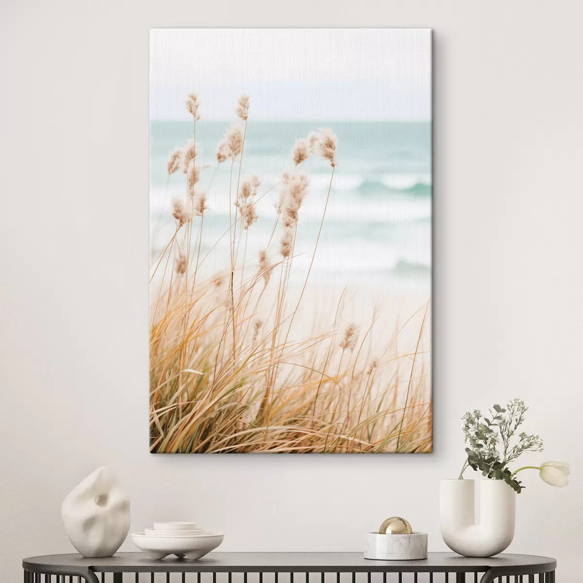 wall murals Tall grass with fluffy seed heads, sandy beach and ocean waves in the background, soft and muted color palette s45561