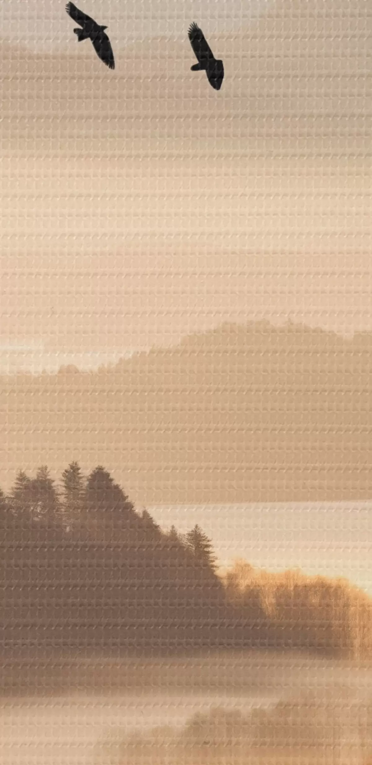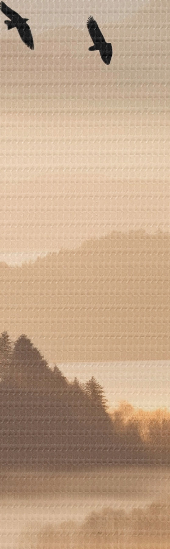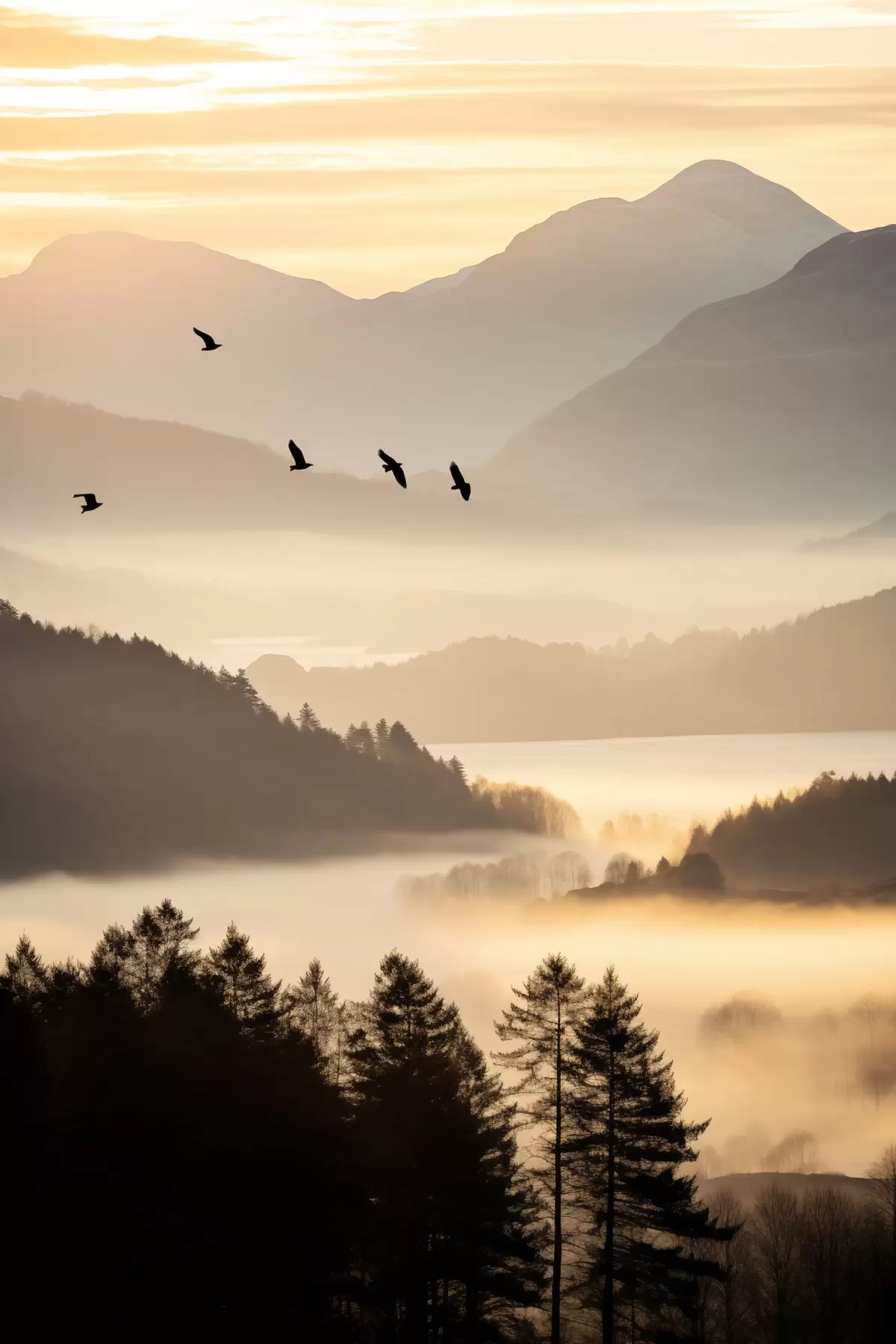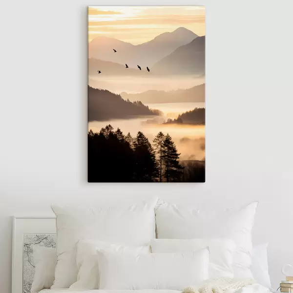 Picture A mountain landscape with a forest and birds flying in the sky , all covered in a thick layer of fog during sunrise Nr s45564