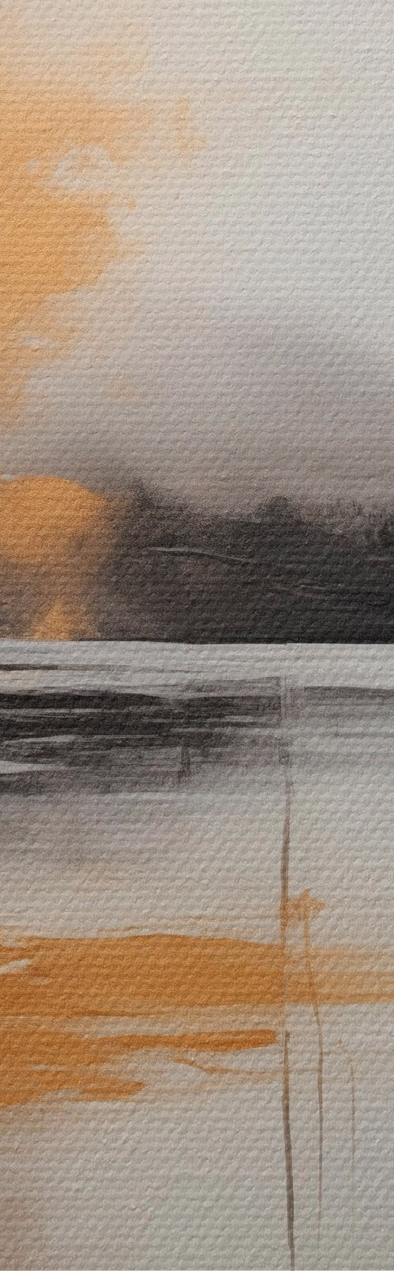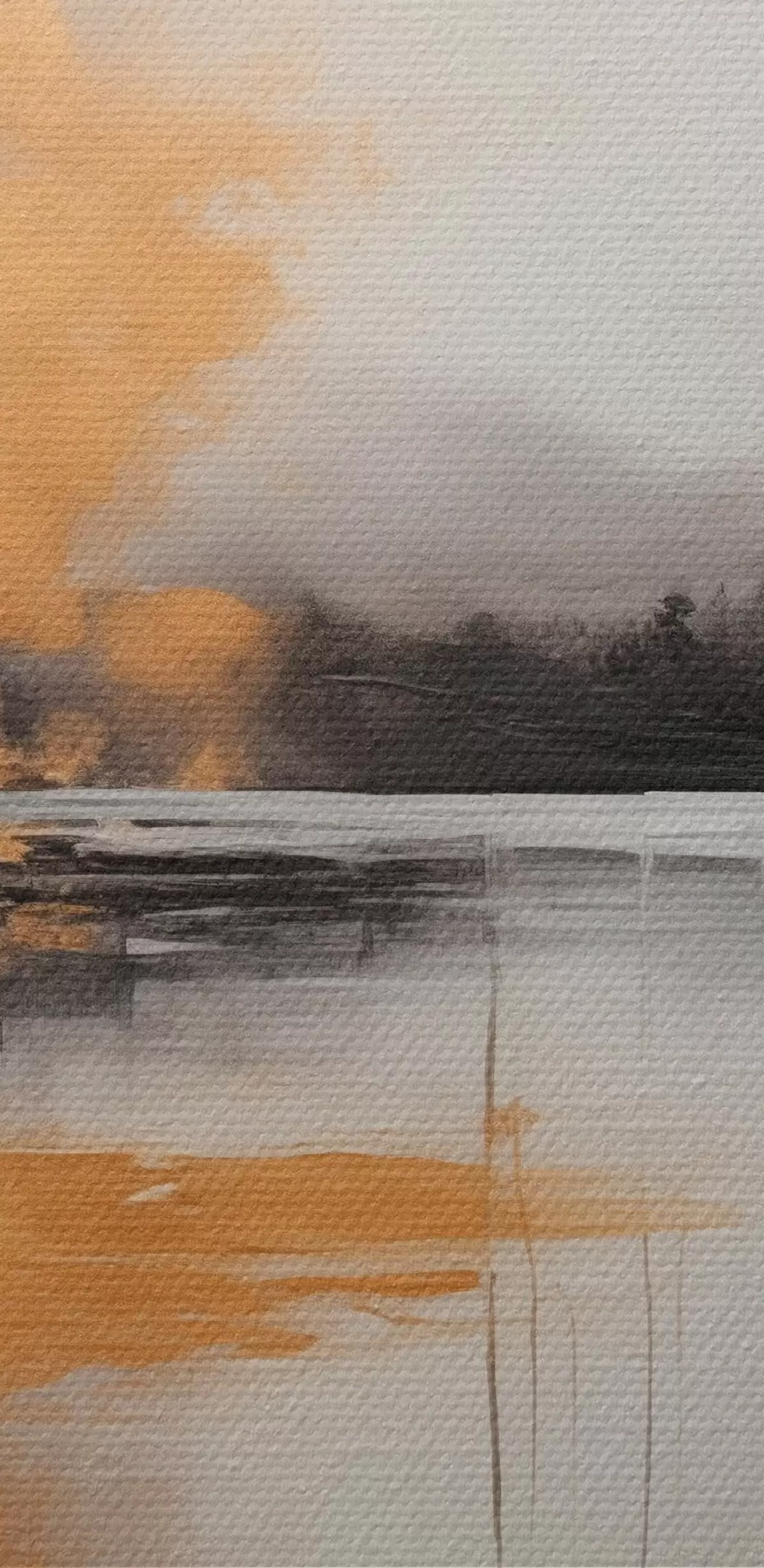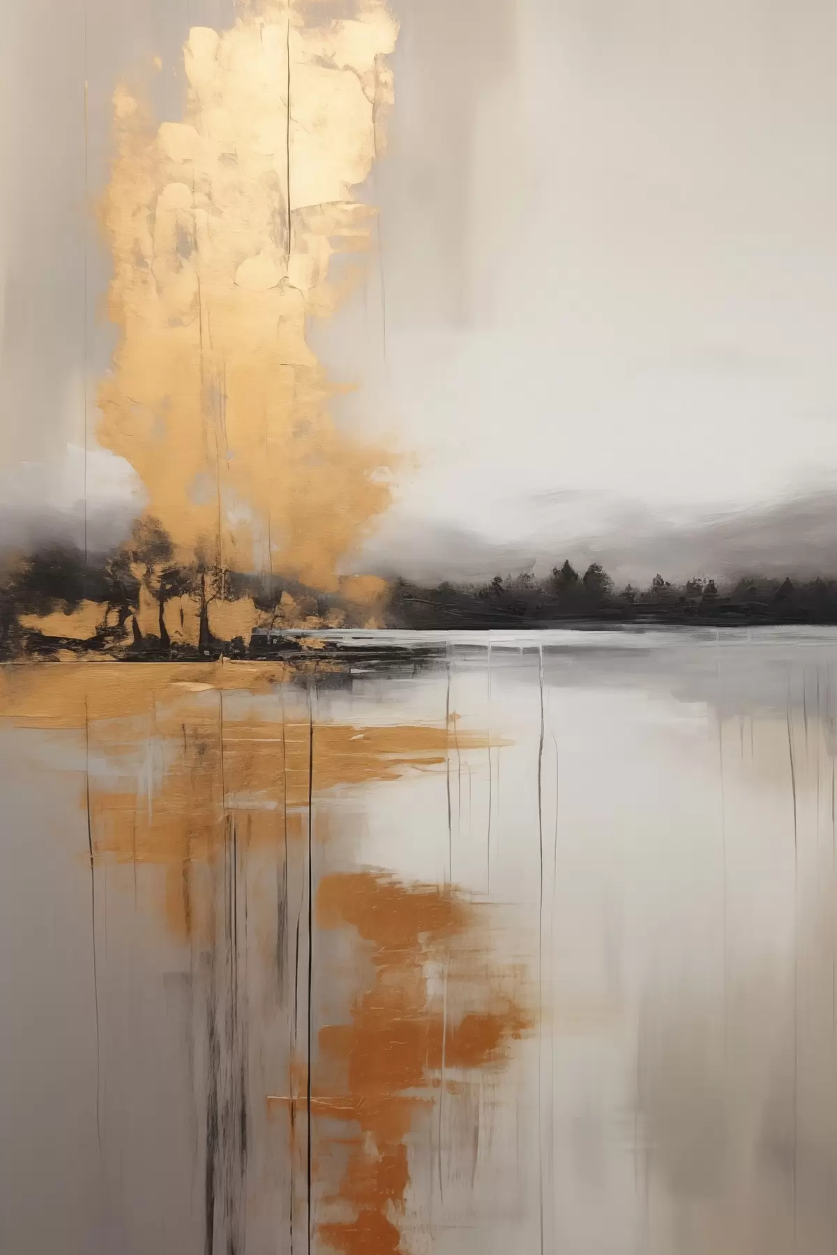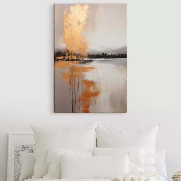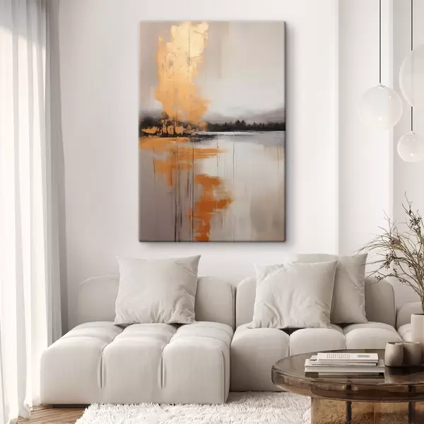 Picture An abstract landscape with a lake, tree and yellow fog , the water reflects and cloudy sky Nr s45575